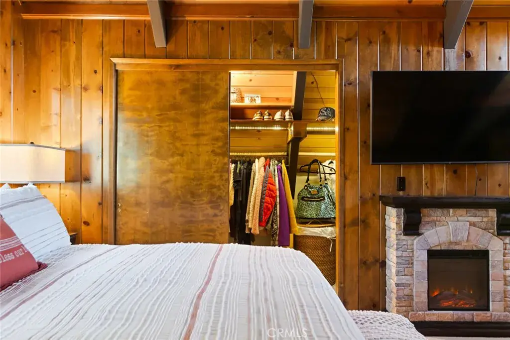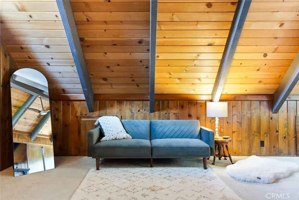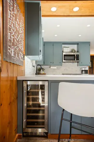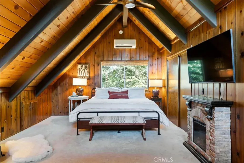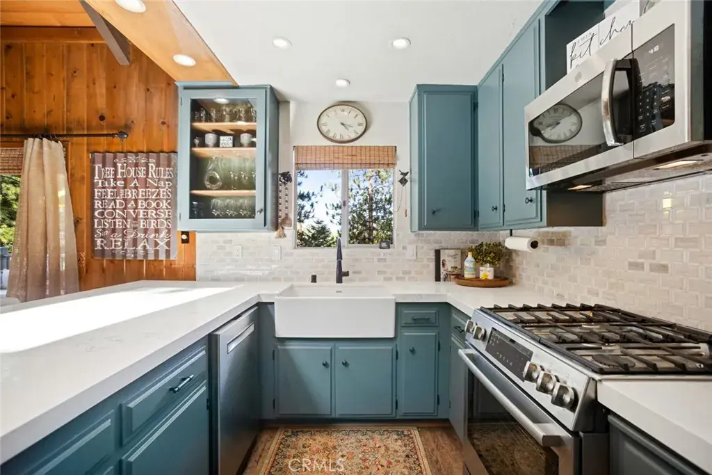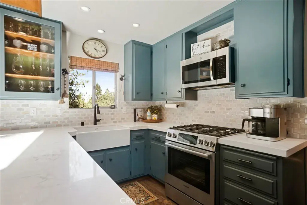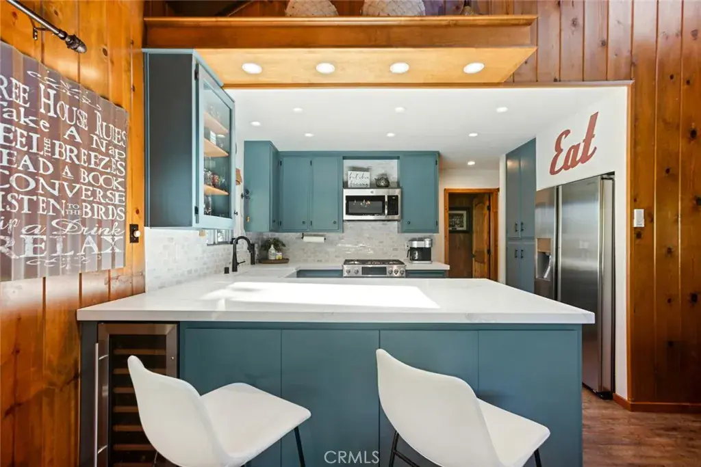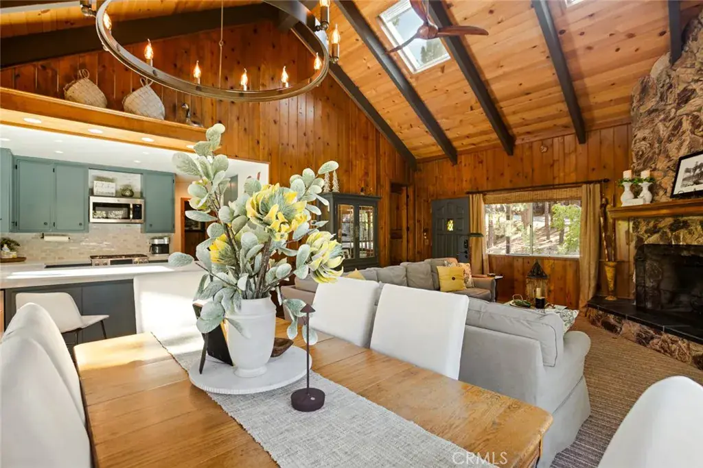 Inside, the living room features vaulted tongue-and-groove ceilings with skylights that fill the space with natural light, along with a classic rock fireplace that adds warmth and timeless mountain character. The open layout flows into a modern, open-concept kitchen with quartz countertops, farmhouse sink, built-in wine cooler, sparkling backsplash, and black hardware for a clean, updated finish.