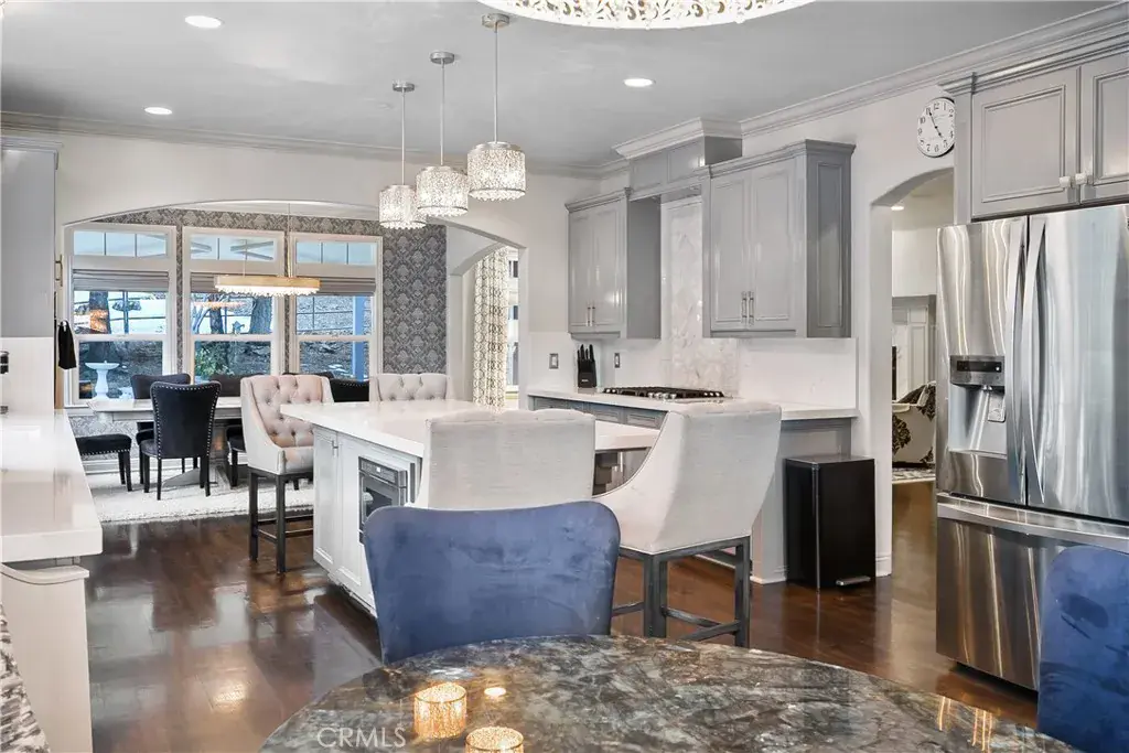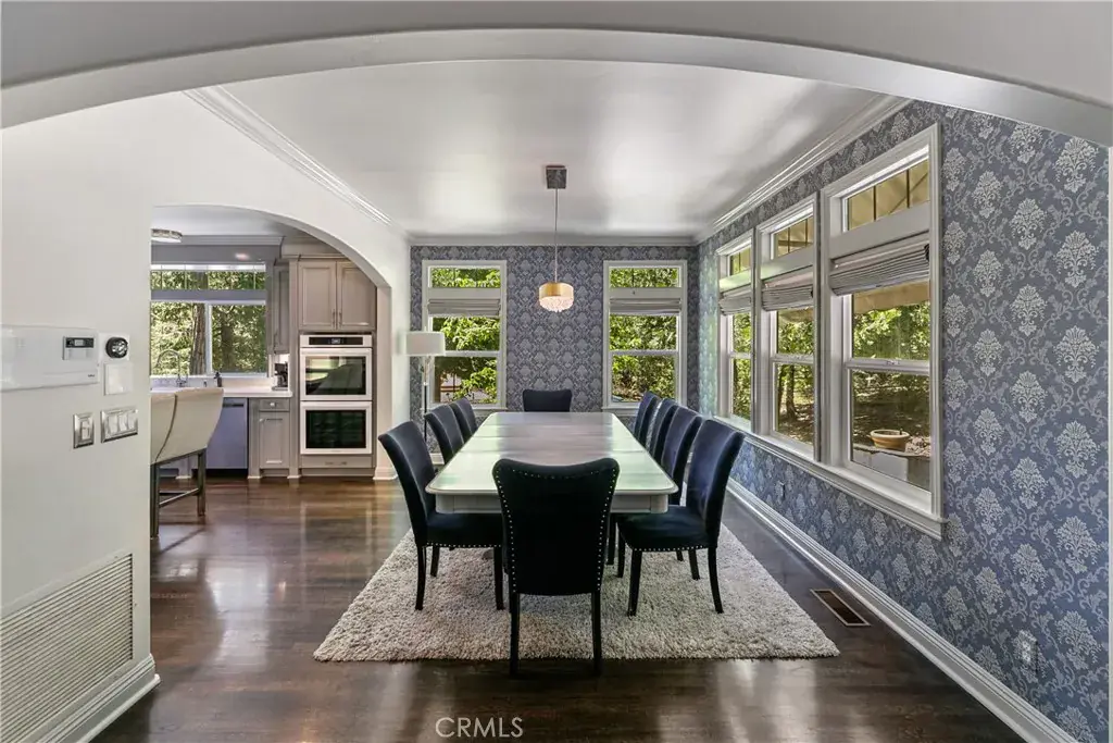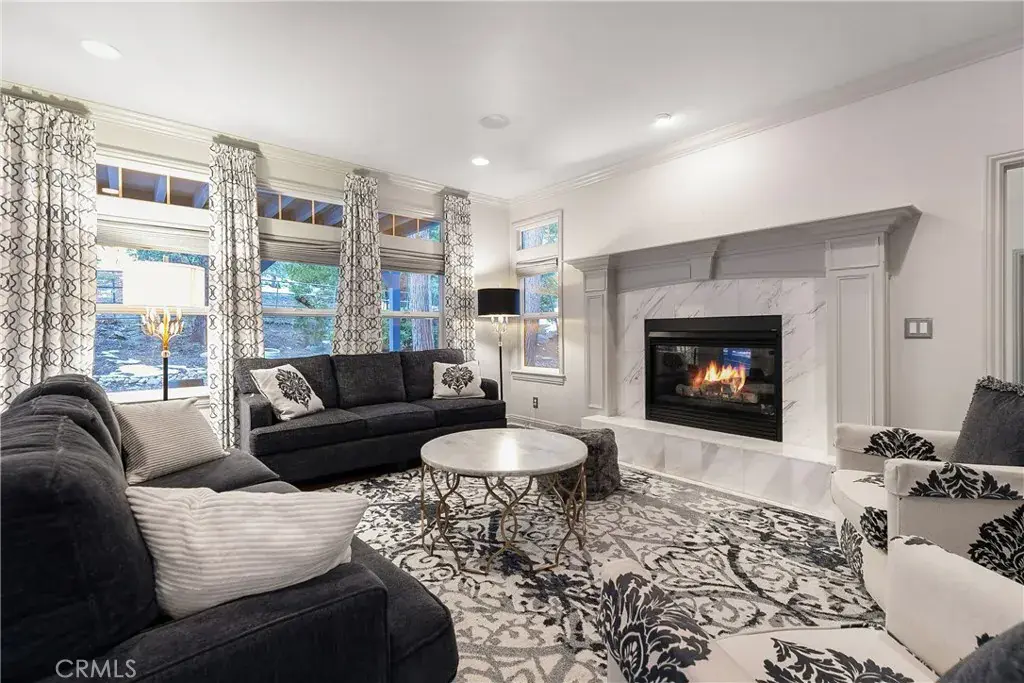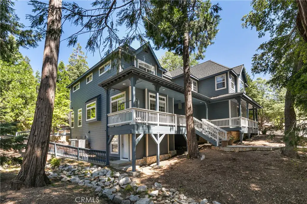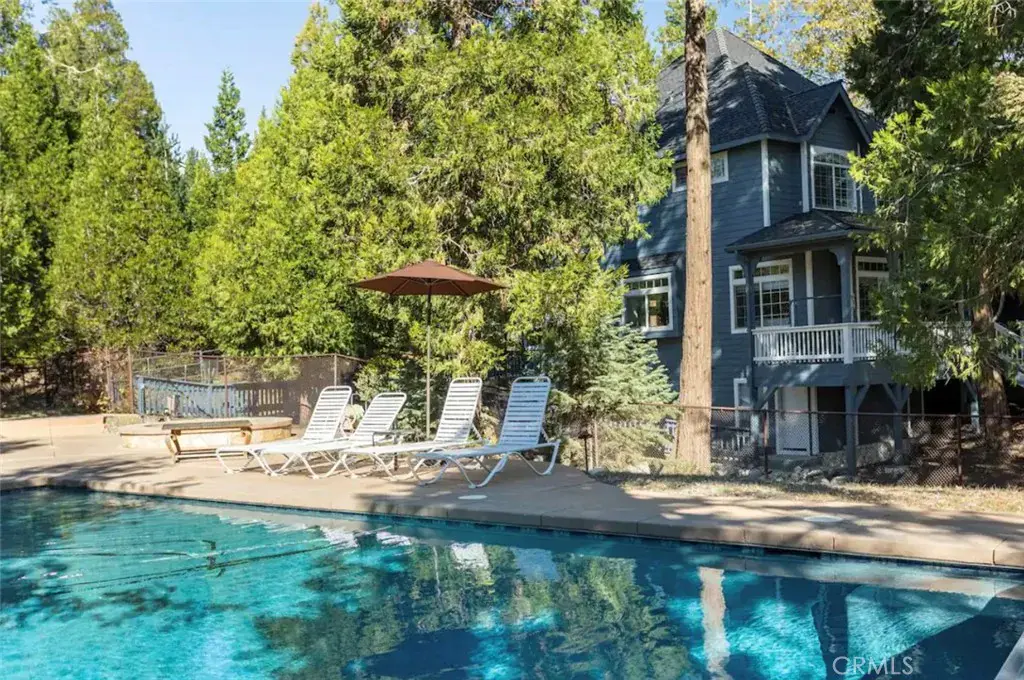 Designer Home in Arrowhead Woods with Outdoor Pool & Spa! Yes this home has lake rights! This gorgeous home is located in the Summit area of Lake Arrowhead on 1/2 acre of land. Seller also owns additional 1/2 acre adjacent to property & is available for extra money. One of the few areas of Lake Arrowhead with underground utilities. This home has only had two owners. Whole house remodel in 2017. Level entry home with long driveway & plenty of street parking for hosting a party or bbq. Foyer has two story ceiling with sparkling chandelier & one of a kind wrought iron railing wrapped around staircase. Tiger-sawn hardwood floors with an ebony finish carries throughout living areas on main level. There are two spacious living areas with large windows over looking expanding forest & cozy fireplace. Either area can flip flop as living room or dining room depending on buyers taste. Impeccable kitchen that would impress any gourmet chef. Kitchen has designer blue painted cabinets with quartz countertops & one of a kind backsplash mural behind stove. Oversized island that can also serve as a table for casual dining. The bar area & built in breakfast booth is the perfect spot to enjoy coffee or a cocktail. Bar countertop and booth Table-Top is made from rare Brazilian “Aphrodite” Granite, both cut from the same slab. The outdoor space feels like a luxury resort. Deck overlooks spacious land with no neighbor insight. Custom stone outdoor fireplace with large seating area nearby outdoor pool & spa. Pool was built in 2009, completely re-plastered and re-tiled 5/2021 with “Pebble Tech” Finish, decorated with iridescent abalone shell and blue/green elements, beautiful! Electrically operated retractable pool cover, keeps water temperature 82-85 degrees in the summer with only sunlight to heat it. The programmable pool/spa heater is capable of keeping the pool at any temperature you like, all year-round. Bedroom with en suite located on main level along with laundry room & 3 car garage. Upstairs has a huge family room that previously had enough space for a pool table. Perfect spot for movie night. Primary bedroom suite with vestibule entry, seating area with fireplace, gigantic windows overlooking lush forest, huge walk in closet & chic bathroom with designer finishes. The three additional bedrooms on this floor are large & can fit any size bed. The build up has a large 15’x19’ section with an 8 foot ceiling. Smart features, 6 zone heating & AC!