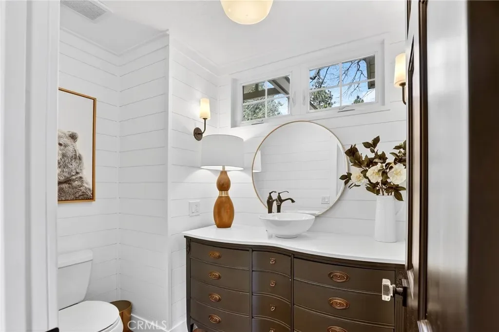 Custom craftsmanship shines throughout, with both fireplace mantels, the kitchen island, and a downstairs steel and walnut vanity all designed to complement the home’s refined style.