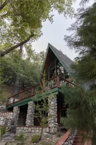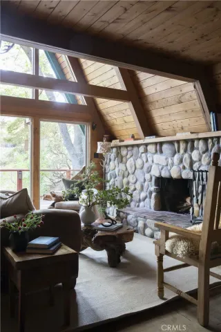 Step inside the main A-frame and experience a true mountain lodge. Rustic wood paneling, walls of glass, exposed beams, and stone accents bring the outdoors in. The home offers three bedrooms, two baths, decks on both sides, and a jacuzzi with a peek of the lake, ideal for peaceful mountain evenings.
