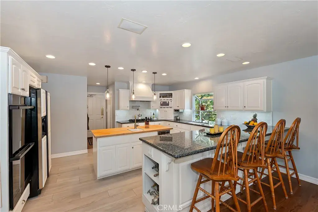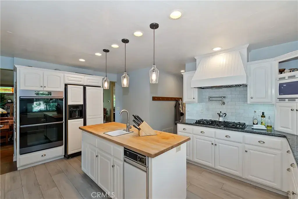• Chef’s Kitchen: Granite counters, butcher block island, pot filler, garden window, pendant and recessed lighting, plus huge walk-in pantry.