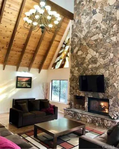 Living Room space with 20ft+ ceiling and open beams including Large Fireplace.