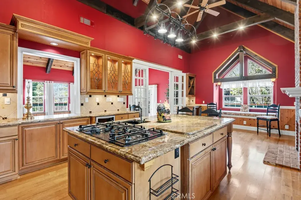 Welcome to this exceptional custom-built West Shore home with Lake Rights. Located a short distance from Tavern Bay Beach Club, this property pairs mountain elegance with a large, level lot, heated 2-car garage, and additional parking, including space for a boat or RV. Designed for both entertaining and everyday comfort, the home features a whole-house music system and a show-stopping chef’s kitchen equipped with a built-in refrigerator, two wine refrigerators, a 5-burner cooktop, double ovens, a large island, two sinks, and a convenient office nook. Warm architectural details shine throughout, including vaulted beamed ceilings, bay windows with seating, rich pine wainscoting, and French doors that open to inviting decks. Four fireplaces add charm and ambiance, while outdoor living is elevated with a built-in jacuzzi and tranquil pond water feature. The incredible primary suite is a true retreat, offering custom built-ins, a dual-sided fireplace, private deck access, and a spa-inspired en suite bath with dual vanities, soaking tub, tiled shower, and walk-in closet. A rare opportunity to own a spacious, amenity-rich Lake Arrowhead home in a premier West Shore location near the lake, beach club, and year-round recreation.