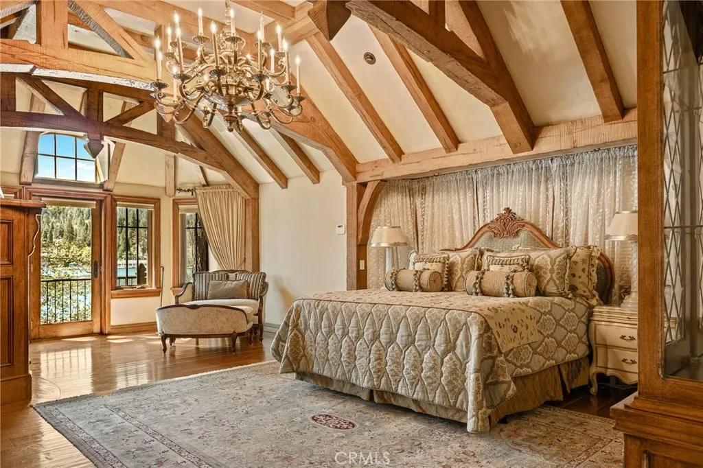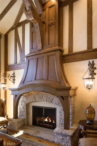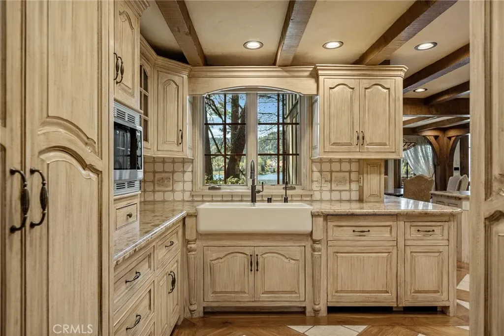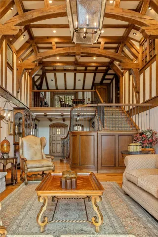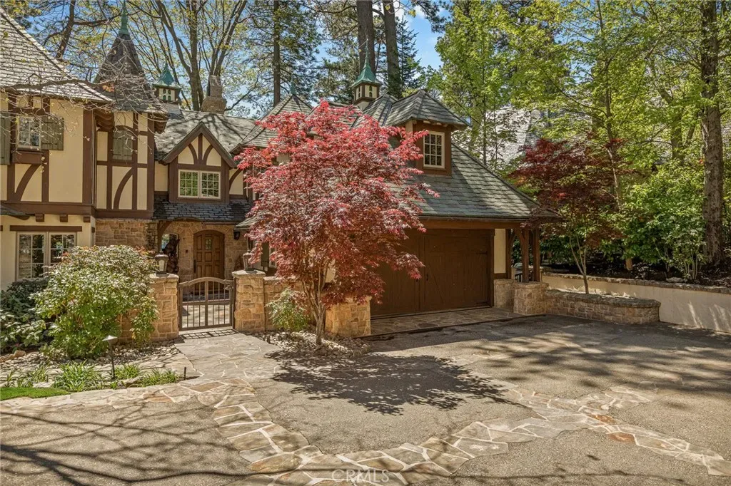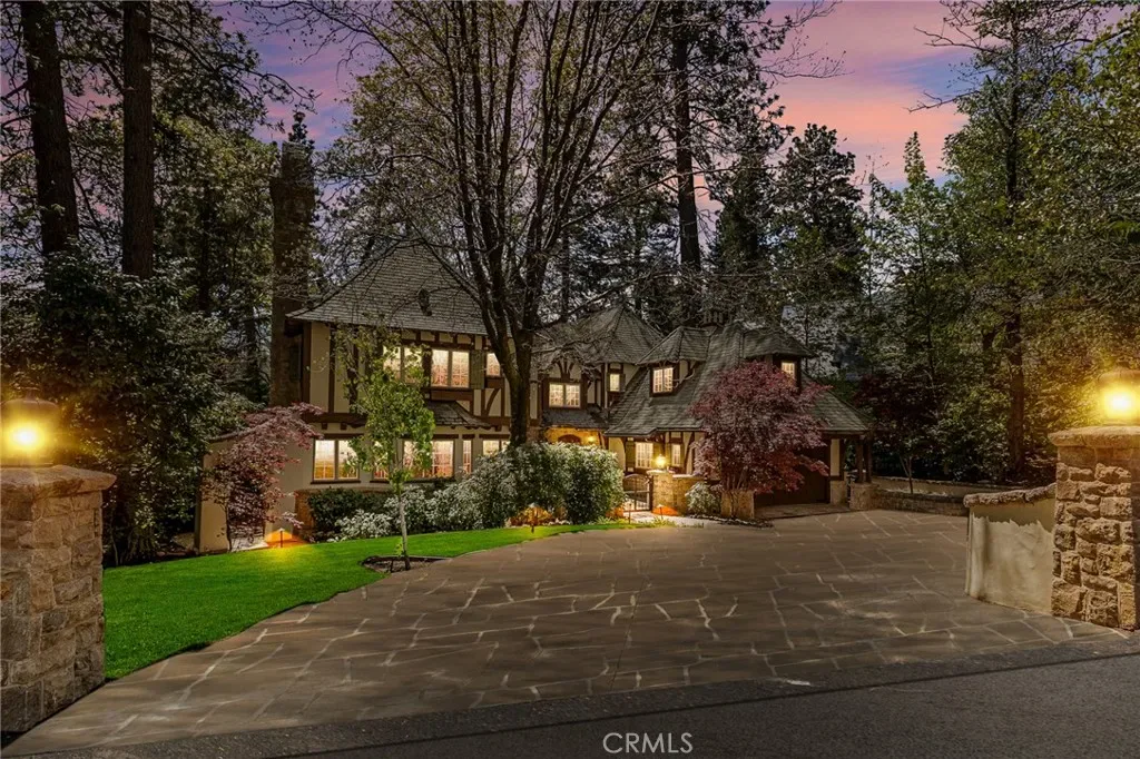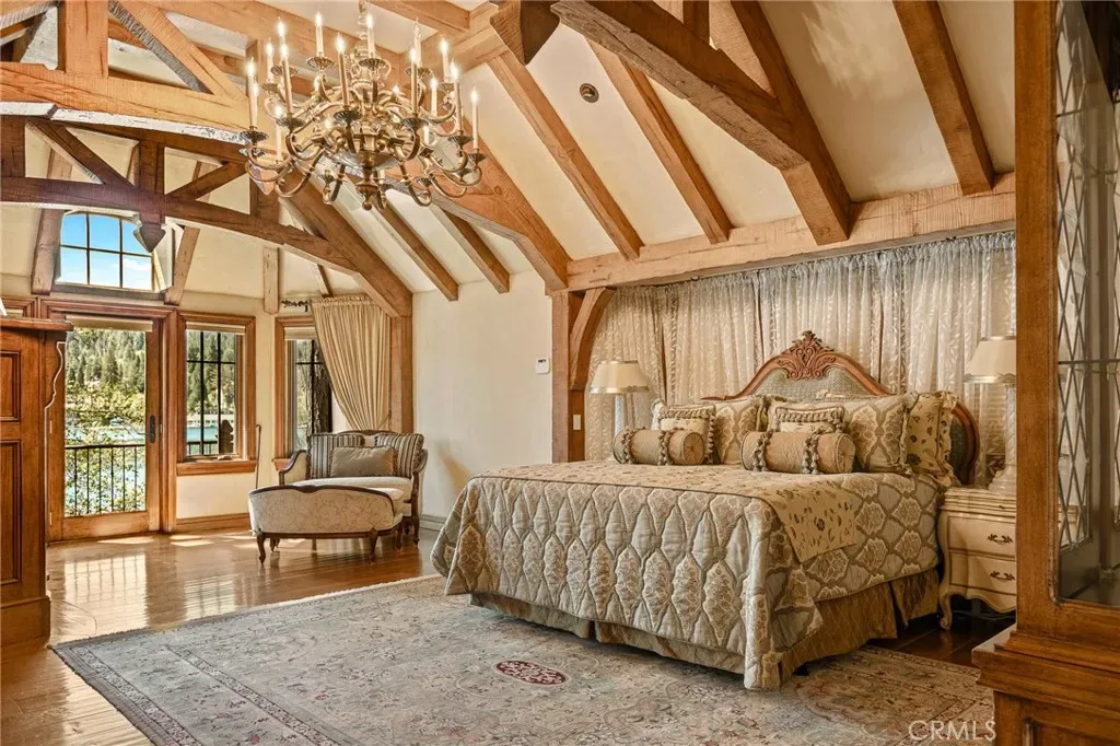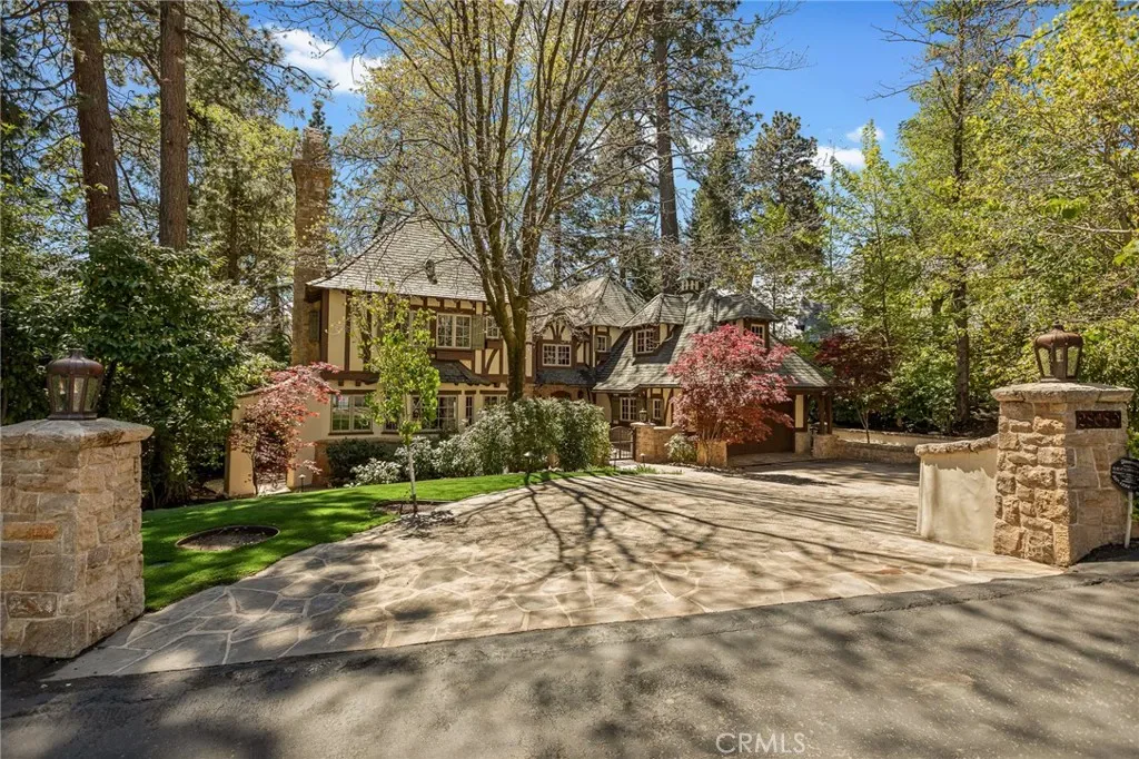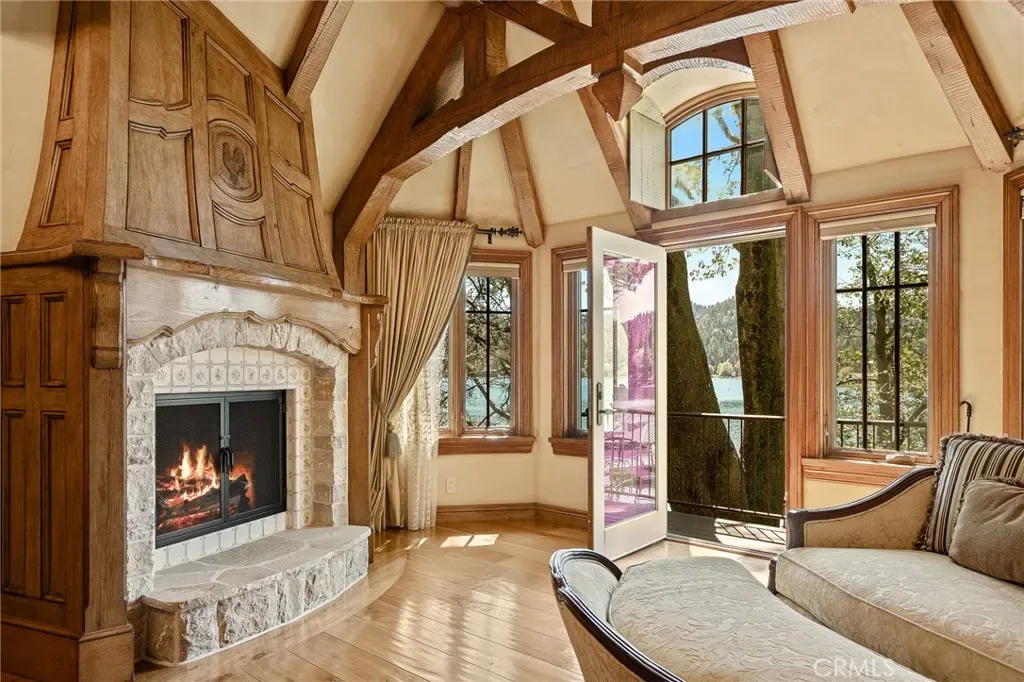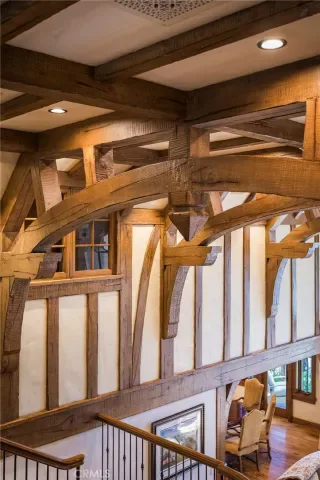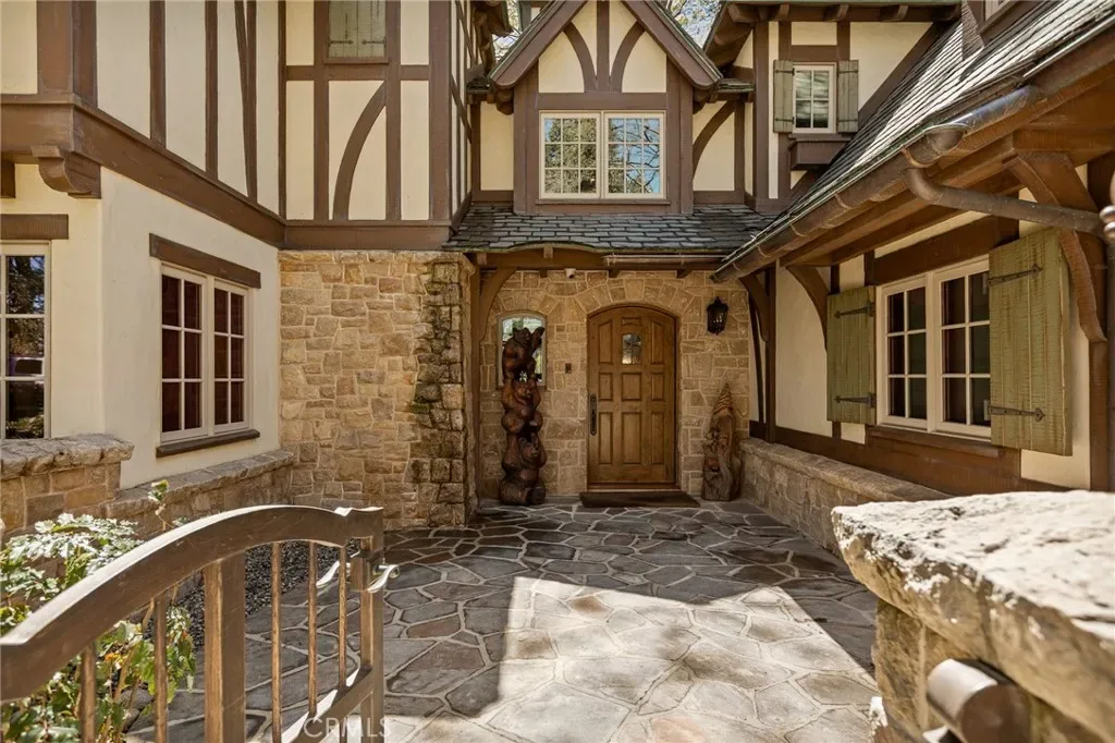 Positioned behind the gated entry of the prestigious Point Hamiltair community, with a dramatic stone approach and directly across from the Lake Arrowhead Village, the home unfolds with a true sense of arrival—reminiscent of a Cotswolds manor. Inside, exposed timber beams, hand-chiseled woodwork, custom wrought iron, and layered artisan finishes create a warm, richly detailed interior.