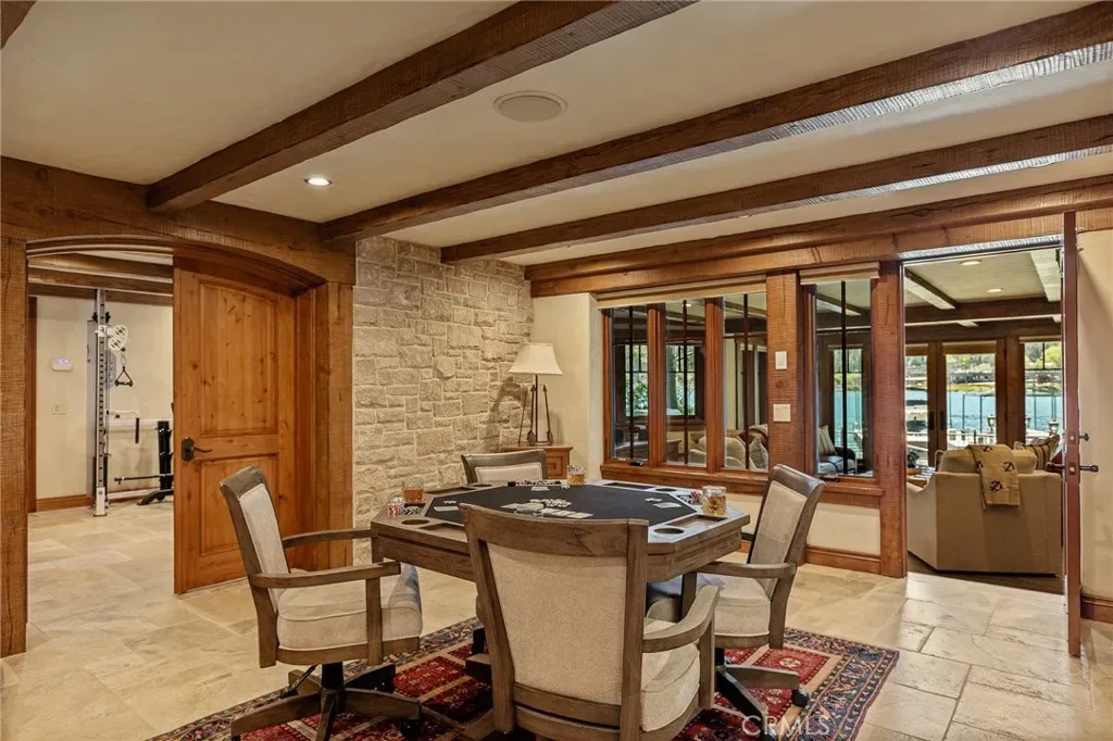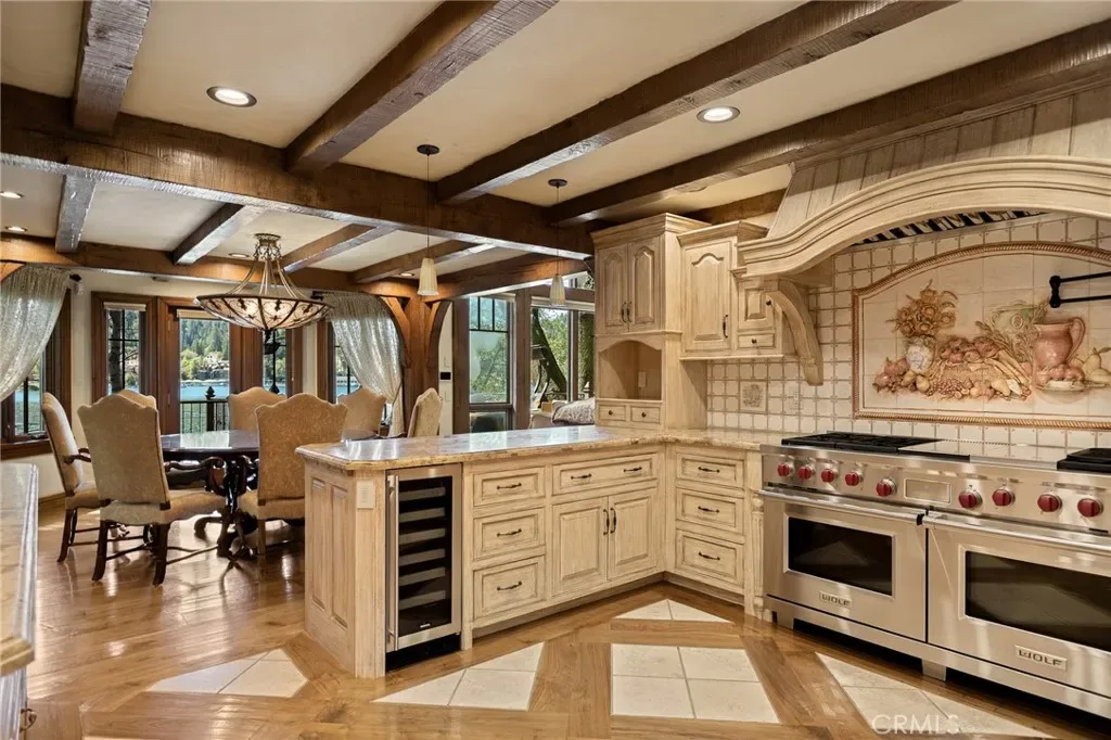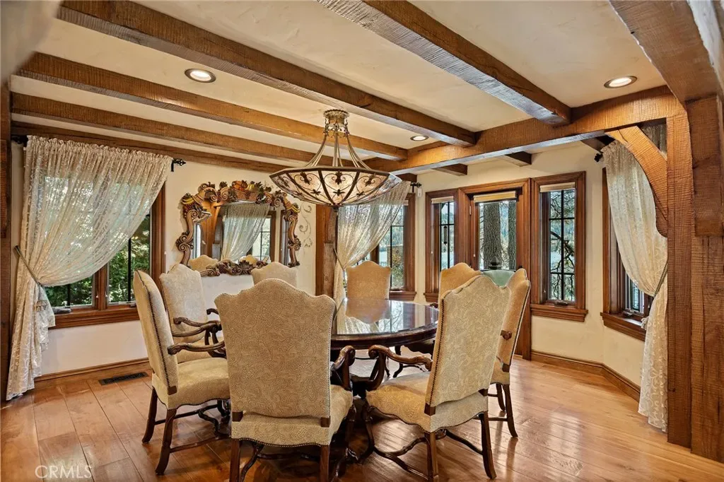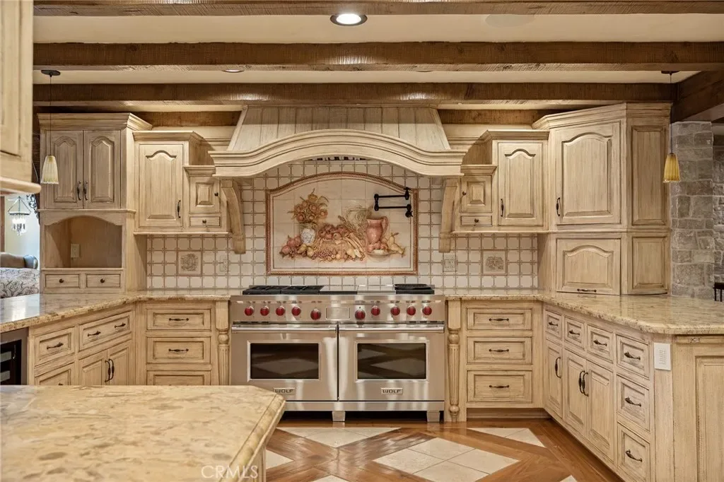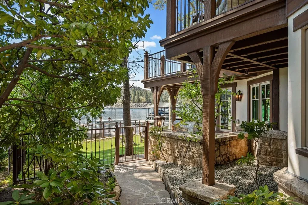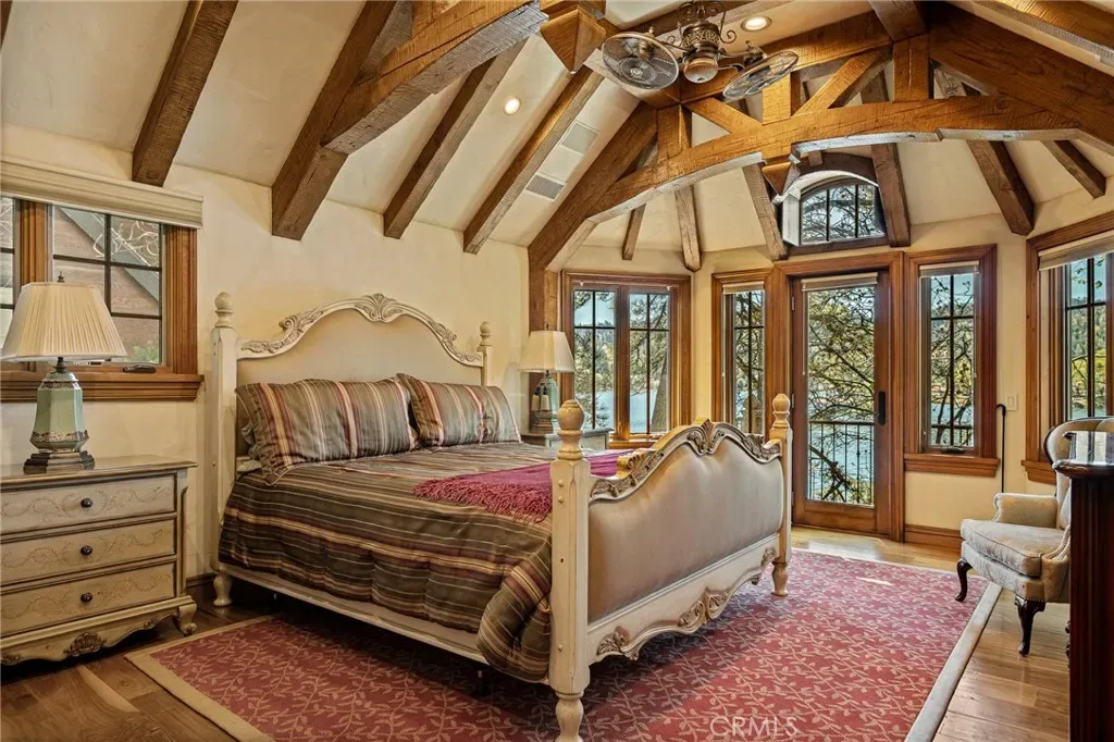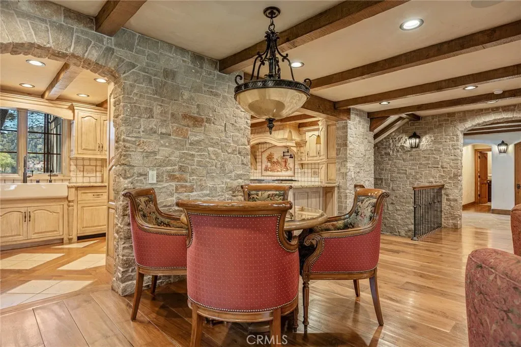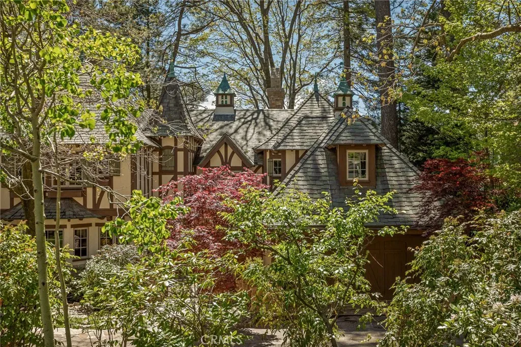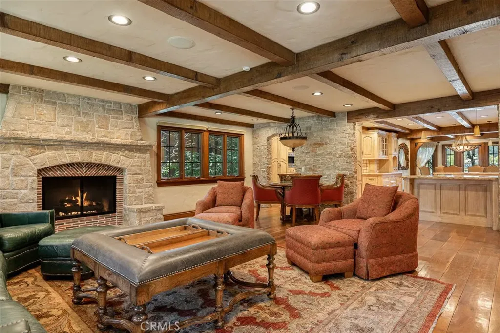 Positioned behind the gated entry of the prestigious Point Hamiltair community, with a dramatic stone approach and directly across from the Lake Arrowhead Village, the home unfolds with a true sense of arrival—reminiscent of a Cotswolds manor. Inside, exposed timber beams, hand-chiseled woodwork, custom wrought iron, and layered artisan finishes create a warm, richly detailed interior.