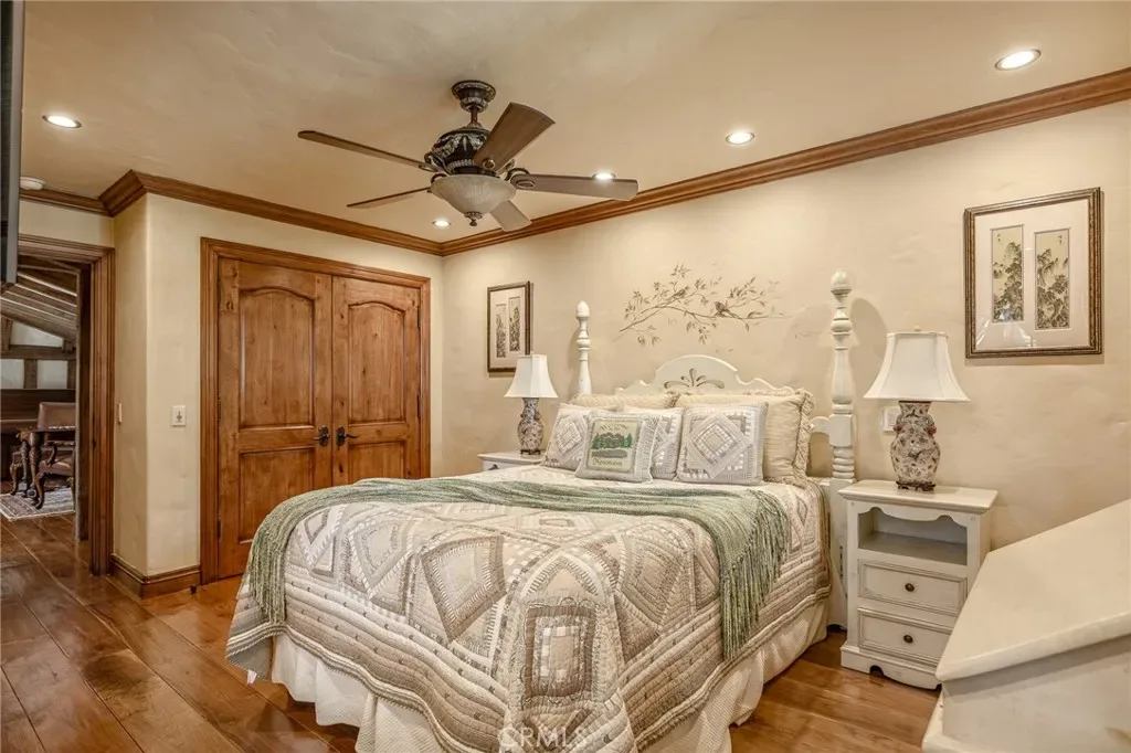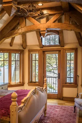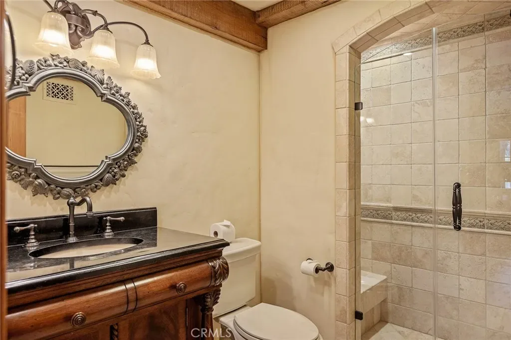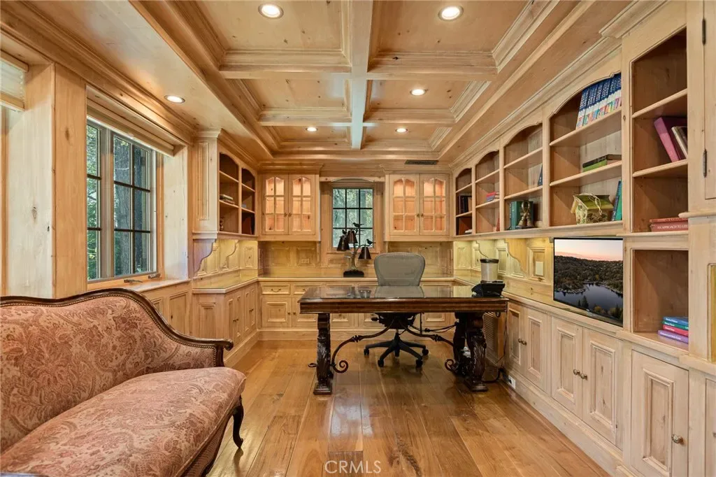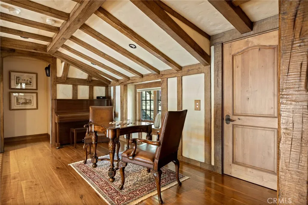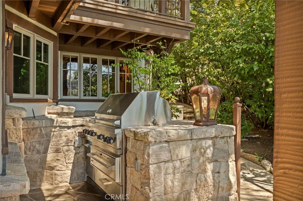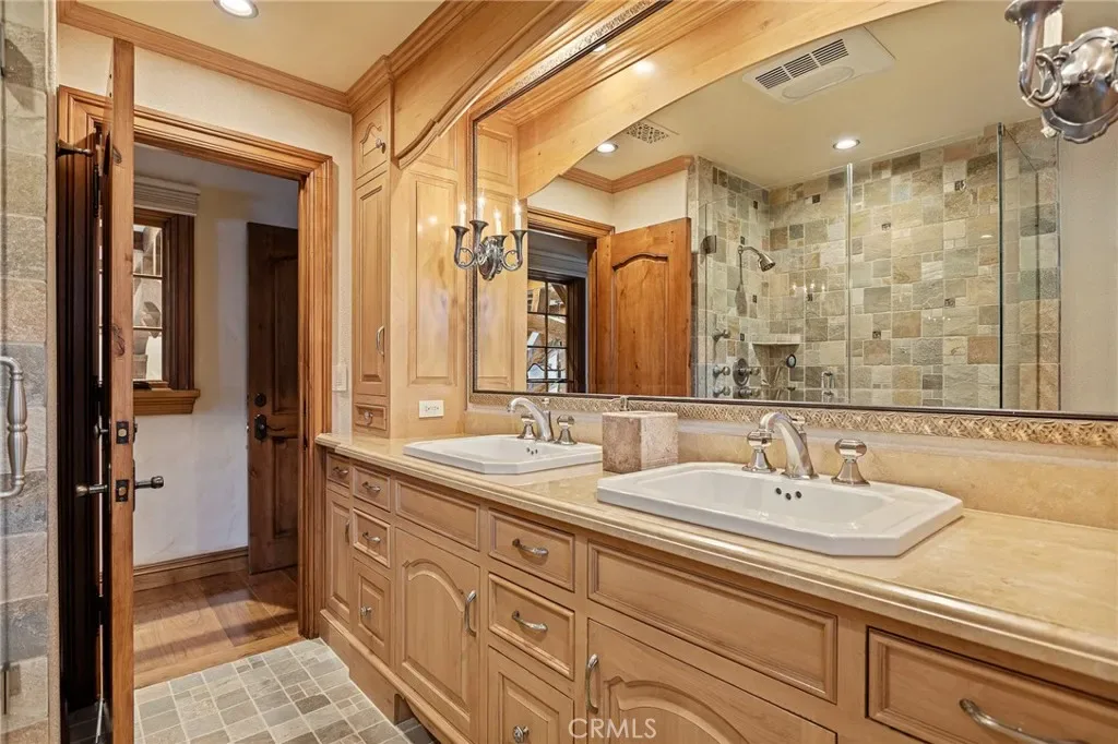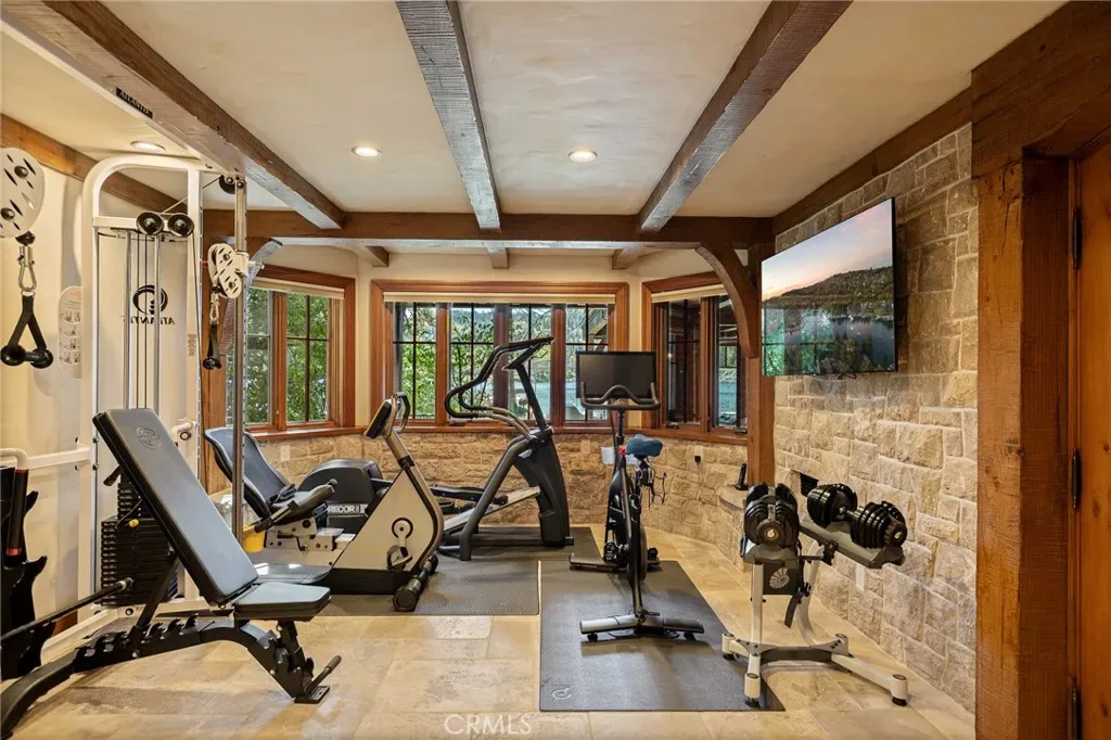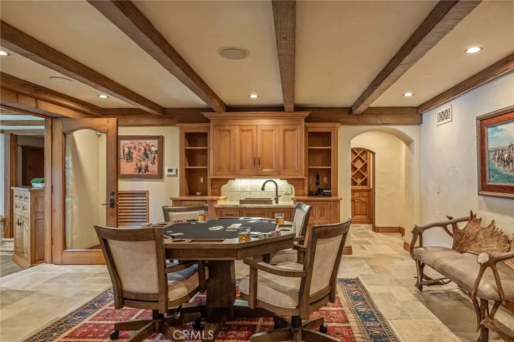 Positioned behind the gated entry of the prestigious Point Hamiltair community, with a dramatic stone approach and directly across from the Lake Arrowhead Village, the home unfolds with a true sense of arrival—reminiscent of a Cotswolds manor. Inside, exposed timber beams, hand-chiseled woodwork, custom wrought iron, and layered artisan finishes create a warm, richly detailed interior.