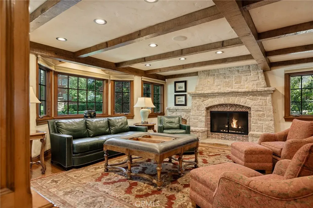 The residence has been extensively renovated and upgraded throughout. Custom cabinetry, handmade doors, and one-of-a-kind custom woodwork crafted on-site reflect a level of care and craftsmanship rarely seen. Fireplaces feature hand-painted tile by Nancy Grace, complemented by hand-carved mantels that anchor each living space.