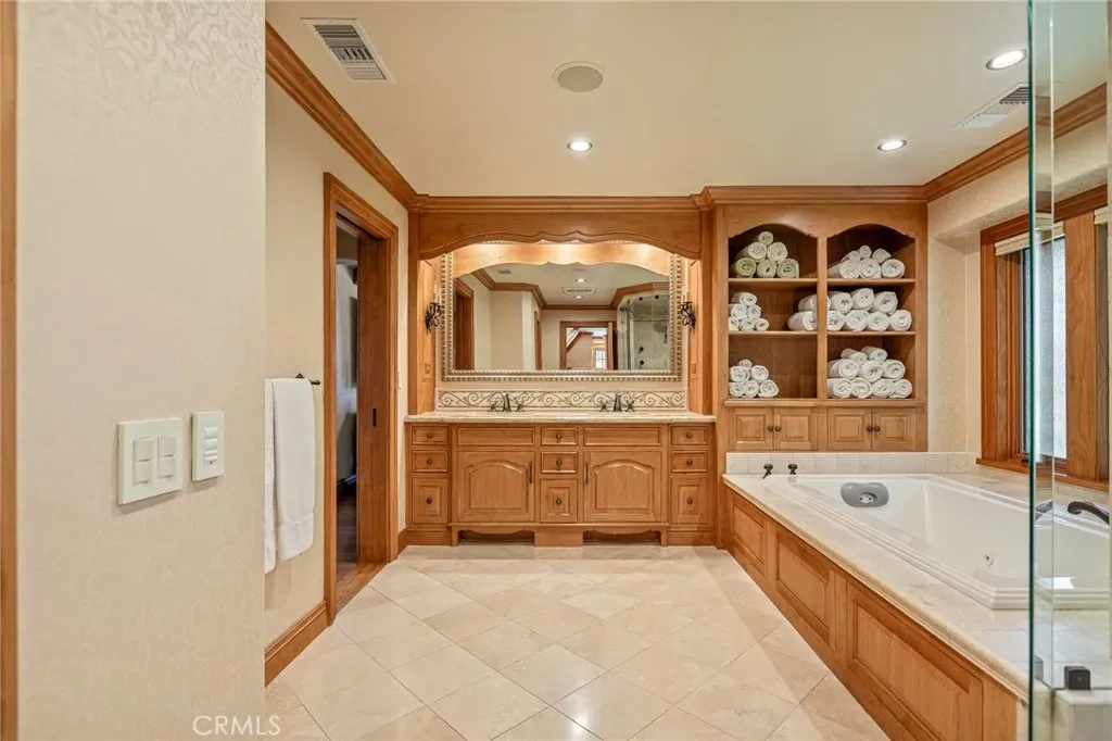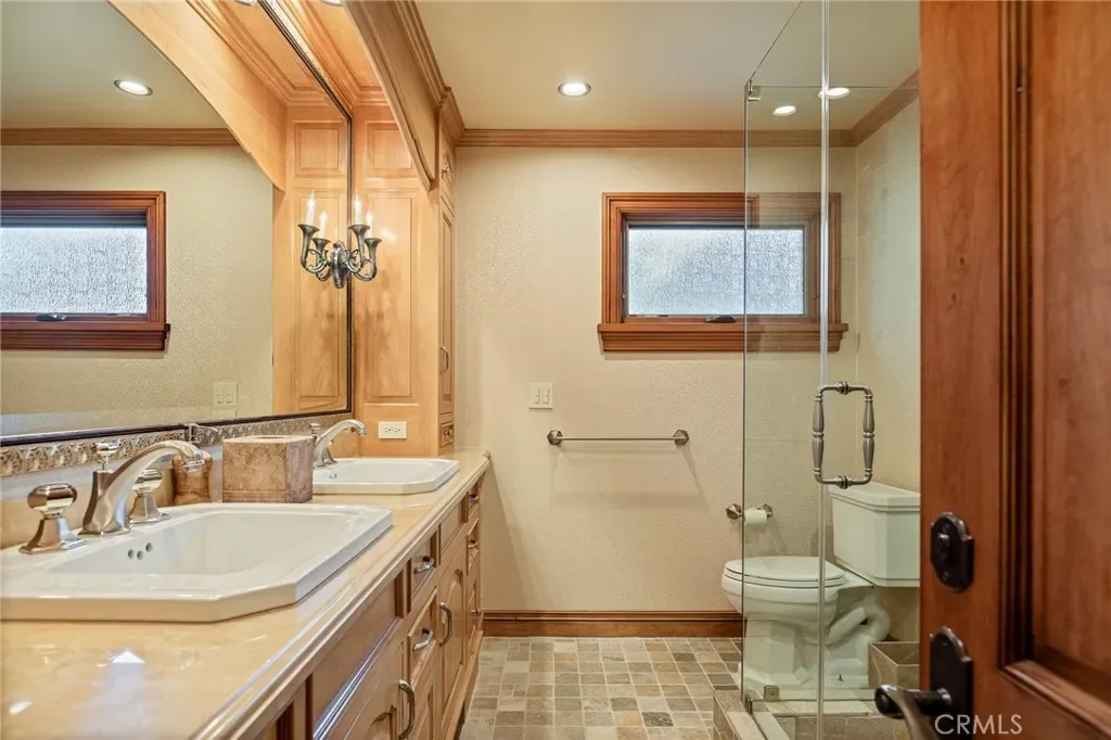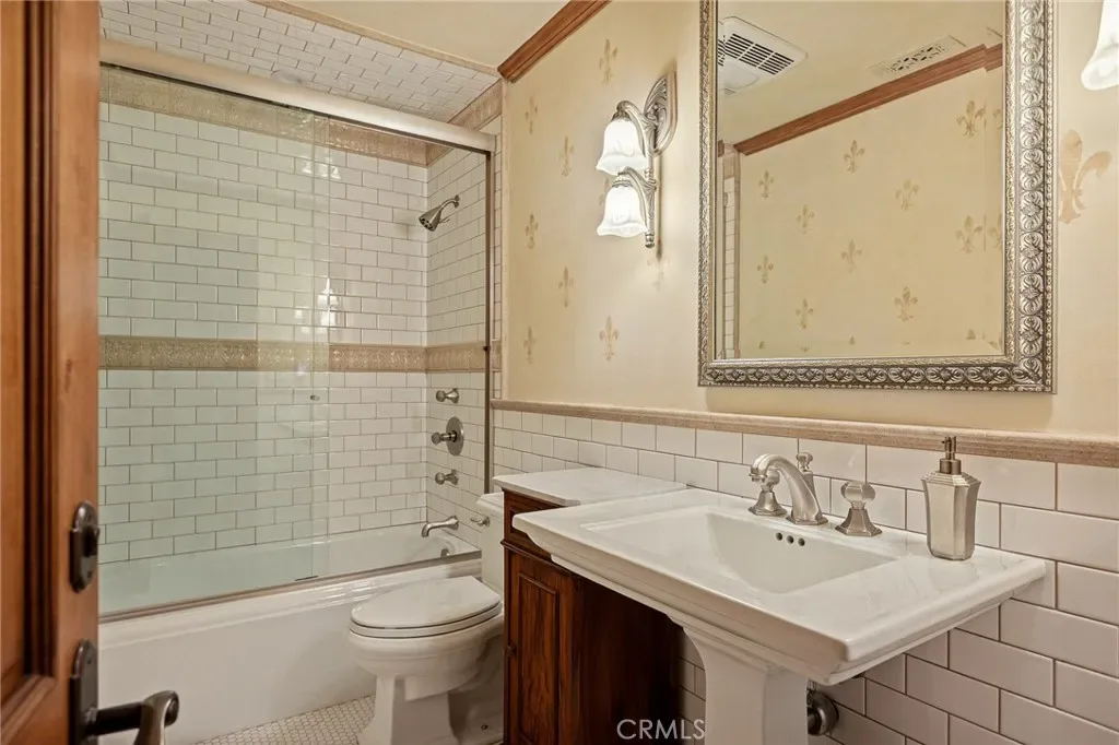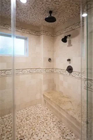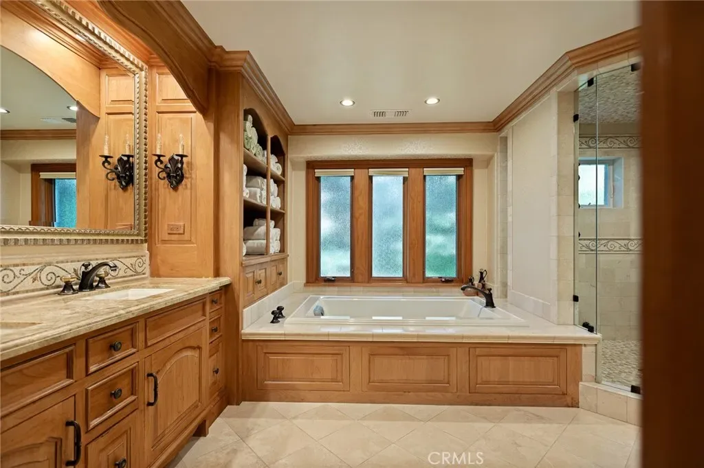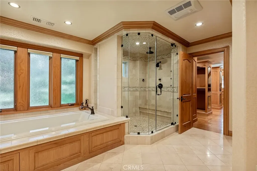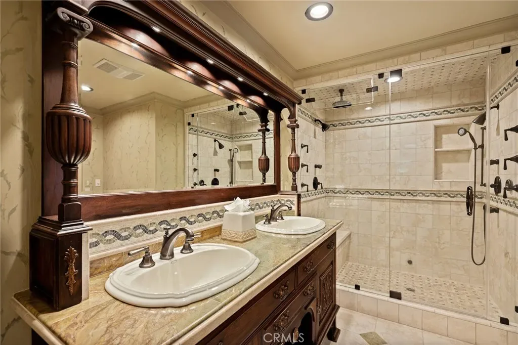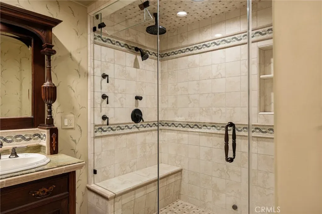 The primary suite is designed as a private retreat, featuring a statement chandelier, hand-painted mosaic tile, steam shower, and spa-quality finishes. Architectural enhancements—including added dormers and custom built-ins—elevate both livability and design.