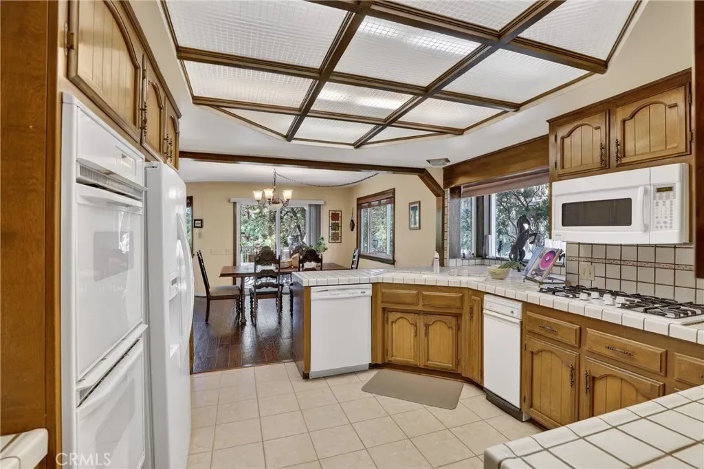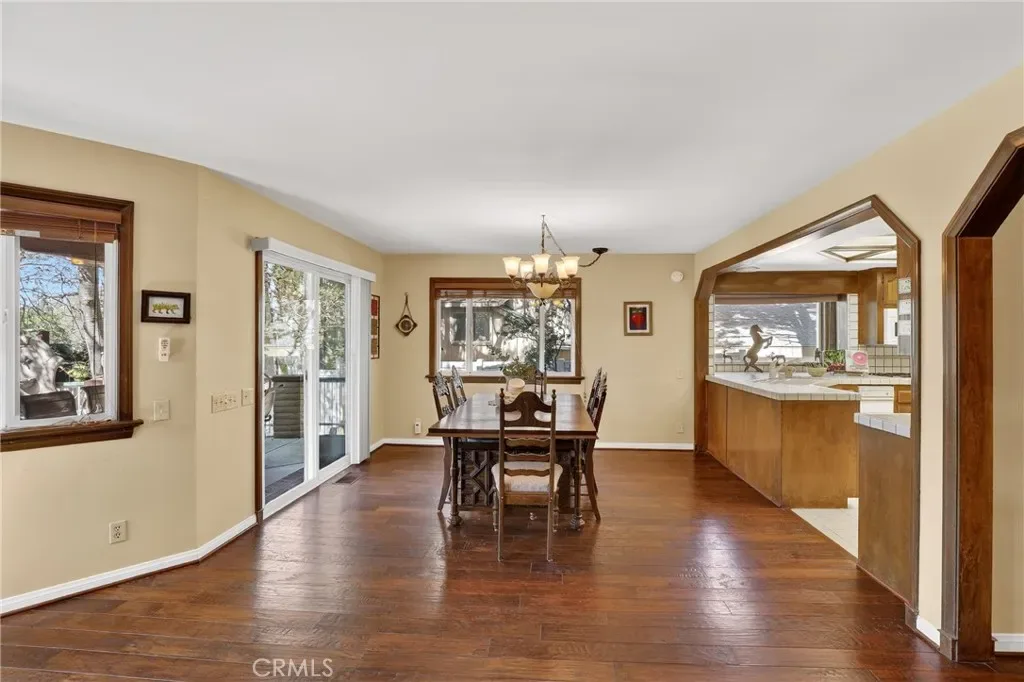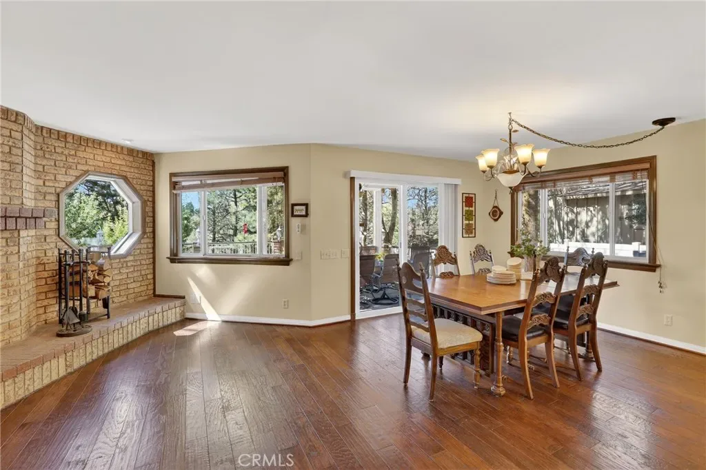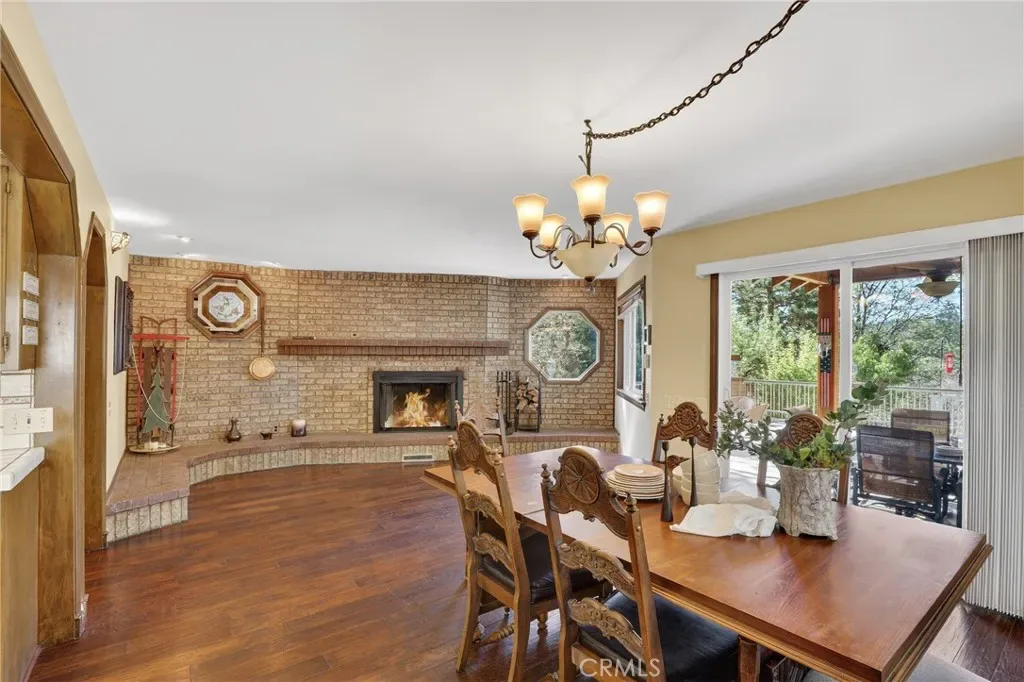 Step outside from the dining area onto a spacious patio, ideal for summer BBQs, morning coffee, or simply relaxing with a good book under the pines. Inside, the home boasts a generously sized kitchen and dining area complete with a brick fireplace, creating a warm and inviting space for gatherings.