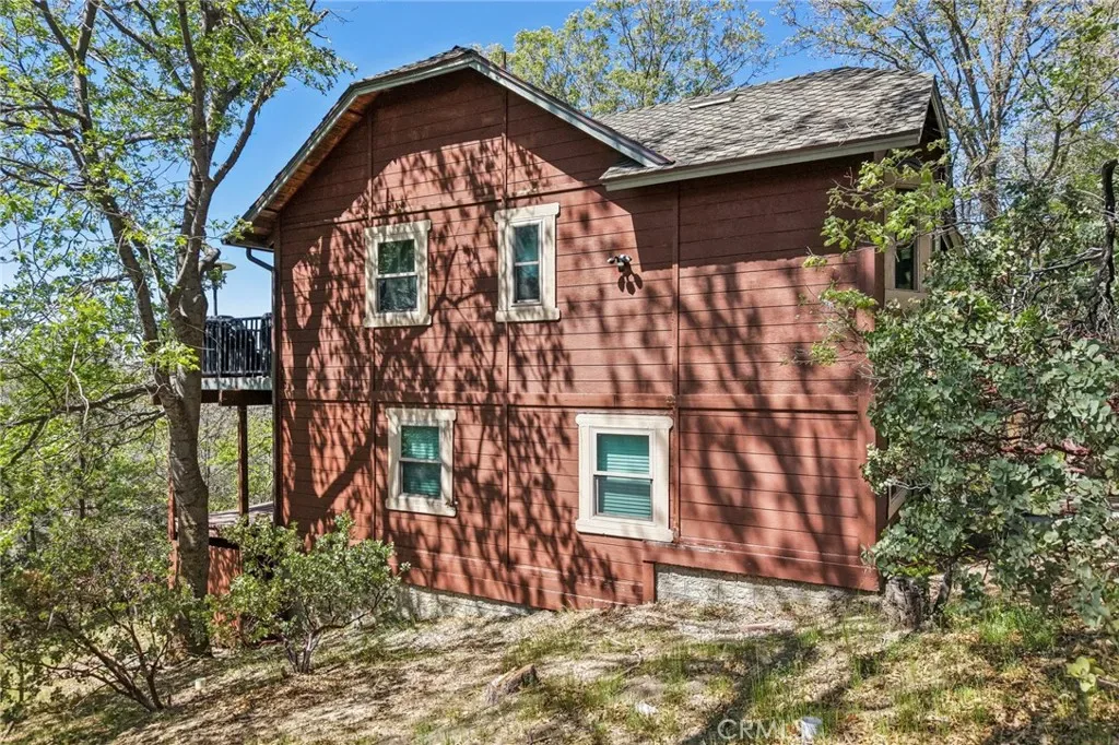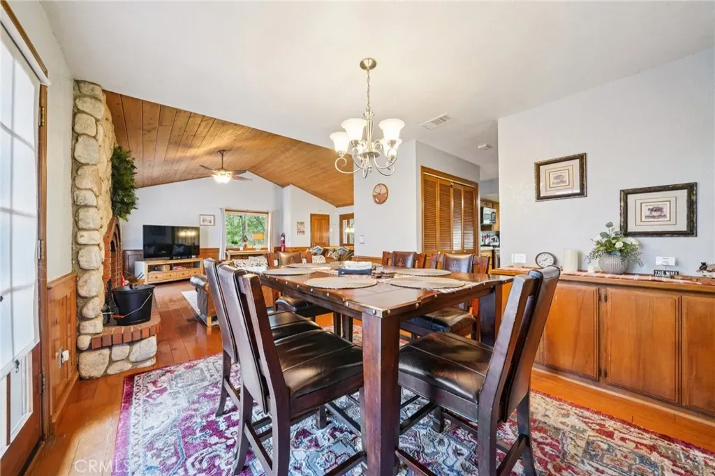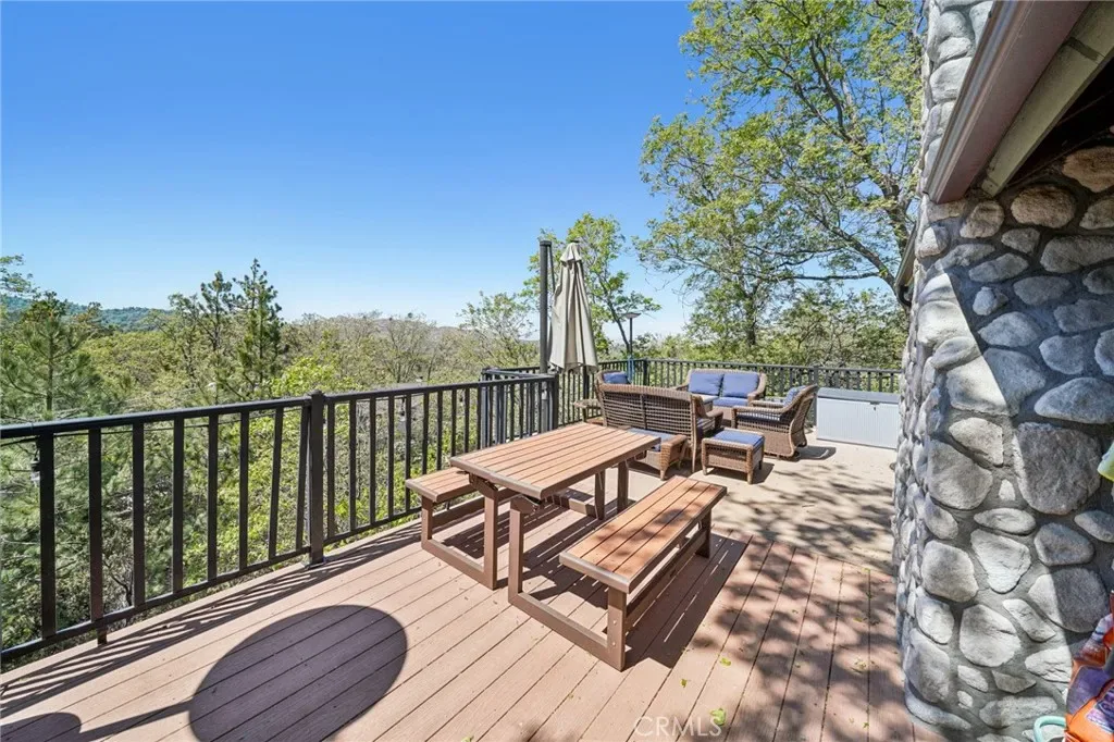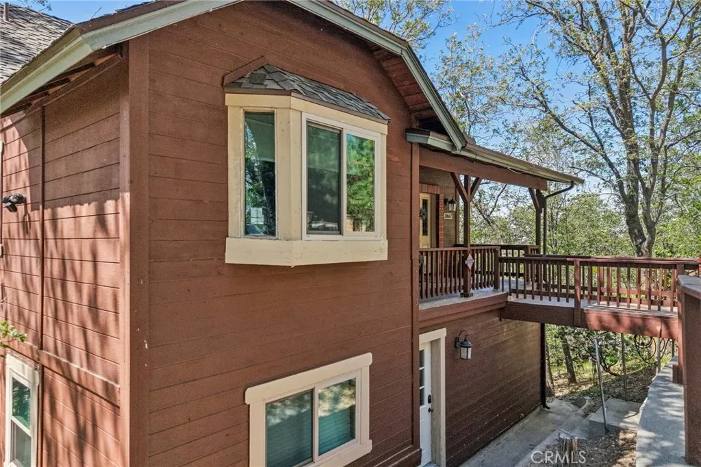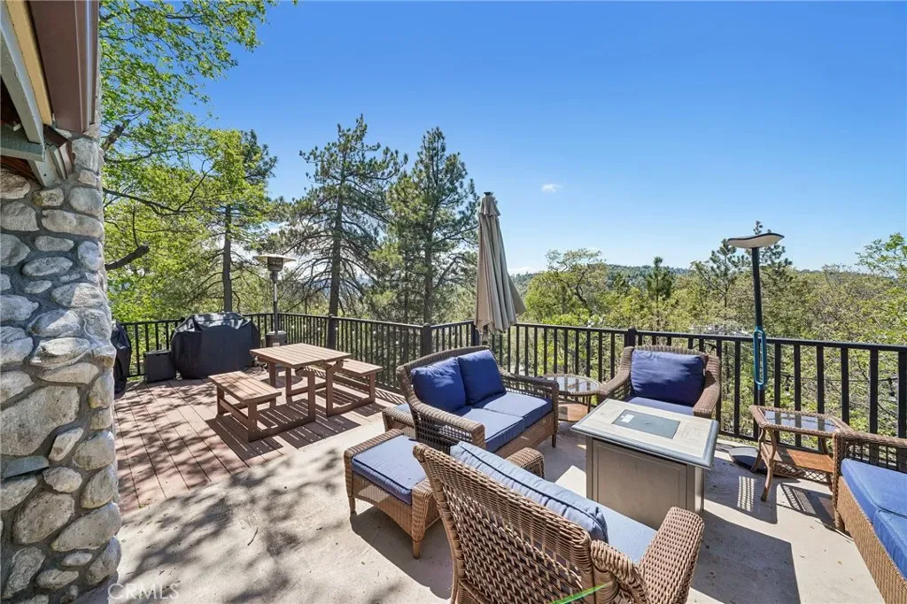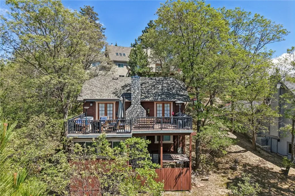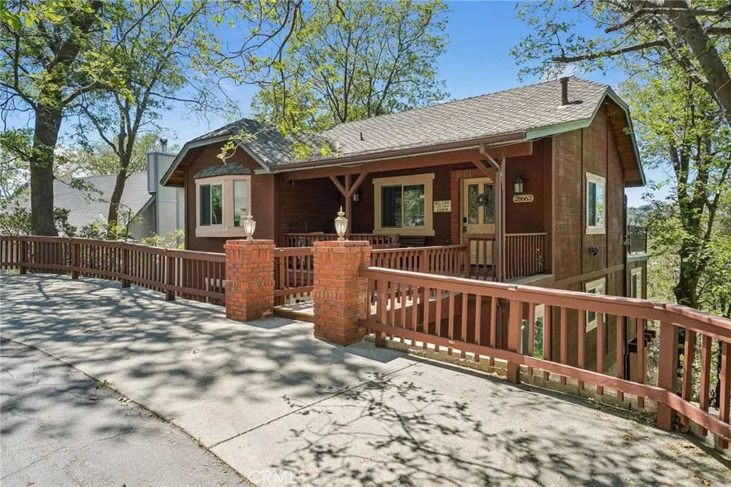 This charming mountain retreat offers lake rights, privacy, and stunning views—making it an ideal full-time home, getaway, or successful short-term rental. Enjoy level parking for two cars and a welcoming covered porch entry leading into a spacious foyer. The main living area showcases vaulted wood ceilings, rich wood flooring, and a striking rustic stone fireplace—creating a warm and inviting atmosphere. The open-concept living and dining spaces are filled with natural light and offer direct access to a gorgeous, expansive deck where you can take in tranquil forest and mountain views, vibrant sunsets, and distant city lights. The kitchen features stainless steel appliances, a wine fridge, and a charming bay window overlooking the front of the home. A full bathroom on the main level adds convenience. Downstairs, you’ll find three bedrooms and a full bathroom, along with a functional mudroom with laundry. One bedroom includes a bonus room extension, perfect for an office, playroom, or home gym. Additional highlights include an EV charger, newer roof and windows, and great natural light throughout. The adjoining 9,554 sq. ft. lot is also available for purchase, with the buyer having first right of refusal—offering added privacy or future expansion potential.
