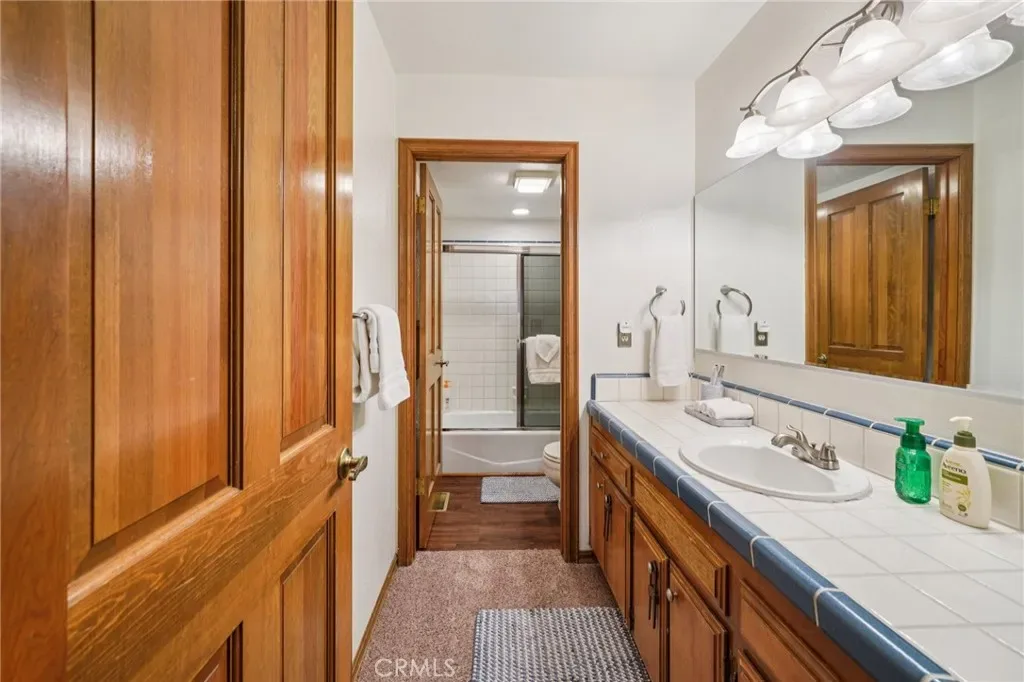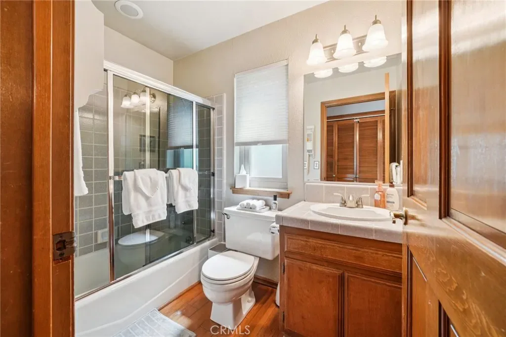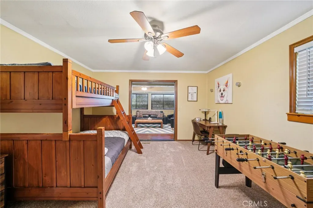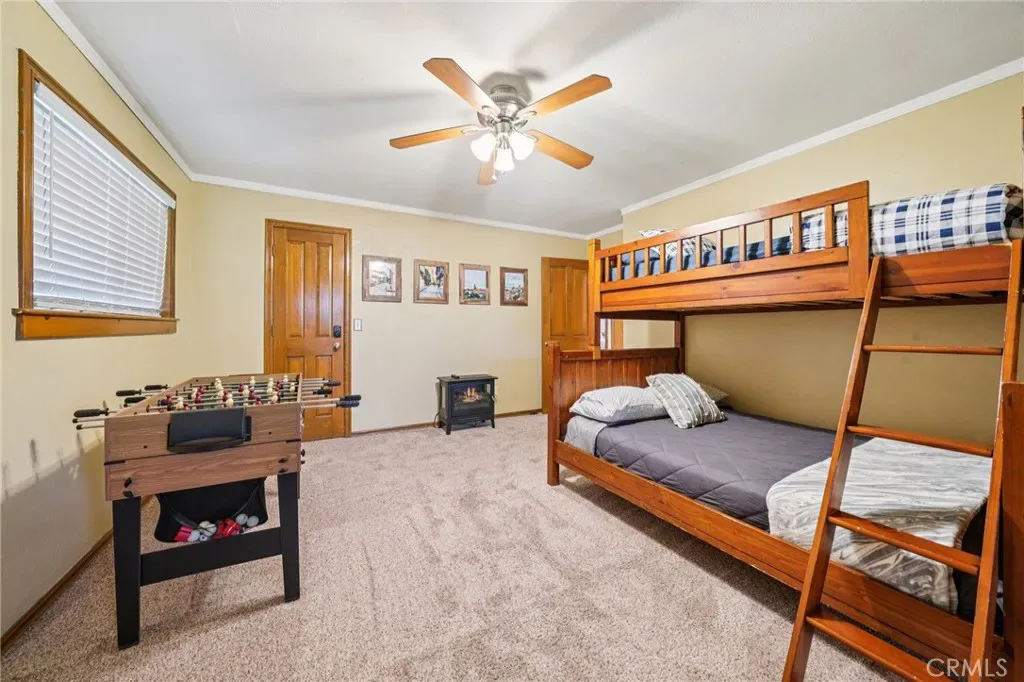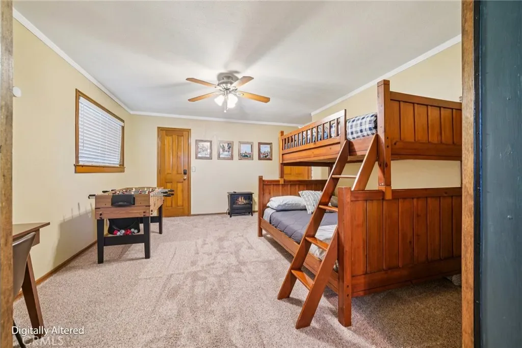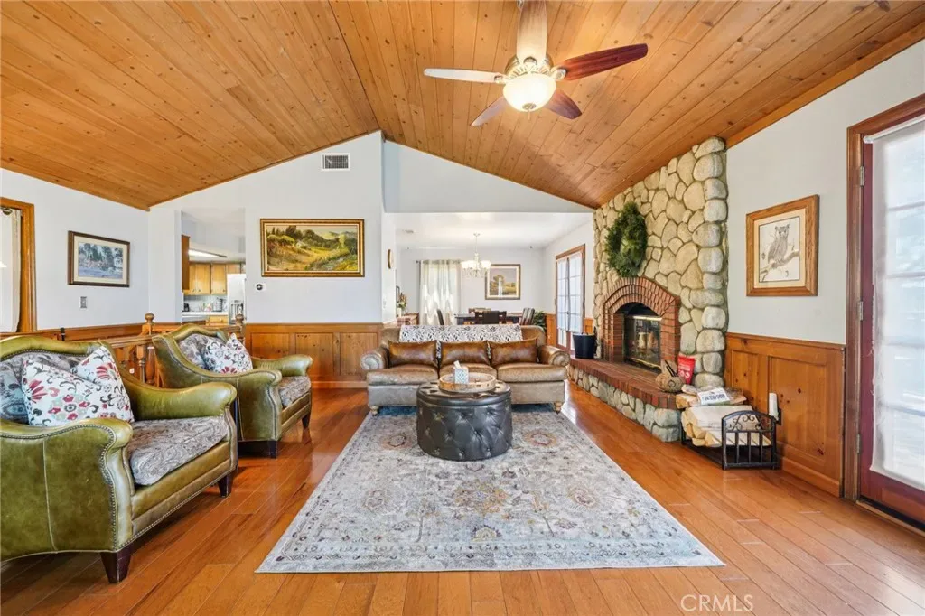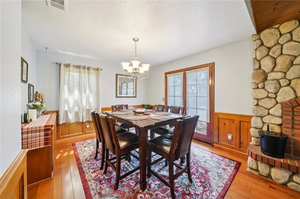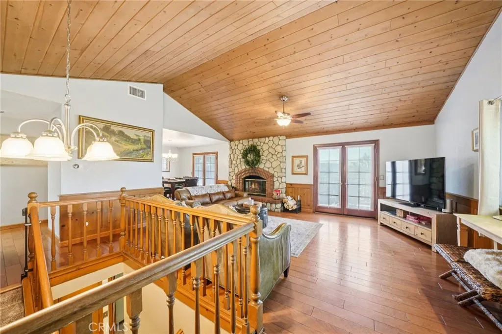 This charming mountain retreat offers lake rights, privacy, and stunning views—making it an ideal full-time home, getaway, or successful short-term rental. Enjoy level parking for two cars and a welcoming covered porch entry leading into a spacious foyer. The main living area showcases vaulted wood ceilings, rich wood flooring, and a striking rustic stone fireplace—creating a warm and inviting atmosphere. The open-concept living and dining spaces are filled with natural light and offer direct access to a gorgeous, expansive deck where you can take in tranquil forest and mountain views, vibrant sunsets, and distant city lights. The kitchen features stainless steel appliances, a wine fridge, and a charming bay window overlooking the front of the home. A full bathroom on the main level adds convenience. Downstairs, you’ll find three bedrooms and a full bathroom, along with a functional mudroom with laundry. One bedroom includes a bonus room extension, perfect for an office, playroom, or home gym. Additional highlights include an EV charger, newer roof and windows, and great natural light throughout. The adjoining 9,554 sq. ft. lot is also available for purchase, with the buyer having first right of refusal—offering added privacy or future expansion potential.
