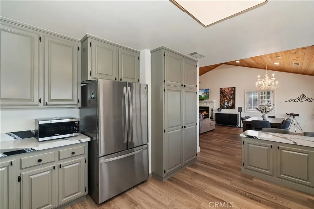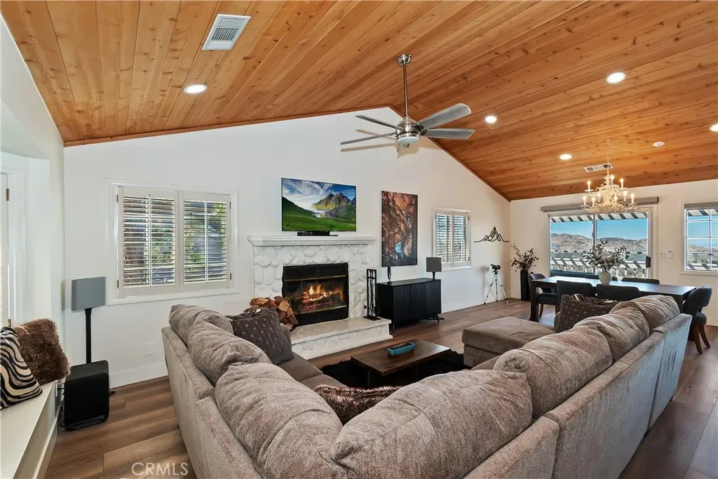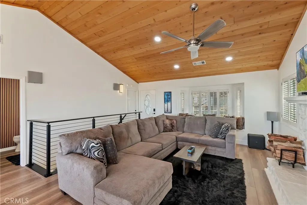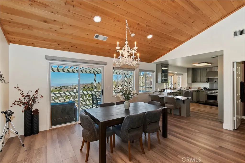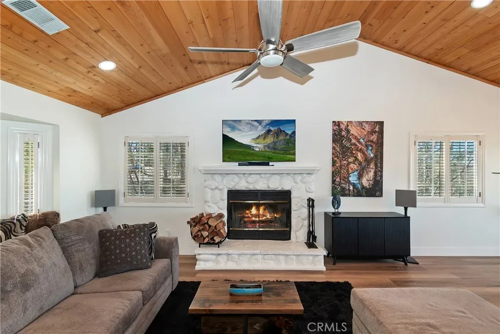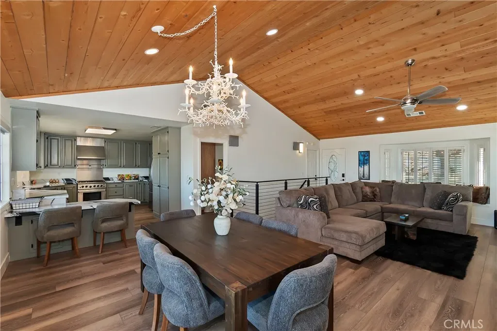 Step inside to a welcoming open-concept great room with vaulted ceilings and classic tongue-and-groove wood detailing, creating the perfect Lake Arrowhead mountain ambiance. Gorgeous new wide-plank wood flooring enhances the space, while large windows capture the stunning views.