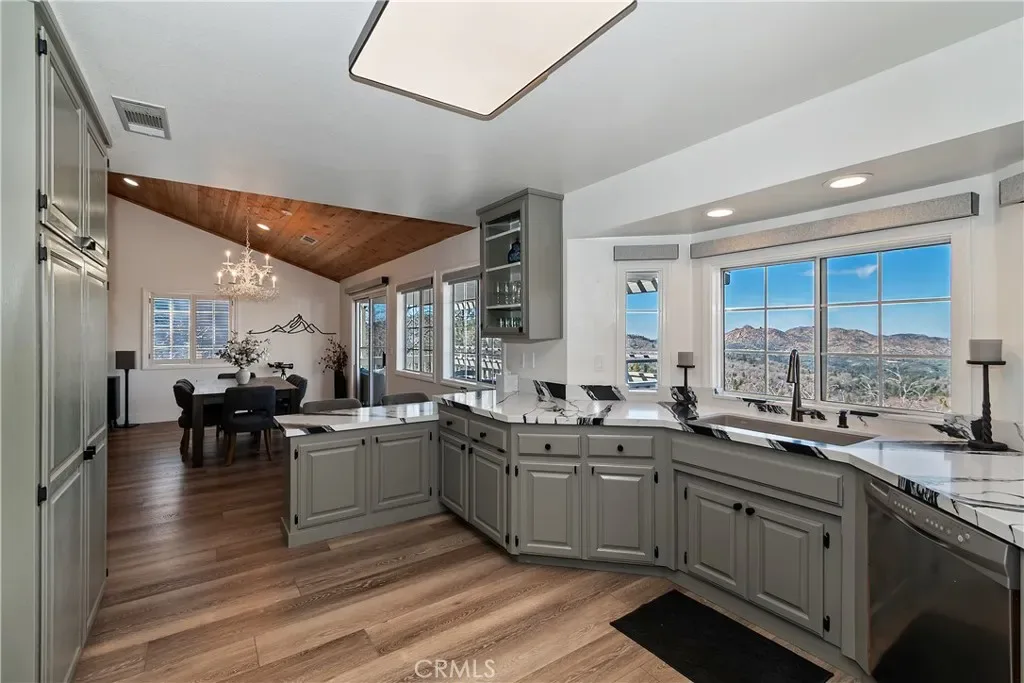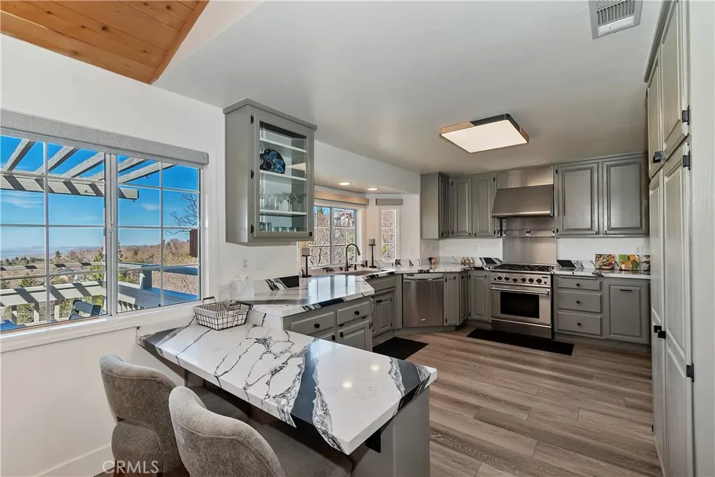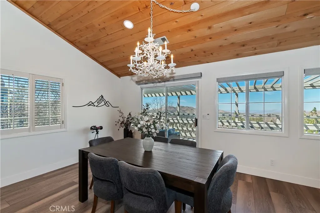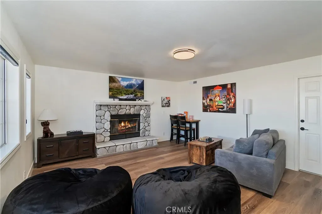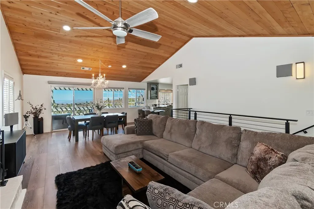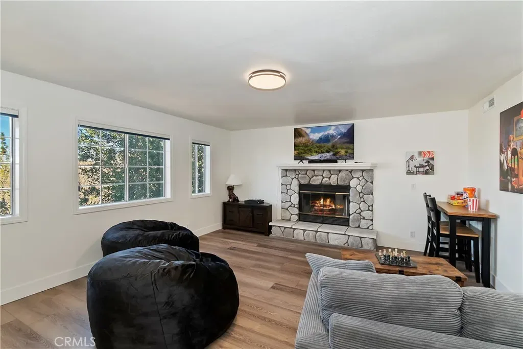 Step inside to a welcoming open-concept great room with vaulted ceilings and classic tongue-and-groove wood detailing, creating the perfect Lake Arrowhead mountain ambiance. Gorgeous new wide-plank wood flooring enhances the space, while large windows capture the stunning views.