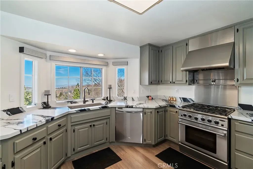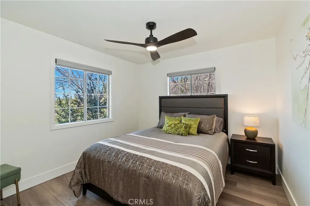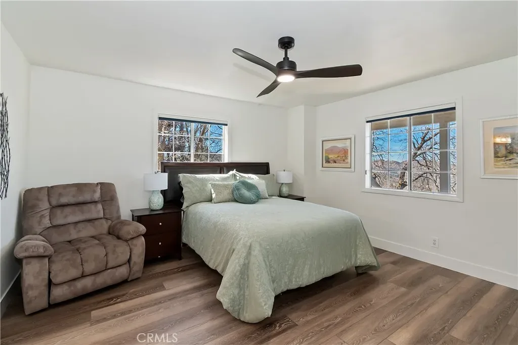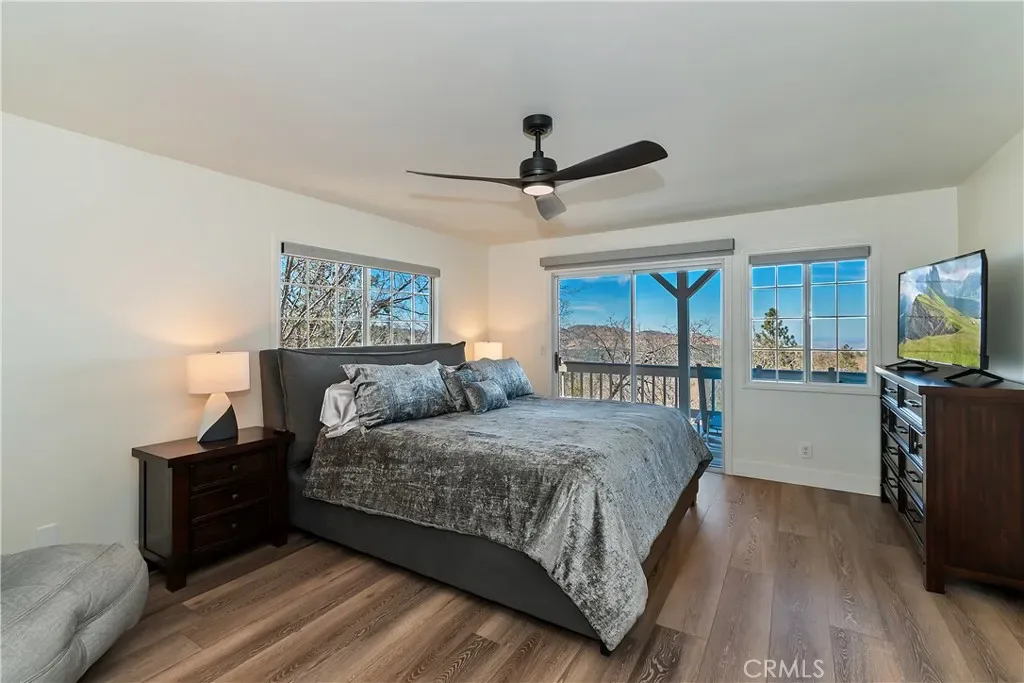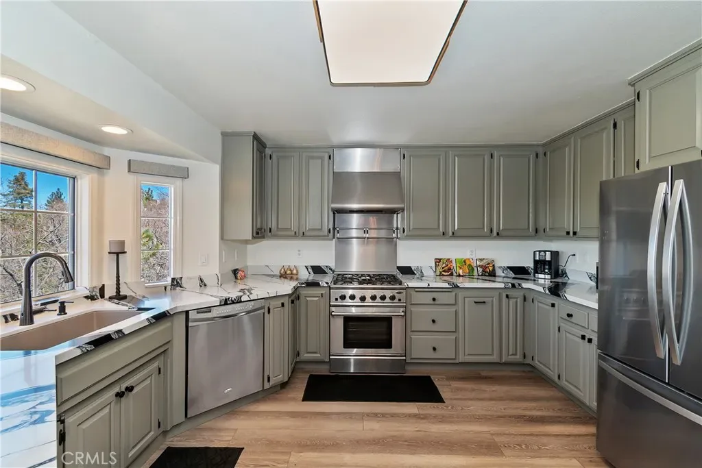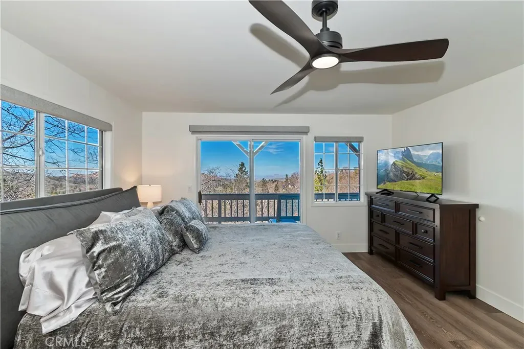 Step inside to a welcoming open-concept great room with vaulted ceilings and classic tongue-and-groove wood detailing, creating the perfect Lake Arrowhead mountain ambiance. Gorgeous new wide-plank wood flooring enhances the space, while large windows capture the stunning views.