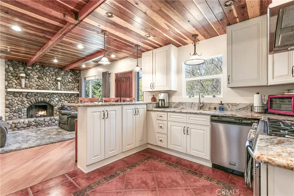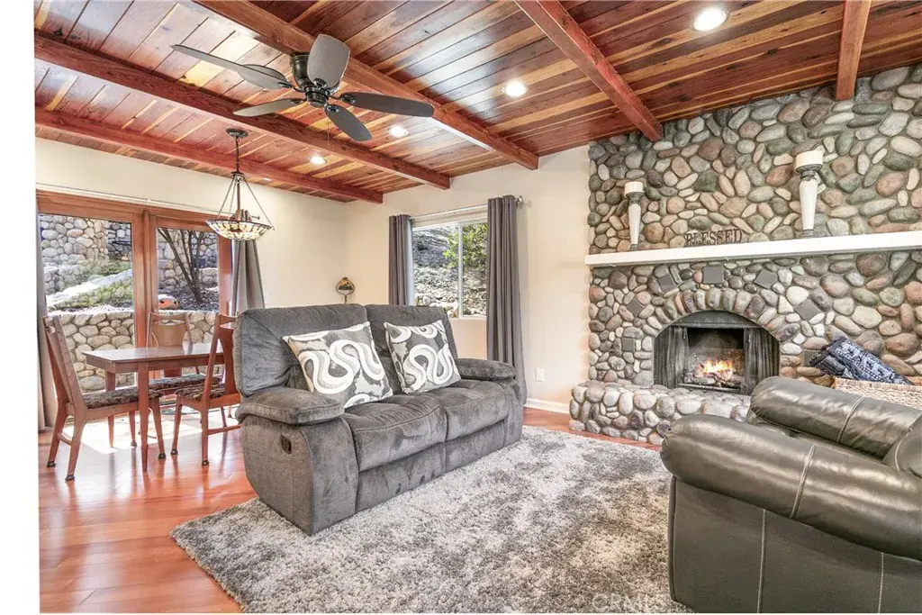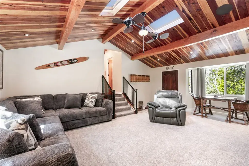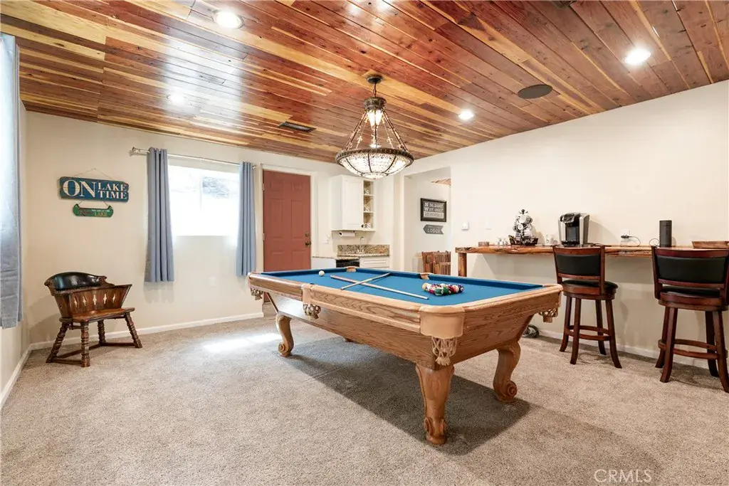 Set on almost half-acre lot, the cabin is surrounded by lush trees, providing both seclusion and a tranquil natural backdrop. Inside, the living room features a cozy fireplace, the spacious family room offers a second fireplace, perfect for relaxing on cool evenings. The game room is ideal for entertaining.