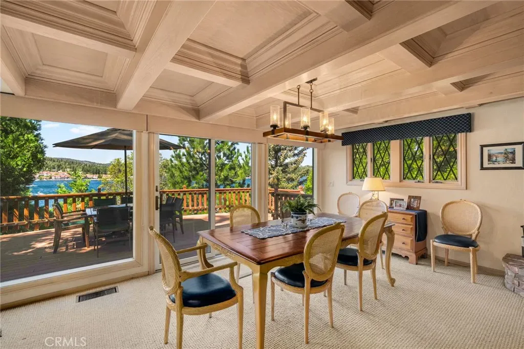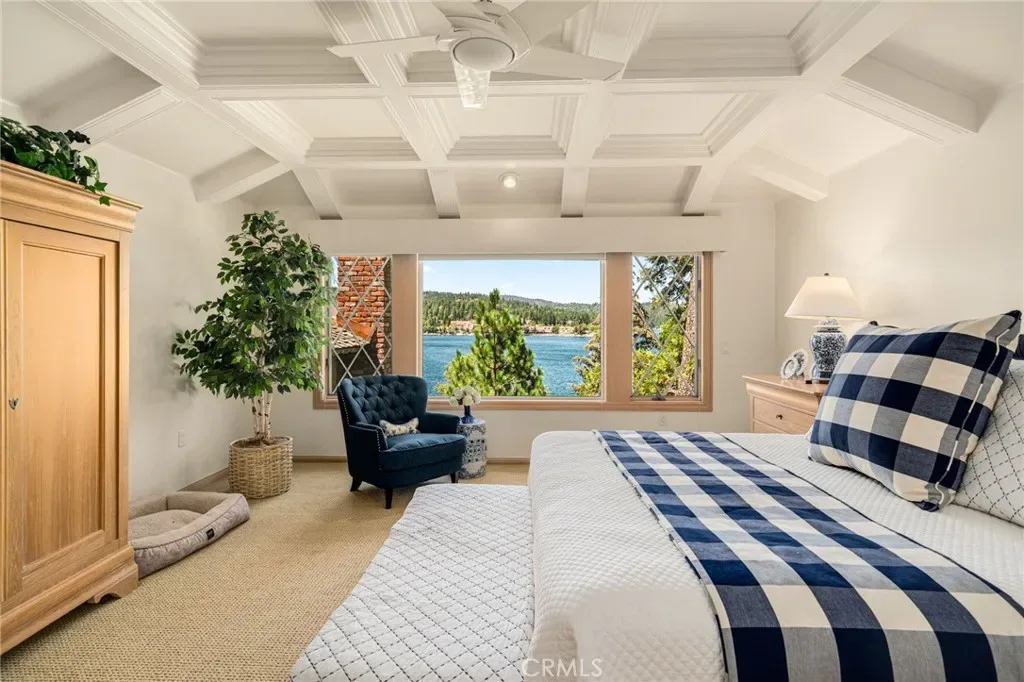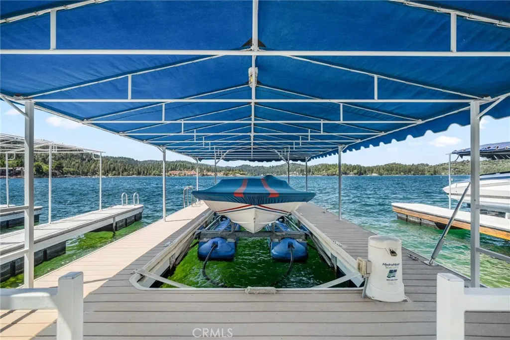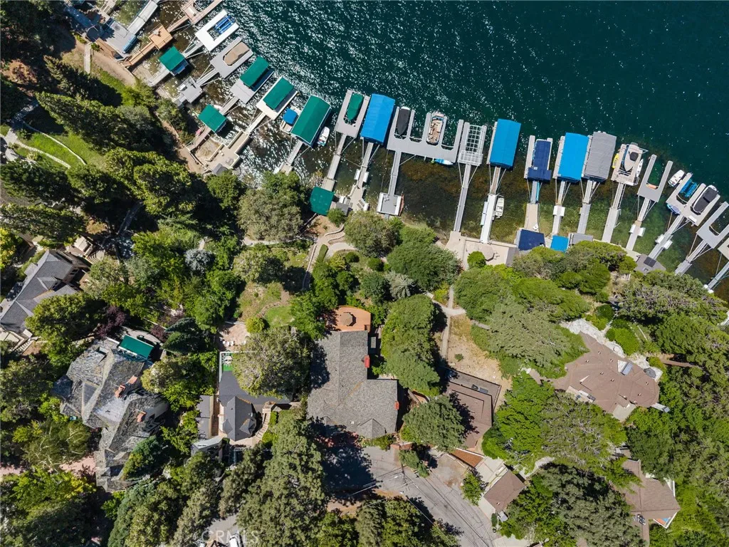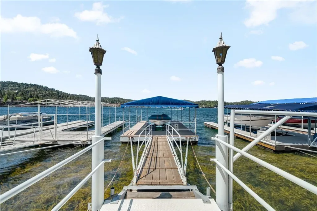 LAKEFRONT, lake view homes in Lake Arrowhead – One of a kind. Located in the palisades neighborhood, walk straight into this level entry 5 bedroom, 5 Bath custom home and get blown away by the lake views and overall orientation to lakefront living. The family area and primary suite features custom coffered ceilings, and expansive west facing views (exceptional at sunset). The home is immaculate, the exterior has a NEW roof, NEW exterior paint and the detail to the construction of the brand NEW deck is impressive. This home shows an extreme pride of ownership with every detail. The access to the dock couldn’t be more perfect, nice easy path and takes you to your private lakeside patio with Single Slip Dock. The Dock amenities include, a hydro hoist under a nautical canopy, a large concrete patio for entertainment, side tie for guest and additional rear tie up, currently used for a Boston Whaler for easy convenient transportation to Restaurants, Bars, Loan Pine Island, Marina, and other Lake features. The Dock and Patio also include, a Dock House for all your sporting goods, exterior furnishings, and service area with refrigeration for beautiful afternoon entertainment for the entire family. This property is ready to enjoy. This property is viewed by appointment only.