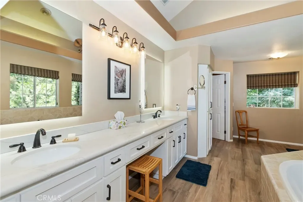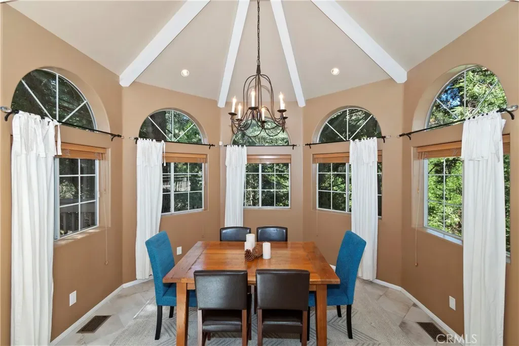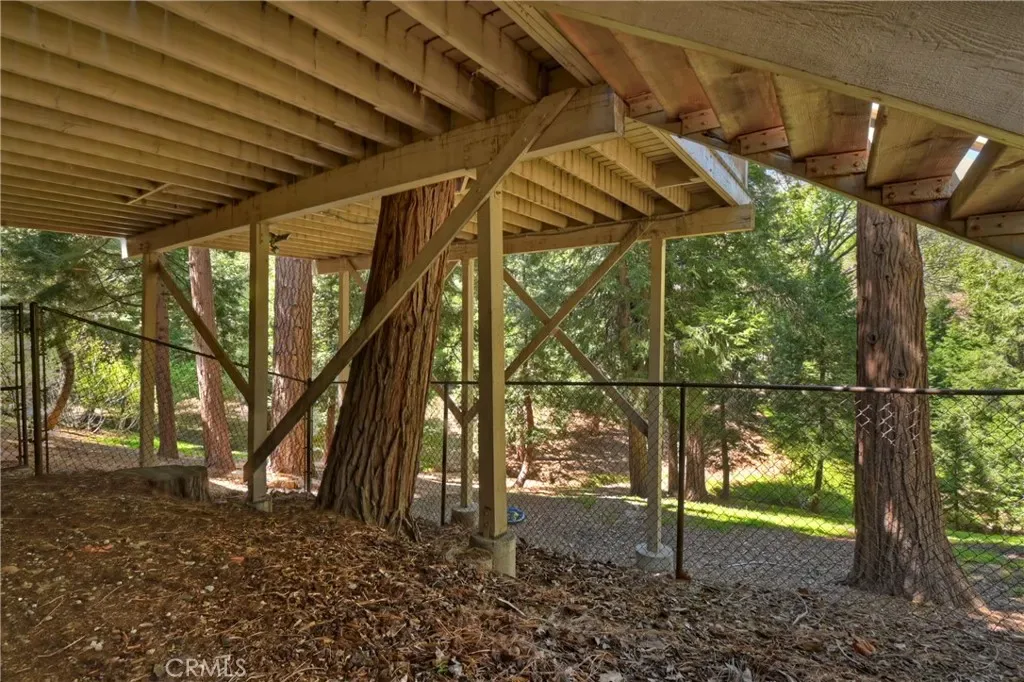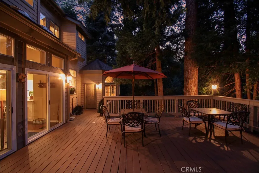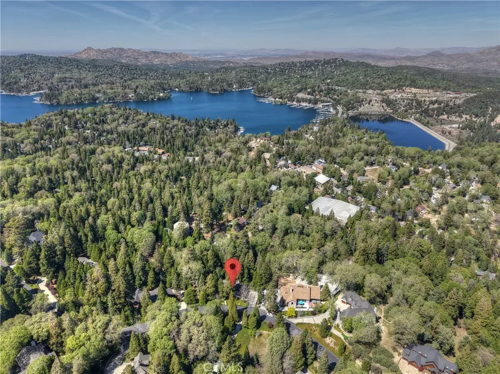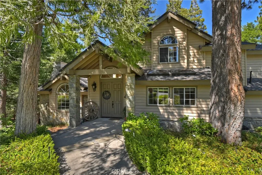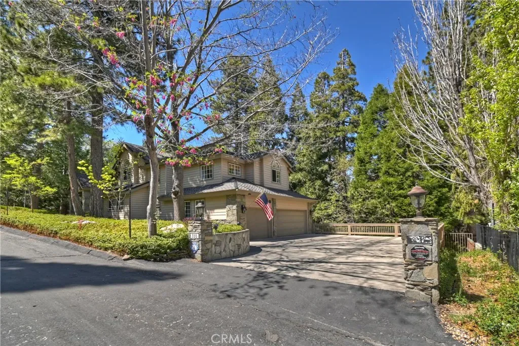 Lovely home in the gated community of Cedar Ridge Estates on nearly an acre of land!!! Spacious home with 3699 sq. ft. featuring 4 bedrooms and 3 baths with a flexible layout. The property is nicely landscaped and fully fenced, with a level driveway providing easy access from the street to the 3-car garage. Did we mention the ample off-street parking! Stone accents showcase the pillars and walkways taking you to the covered front porch. Big and open from the moment you step inside. The main level includes a formal living room with gas fireplace along with a bedroom that works well as a guest room or private office. The upgraded kitchen is designed for both everyday use and entertaining. Features include quartz countertops, a large island with secondary sink, walk-in pantry, custom soft-close cabinetry, two ovens and a 5-burner gas range. Large, sunny window over the sink. A long breakfast bar connects the kitchen and family room featuring a wood-burning fireplace with direct access to rear deck. A formal dining room sits just off the kitchen and also opens to the deck. An open, light-filled staircase leads to the upper level with two guest bedrooms, a full bath, and the spacious primary suite. The large guest room has a built-in desk w/bookcases; the closet is currently set up as an art studio, offering great light and shelving to conveniently store your supplies. The primary bedroom includes a large walk-in closet and the dual-sided gas fireplace is shared with the bathroom. Luxury bath features a jetted soaking tub, walk-in shower, double sinks and lighted vanity mirrors!! It’s a place of comfort for sure. Outdoor spaces are a highlight with the large deck overlooking a natural forest and seasonal stream…… complete with accent lighting for evening use. Easy to gather without feeling crowded. If natural light is important, this home has multiple skylights. Additional enhancements include 2 A/C’s, 2 FAU’s, whole house self-activated gas generator, central vacuum system… yes it works….. small fenced dog run. Built-ins and cabinets in garage. Well maintained showing pride of ownership. This area is truly a step outside the norm. A gated community with large stately homes on private lots with lush green landscaping along with a mature mountain forest ~ close to the lake and minutes to historic Lake Arrowhead Village, yet a sense of privacy and serenity exists here. Boat slip in MBM #4 Slip 7 and boat available for additional costs.