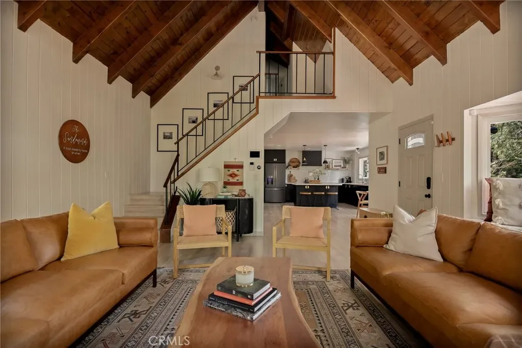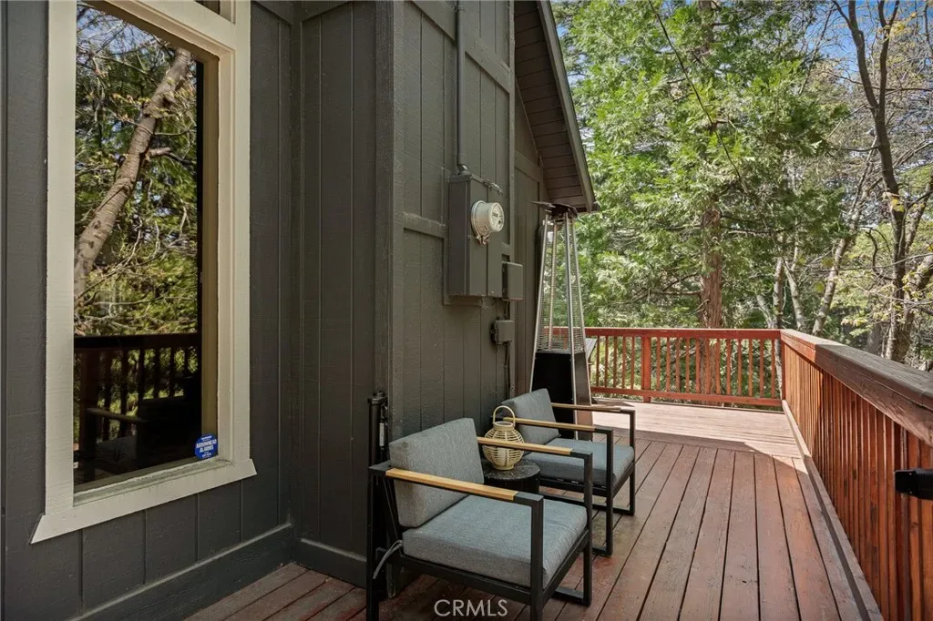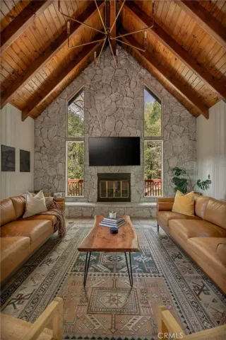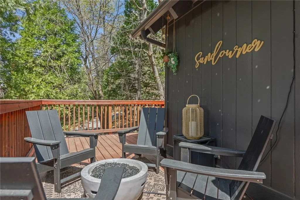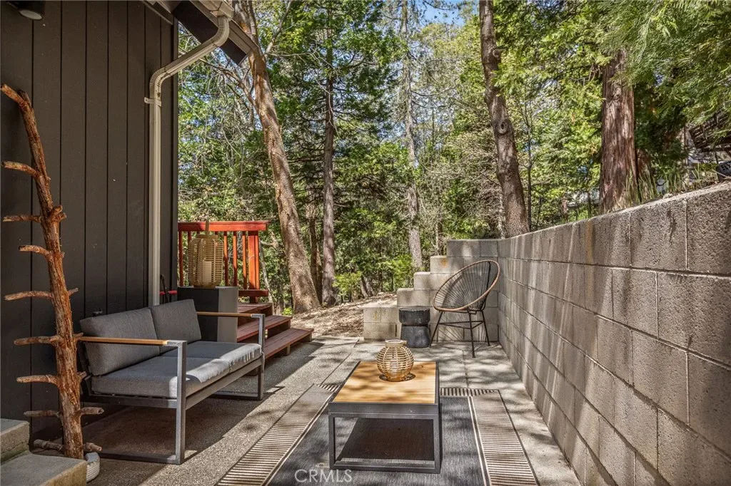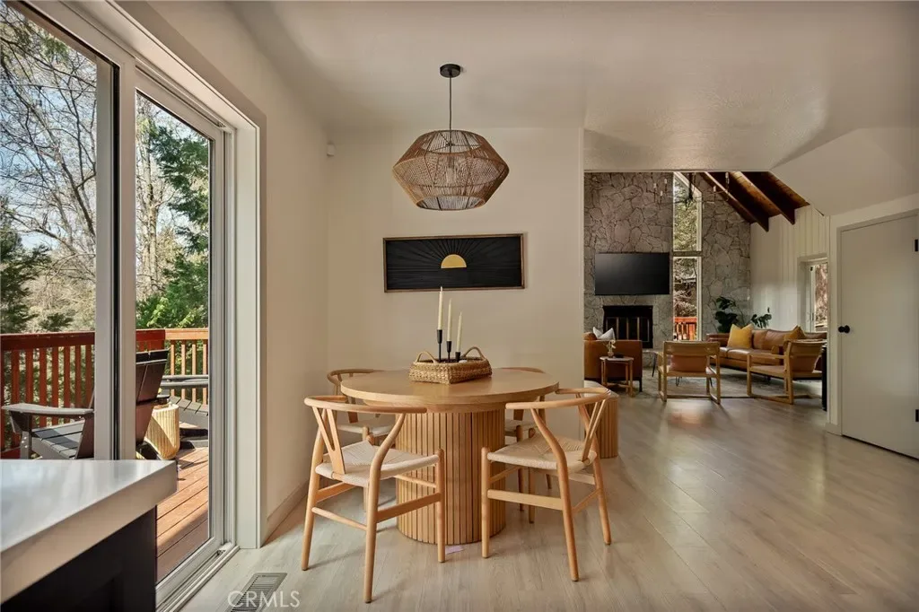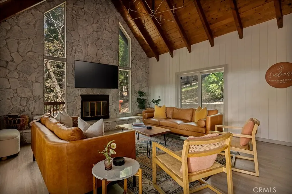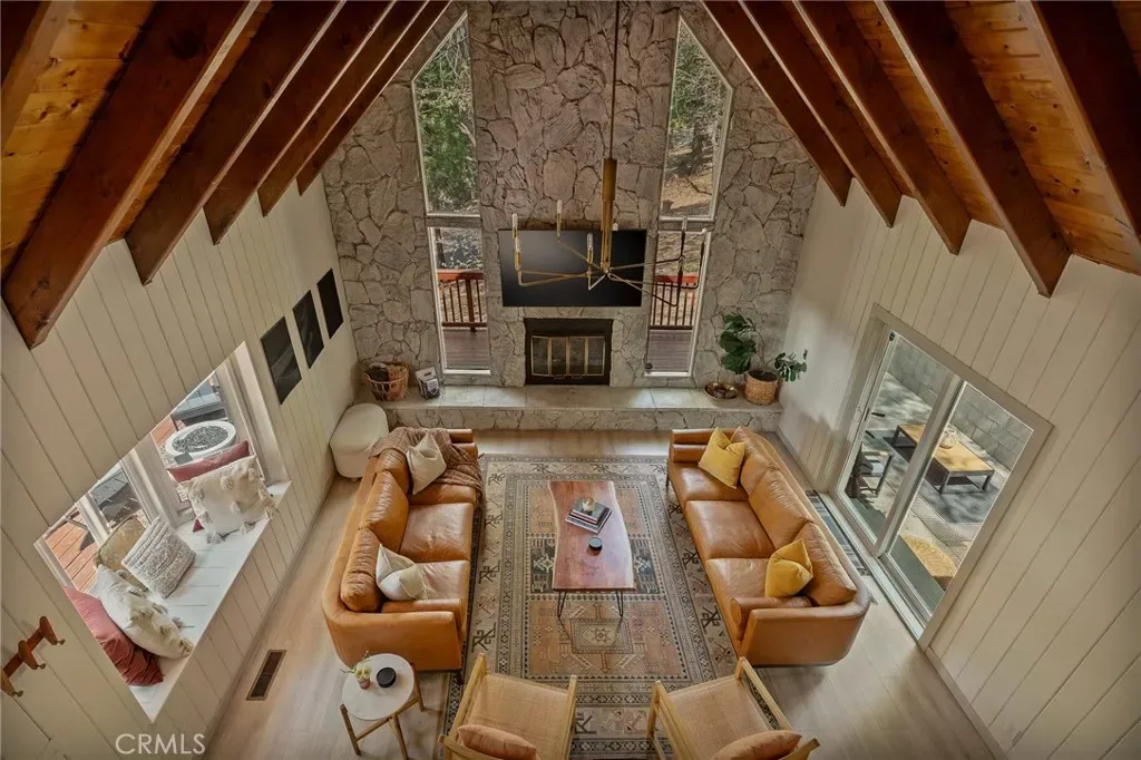 Perched up on the hillside you will find this stunning remodeled home located close to the Lake Arrowhead Village and Hwy 18. Enter in to this stunning high vaulted ceiling open floor concept home with primary bedroom on the main. Home was remodeled in 2020 and boasts an equipped kitchen with Calacatta Quartz counters, black stainless appliances, and a sliding glass door that leads to the expanded front near wrap around deck. The main living room boasts a large rock wall that exudes the focal point of the room. The back area has a covered private spa area that allows you to take in the mountain surroundings. Upstairs is 2 more bedrooms with high ceilings, and a bath. Home has been a successful Airbnb and has been used for multiple catalog branding shoots. Home has been updated with Dual Pane windows, and Pergo WetProtect flooring along with a curated style to exude the current trend. Home comes furnished and is located in Lake Rights. You will find lots of privacy on this lot, tucked in with the cedars, oaks, and dogwoods. Don’t let this one pass you up.