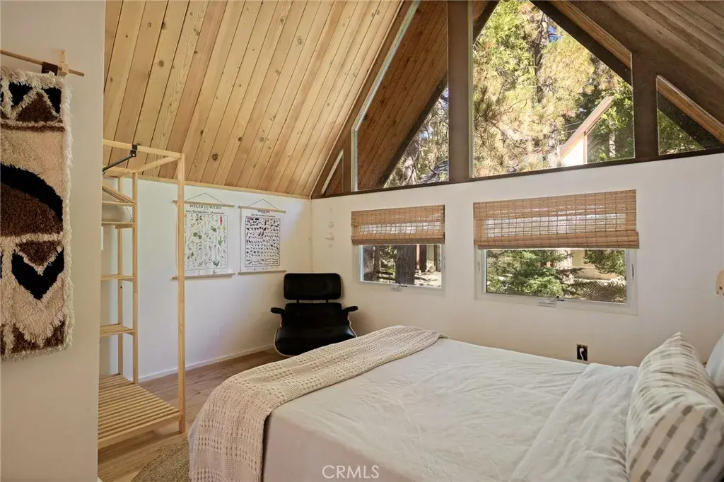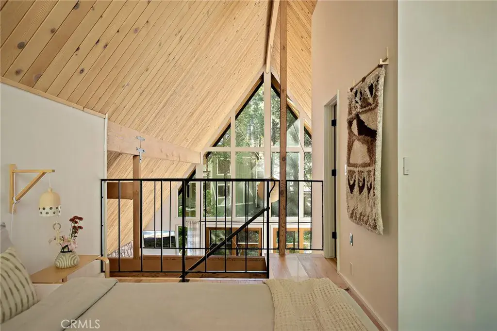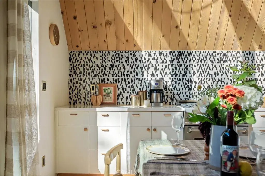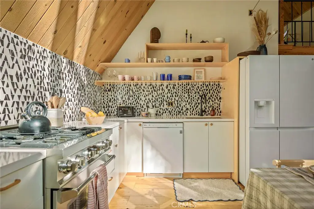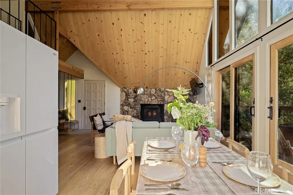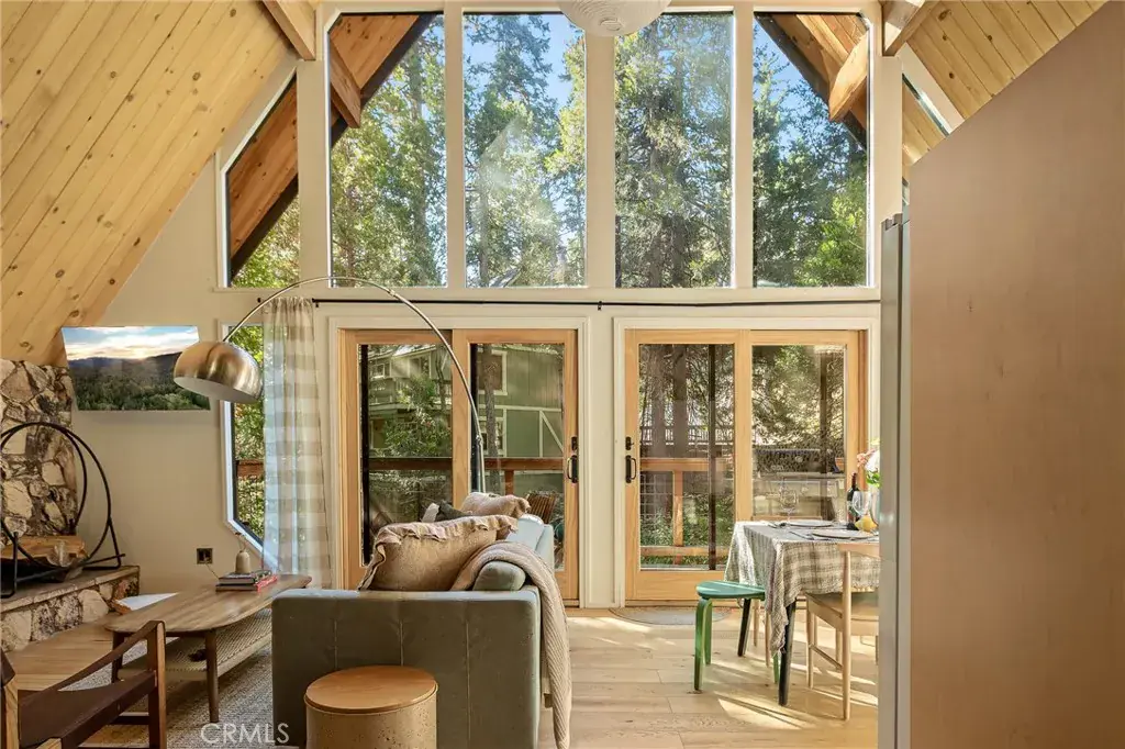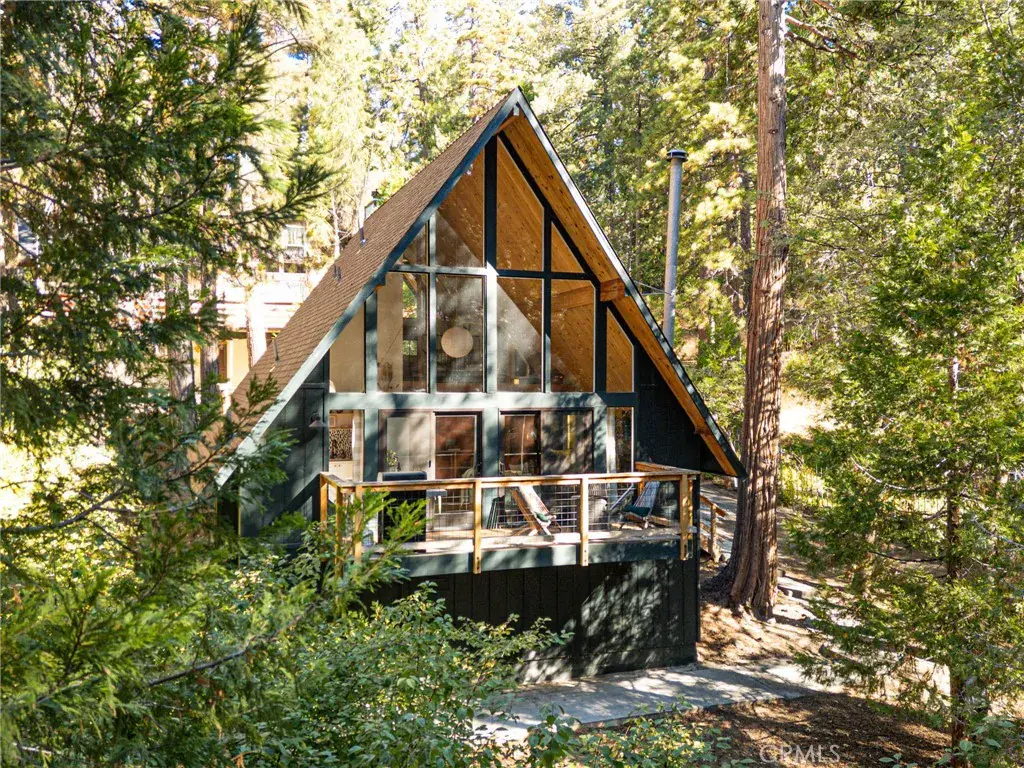 Tucked among the trees just moments from the lake and the charming village of Blue Jay, this beautifully remodeled 1970s A-frame captures everything people love about mountain living—retro character reimagined with a clean, modern spirit. Inside, sunlight filters through iconic triangular windows onto custom cabinetry, quartz countertops and hardwood floors that make the space feel both elevated and effortless.