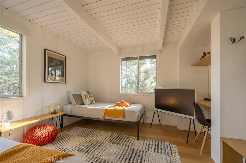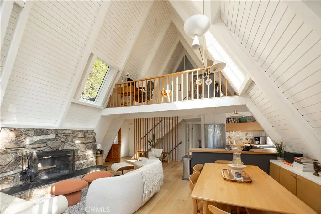 Welcome to the A-frame retreat you’ve been dreaming of! This fully renovated gem, nestled amidst the trees of Lake Arrowhead, perfectly blends modern updates with timeless mountain charm. Offering a turnkey lifestyle, this home promises effortless living in a prime location. Step inside to be greeted by an inviting open living area, bathed in natural light, thanks to the striking floor-to-ceiling windows that offer breathtaking views of the surrounding forest. Cozy up by the fireplace on chilly nights or venture onto one of the three serene decks to immerse yourself in the tranquil atmosphere. The main level offers two generous bedrooms, a sleek kitchen, and a convenient bathroom, enhancing the ease of entertaining. Ascend to the upper level, where a primary suite awaits, complete with contemporary amenities and a loft providing captivating views of the space below. The versatile lower level boasts space for relaxation or entertainment, highlighted by a second fireplace to keep the ambiance warm. Step out to the concrete patio, where a rejuvenating spa invites you to unwind and soak in the mountain air throughout the year. The fenced backyard provides a secure area for pets to frolic freely. Modern conveniences include a newly installed HVAC system with air conditioning, ensuring year-round comfort. With excellent rental potential and lake rights, this home exemplifies the pinnacle of mountain living.