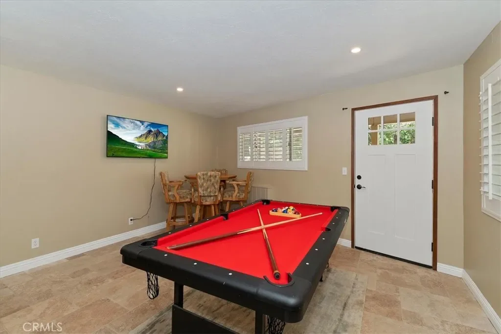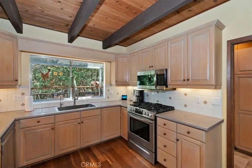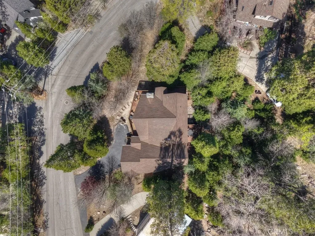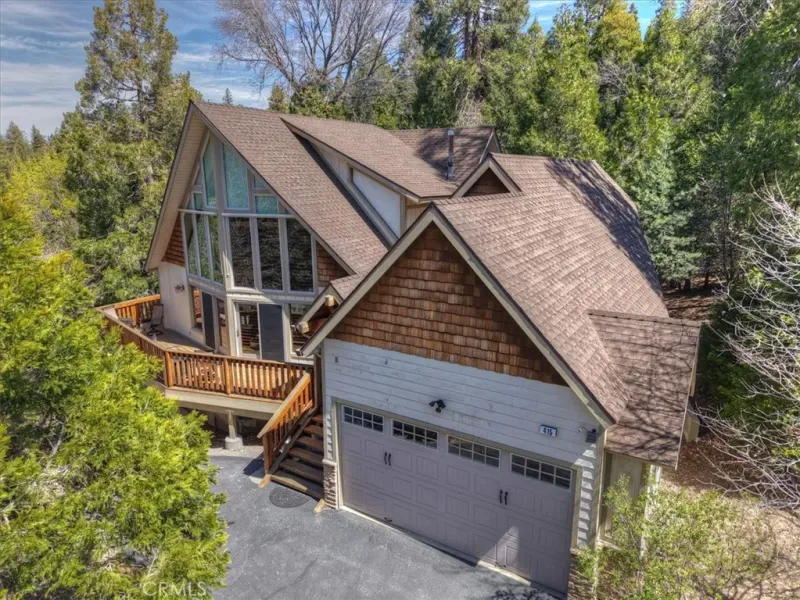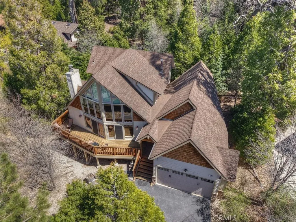 Mountain Modern Luxury at the Country Club. ~ Escape to this stunning 2,290 sq. ft. retreat, perfectly positioned on over a third of an acre of usable, forested land. Located directly across from the prestigious Lake Arrowhead Country Club, Golf Course and Grass Valley Park. This home offers the ultimate blend of sophisticated updates and rugged mountain charm. ~ The Home: Awesome “Prow style” that features level-entry! Step into everyone’s favorite open floor plan, where the gourmet kitchen, dining, and living areas flow seamlessly together. Soaring two-story vaulted and beamed ceilings and floor-to-ceiling windows with remote-control solar shades flood the space with natural light, framing serene forest views. Every inch has been thoughtfully updated, including modern flooring, designer baths, and expansive new decks perfect for entertaining. ~ The Layout: Upper Level: A dedicated sanctuary. The entire top floor is a private Master Retreat, offering unmatched scale and comfort.