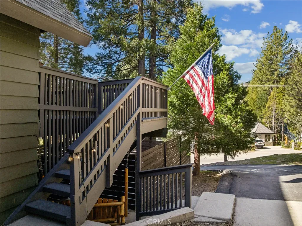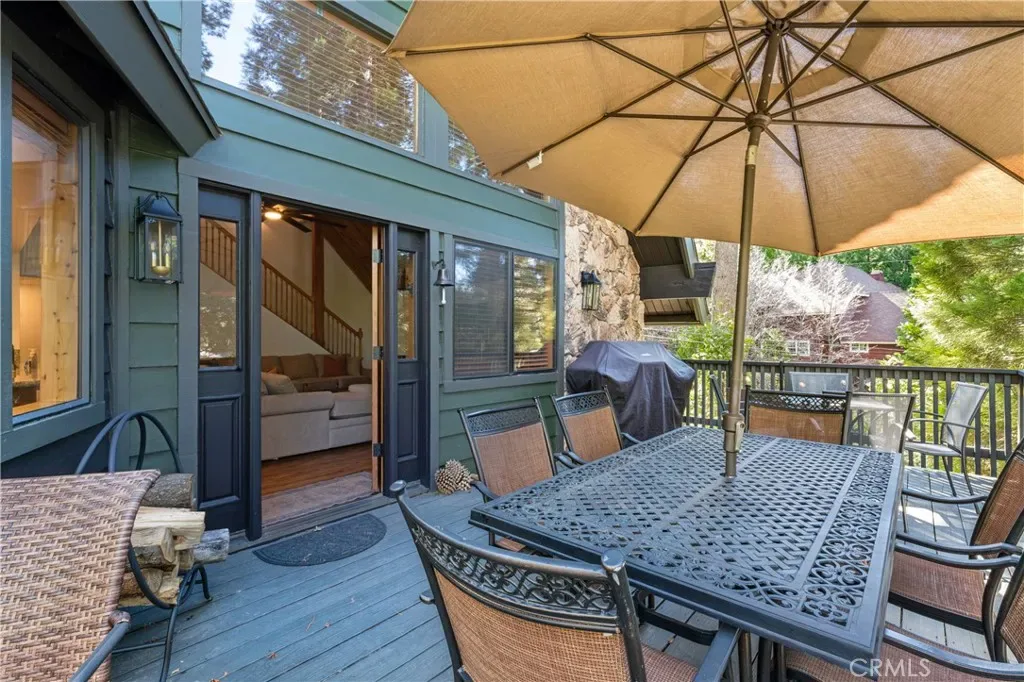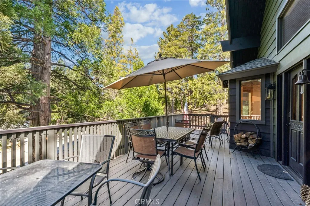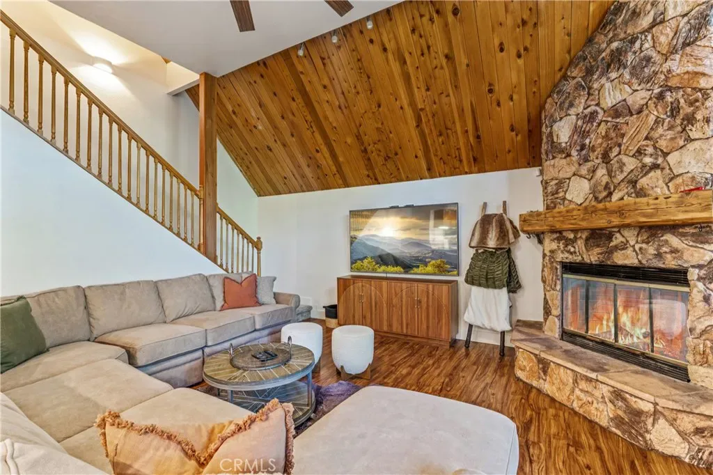 Premier 1st Tier Golf Course Mountain Home with Lake Rights!! Live the ultimate mountain lifestyle! This spectacular updated home is just a short walk to Grass Valley Lake, a quick golf cart ride to Lake Arrowhead Country Club, and includes lake rights. Updated in 2022, the home features 4 bedrooms, 3.5 bathrooms, and approximately 3,253 sq. ft., including a loft and bonus room above the garage. Vaulted wood beam ceilings and abundant natural light highlight the open kitchen, dining, and living area. The kitchen is upgraded with granite countertops and stainless-steel appliances, flowing seamlessly to the living room with a stone wood-burning fireplace and custom barn wood mantel. The dining area includes a custom bench seat and table. Two primary suites on the main and third floors feature attached bathrooms with granite countertops, soft-close cabinetry, and generous closets. The main floor includes a laundry room with washer and dryer. Entertainment options abound with two game rooms: the first-floor room has a TV, fireplace, wet bar, mini fridge, pool table, bedroom, and full bath; the bonus room above the garage. Attached two-car garage with golf cart bay, plus multiple driveways for cars, RVs, or boats. Situated on a private corner lot, the home offers three decks with patio furniture, a recently painted exterior, and a gated spa for relaxation. Sleeps 12+, with kid-friendly features including a secret passageway from the third-floor loft to the bonus room and a custom playhouse with wraparound deck. The bottom floor could serve as a separate suite with a built-in fridge, wet bar, and private entrance. Modern amenities, generous living space, and a prime location with lake rights and close proximity to the golf course make this property ideal as a permanent residence or mountain vacation retreat!