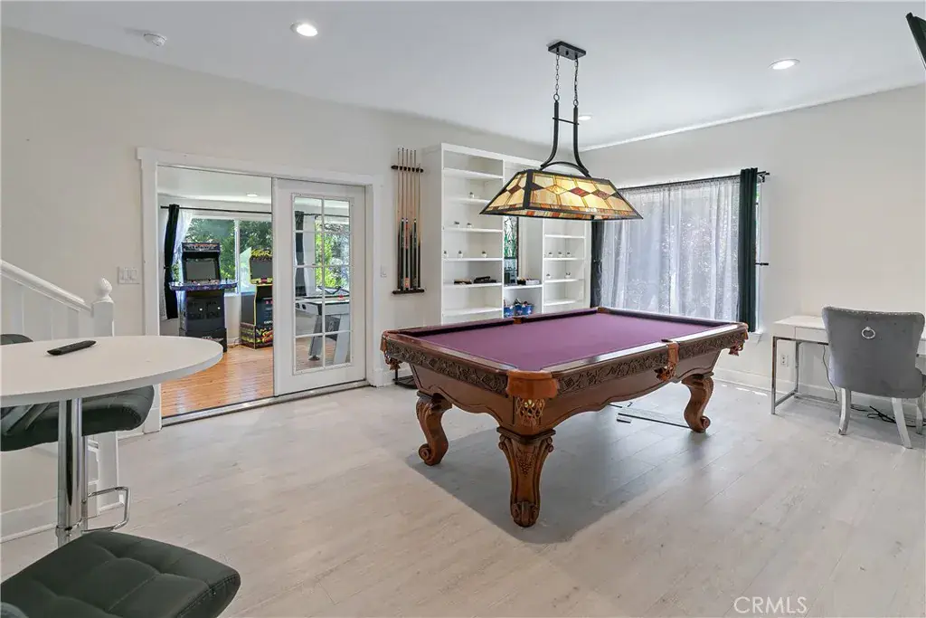 The mid-level features an entertainment family room with a wood-burning fireplace and bar. The ensuite master bedroom includes a gas fireplace, remodeled bath, and oversized closet. Two guest bedrooms and a full bath with an attached deck complete this level.