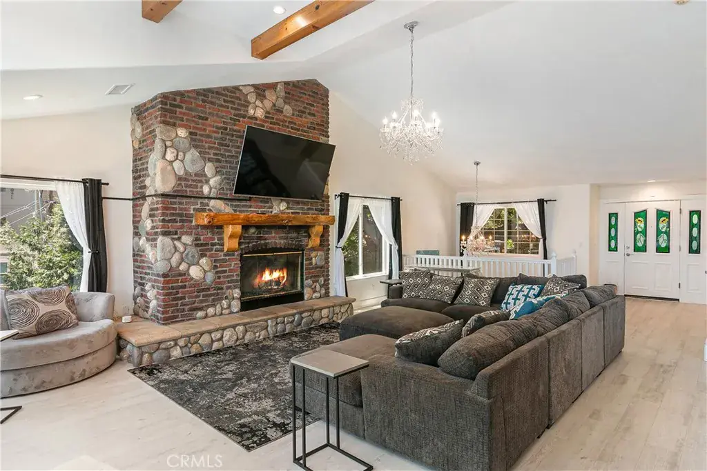 The level-entry home features a three-car garage and ample parking. The gated front courtyard, which now includes a newly added spa, is perfect for children to play or for gardening. Inside, the open living space boasts vaulted ceilings and new lighter wood flooring throughout. The living room, with its cozy river rock and brick fireplace, is bathed in natural light from large windows. The expansive dining room offers breathtaking views of snow-capped mountains.