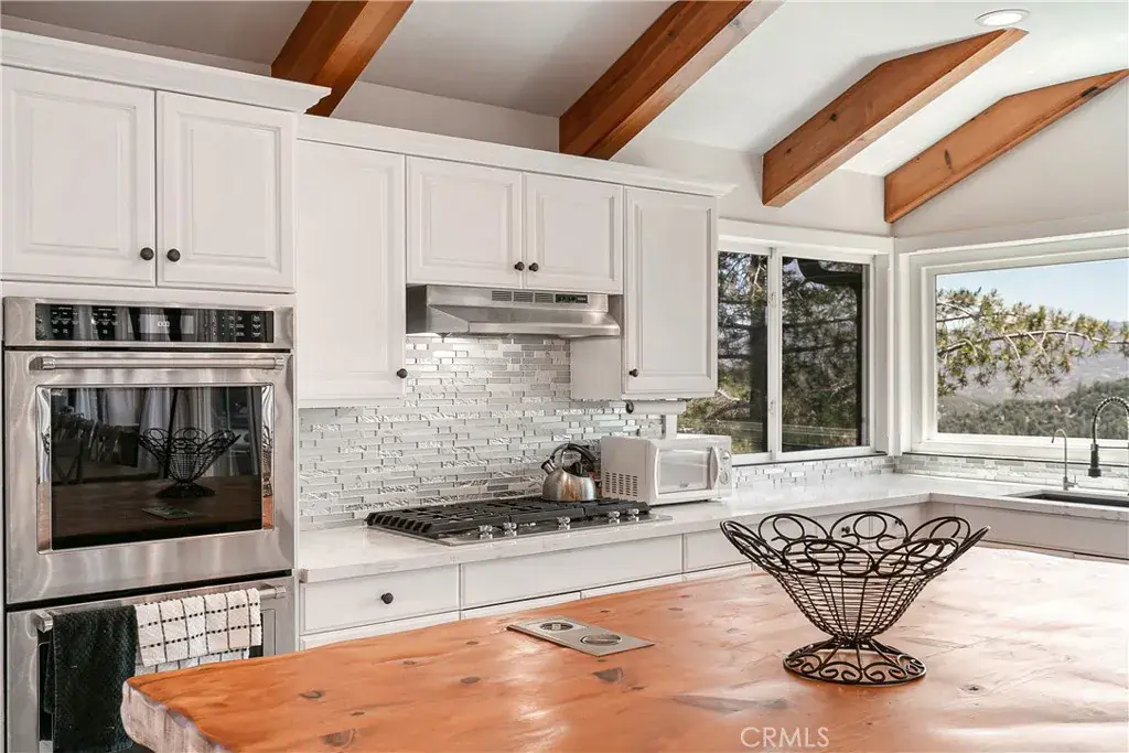 The kitchen strikes the perfect balance of modern and rustic with a live edge slab island. Washing dishes feels like you’re overlooking your own private lake and forest. The large deck provides ample space for dining and lounging while taking in the incredible views.