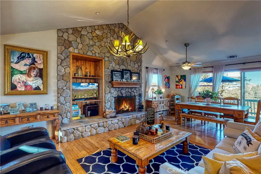 floor-to-ceiling rock fireplace, and custom built-in cabinetry that adds both character and functionality.