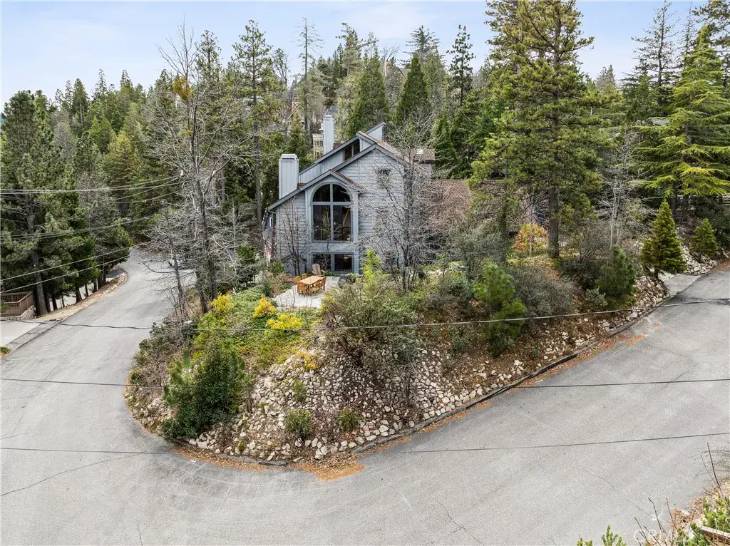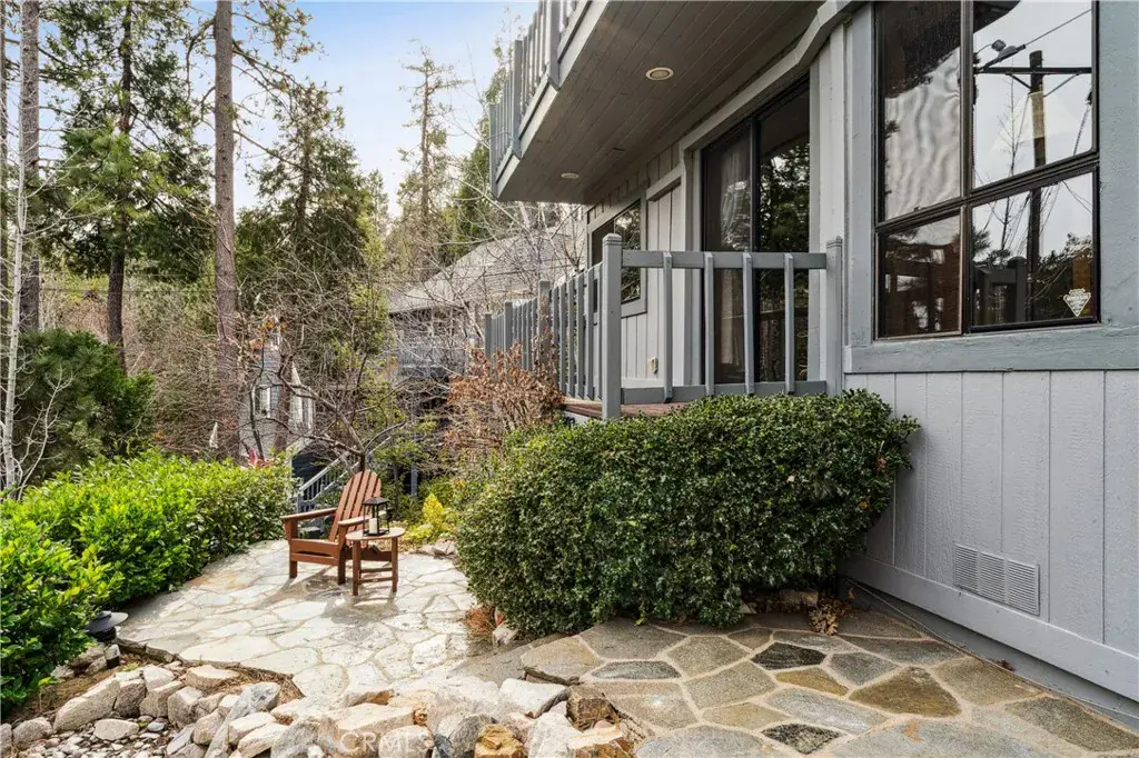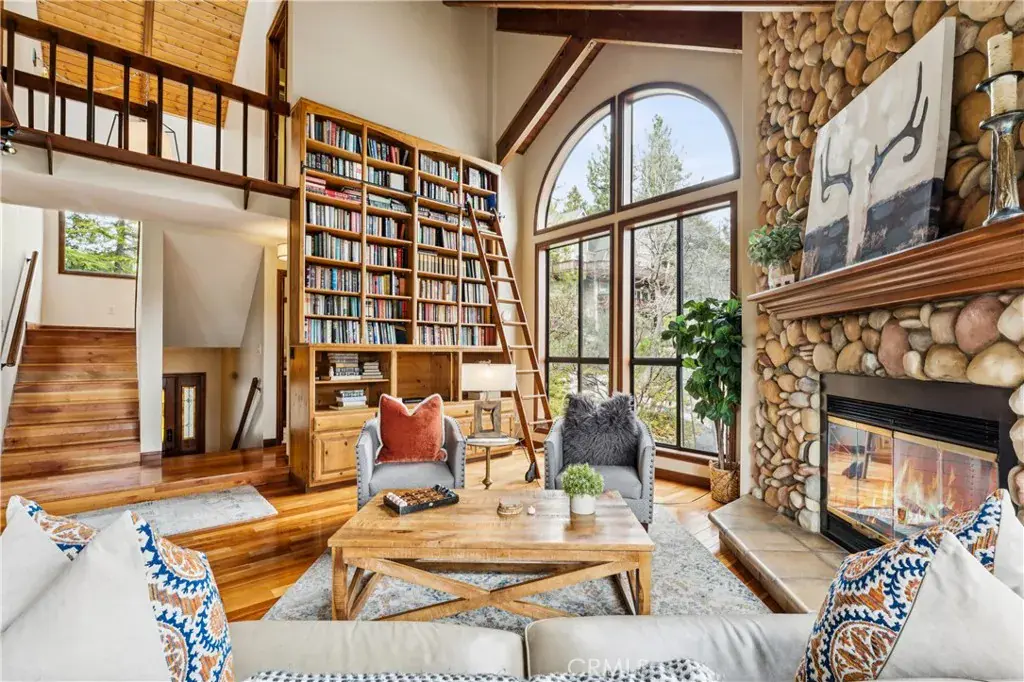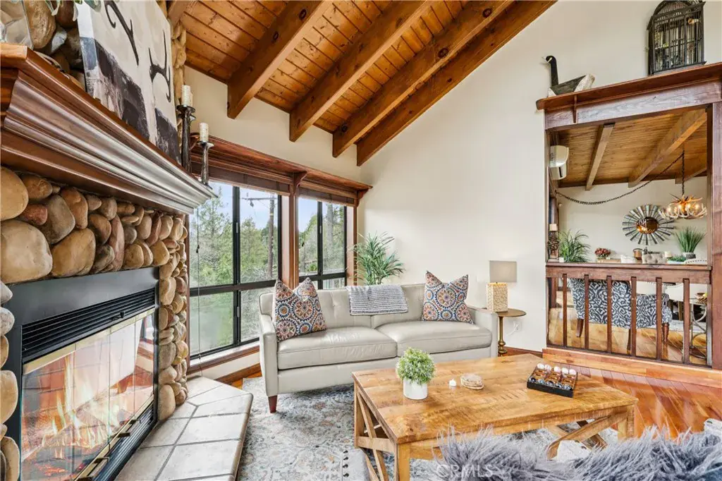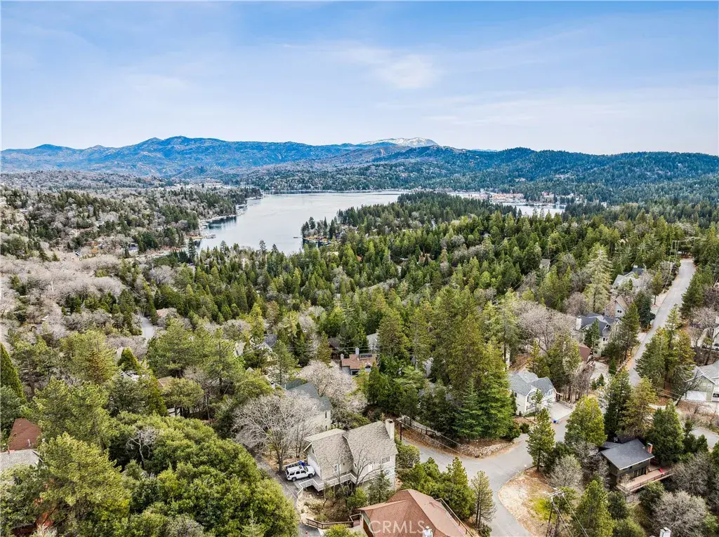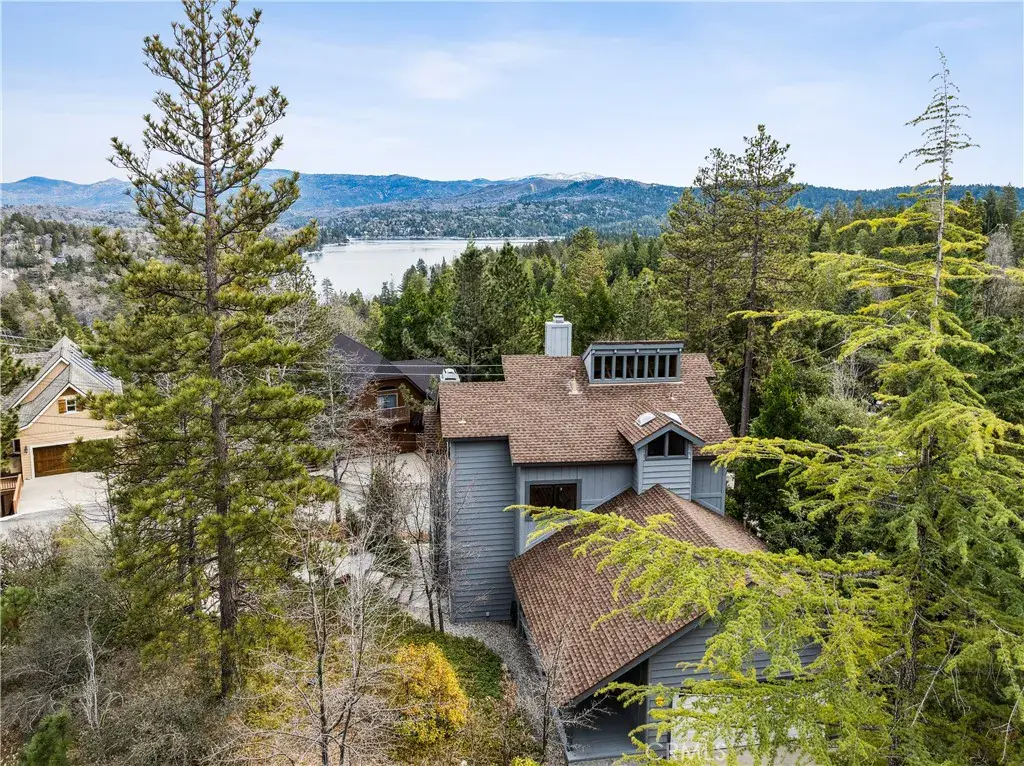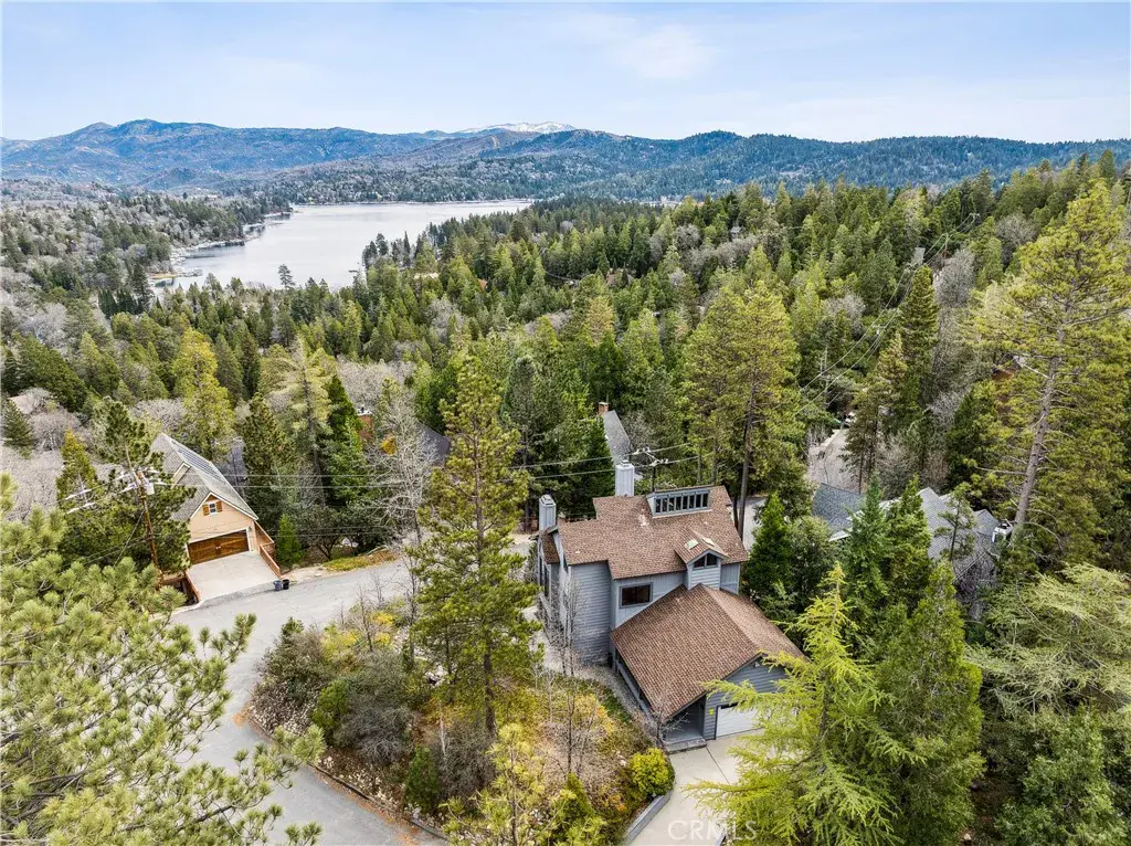 Need a little drama in your life – the good kind? Step into this stunning Lake Arrowhead retreat, where grand architecture meets mountain elegance. The living room is a showstopper, with soaring ceilings, a dramatic river rock fireplace, and floor-to-ceiling bookshelves that will delight any book lover. Arched windows frame views of evergreens and a peaceful outdoor water feature, setting the tone for this truly special home. Morning light filters through the trees as you wake to tranquil lake views from your bedroom, and evenings end by the fire or under starry skies on the deck. Just moments from private lake access and a quick drive to the Village, this home offers the perfect balance of seclusion and convenience. The open-concept main level was built for gathering, featuring a spacious kitchen with rich hardwood floors, generous cabinetry, a large pantry, stainless steel appliances and a large peninsula where everyone naturally comes together. The connected dining area opens to the deck—ideal for coffee, cocktails, or quiet conversation. Upstairs, the primary suite feels like a destination of its own: vaulted ceilings, a cozy fireplace, a spa-style bath, and your own balcony facing the lake. The lower level adds even more flexibility, with a bright family room, two additional bedrooms, a full bath, and a cheerful bunk room for guests. Outdoors, manicured landscaping, stone walkways, and a built-in gas BBQ make entertaining effortless. The oversized two-car garage includes an EV charger and laundry area, while the whole-house generator and multiple mini-split units keep things comfortable year-round. Offered fully furnished and beautifully maintained, this Lake Arrowhead home is one of a kind.