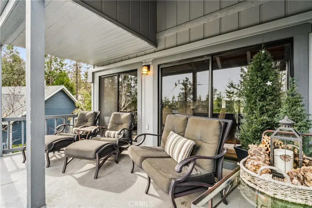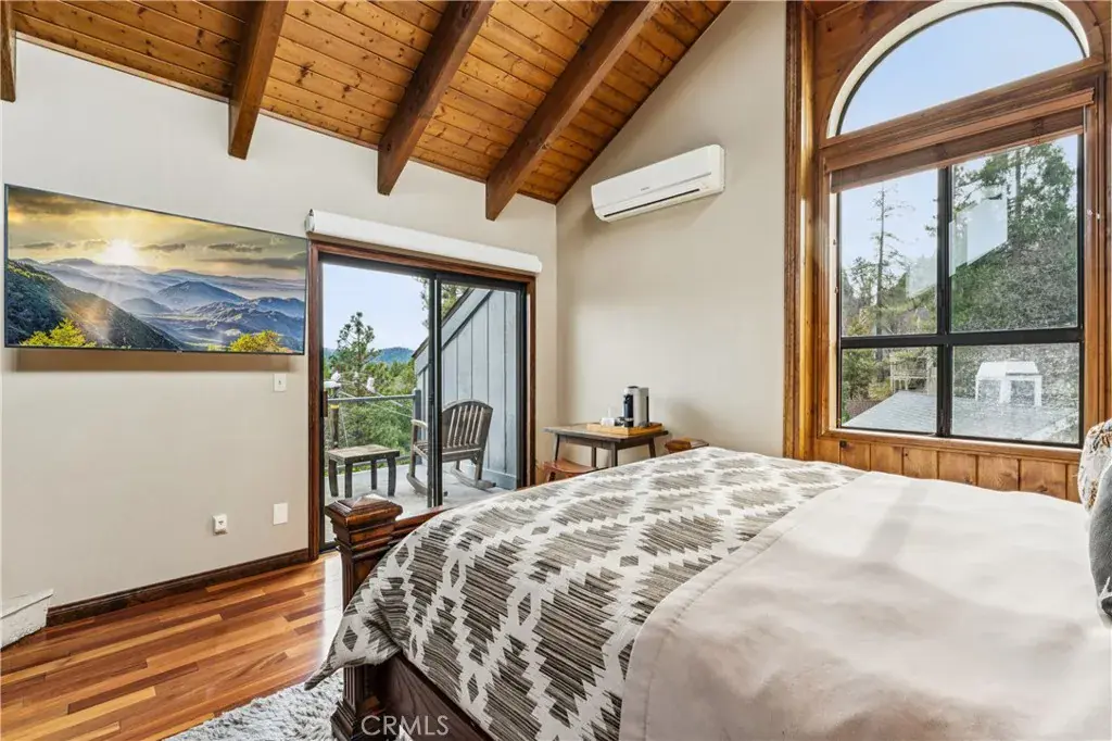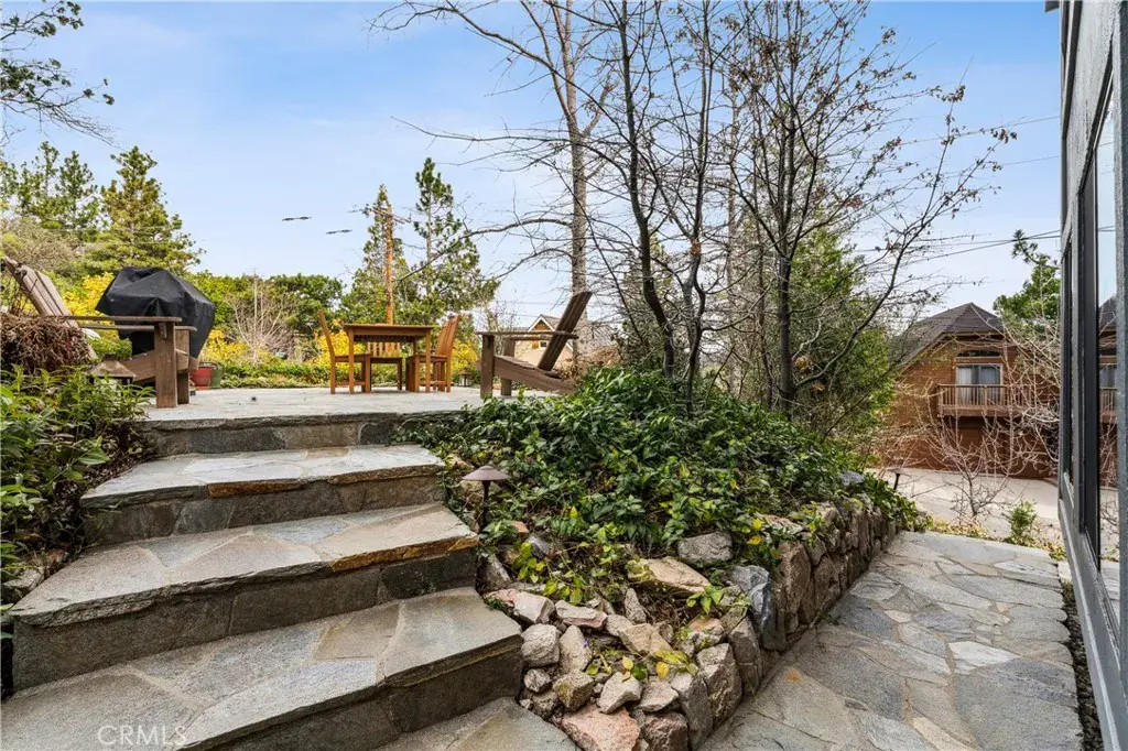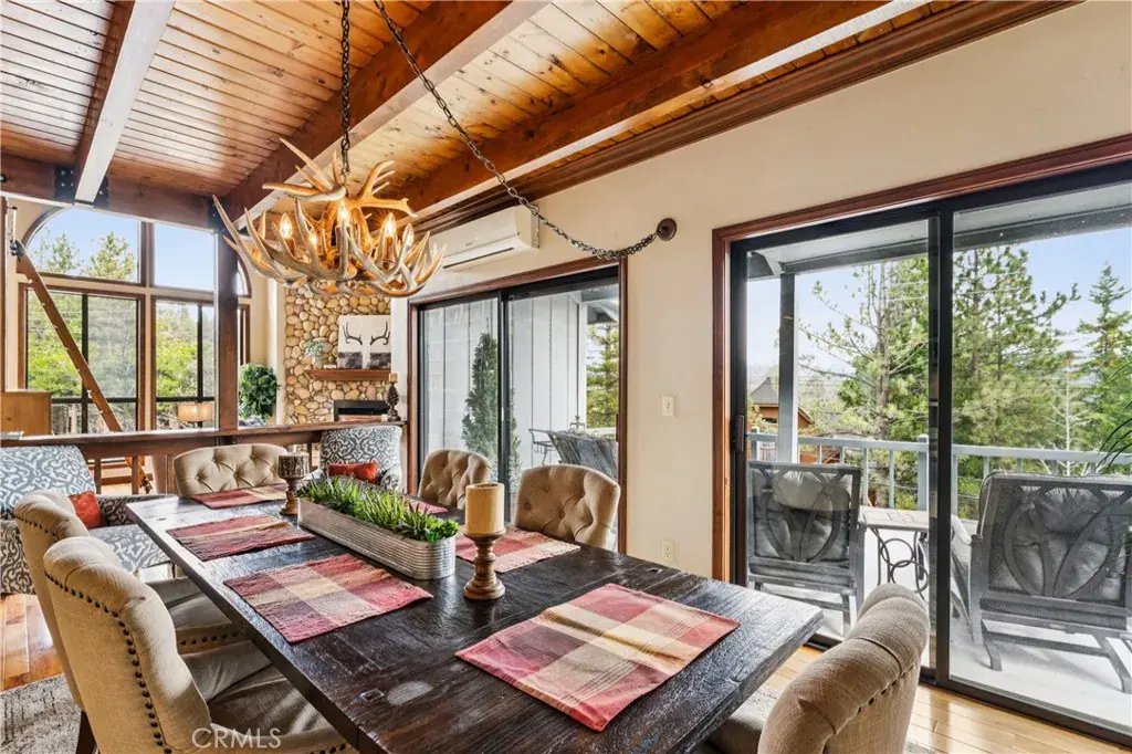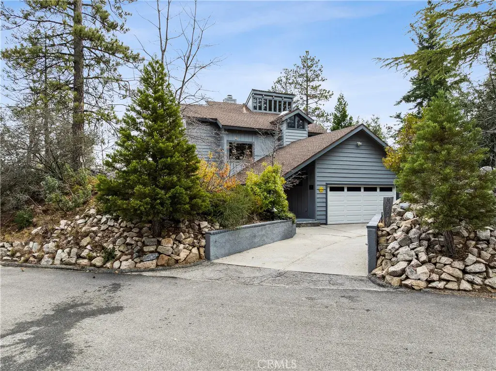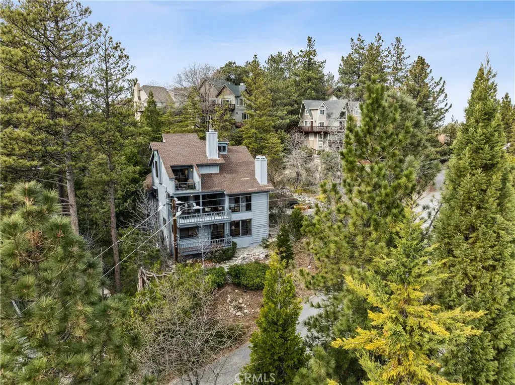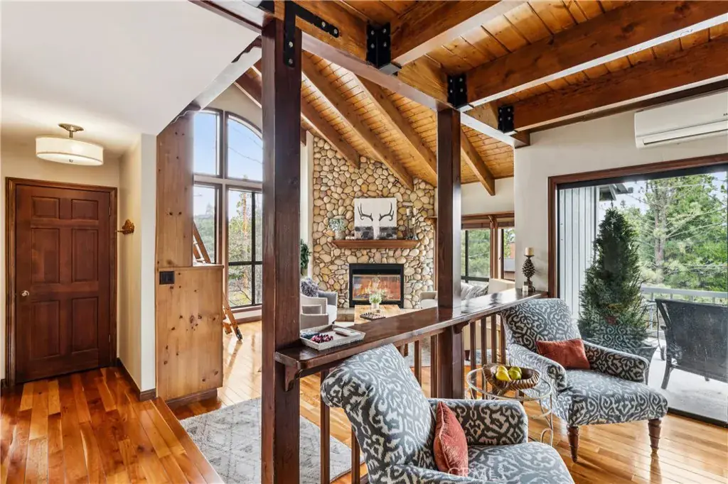Need a little drama in your life – the good kind? Step into this stunning Lake Arrowhead retreat, where grand architecture meets mountain elegance. The living room is a showstopper, with soaring ceilings, a dramatic river rock fireplace, and floor-to-ceiling bookshelves that will delight any book lover. Arched windows frame views of evergreens and a peaceful outdoor water feature, setting the tone for this truly special home. Morning light filters through the trees as you wake to tranquil lake views from your bedroom, and evenings end by the fire or under starry skies on the deck. Just moments from private lake access and a quick drive to the Village, this home offers the perfect balance of seclusion and convenience. The open-concept main level was built for gathering, featuring a spacious kitchen with rich hardwood floors, generous cabinetry, a large pantry, stainless steel appliances and a large peninsula where everyone naturally comes together. The connected dining area opens to the deck—ideal for coffee, cocktails, or quiet conversation. Upstairs, the primary suite feels like a destination of its own: vaulted ceilings, a cozy fireplace, a spa-style bath, and your own balcony facing the lake. The lower level adds even more flexibility, with a bright family room, two additional bedrooms, a full bath, and a cheerful bunk room for guests. Outdoors, manicured landscaping, stone walkways, and a built-in gas BBQ make entertaining effortless. The oversized two-car garage includes an EV charger and laundry area, while the whole-house generator and multiple mini-split units keep things comfortable year-round. Offered fully furnished and beautifully maintained, this Lake Arrowhead home is one of a kind.