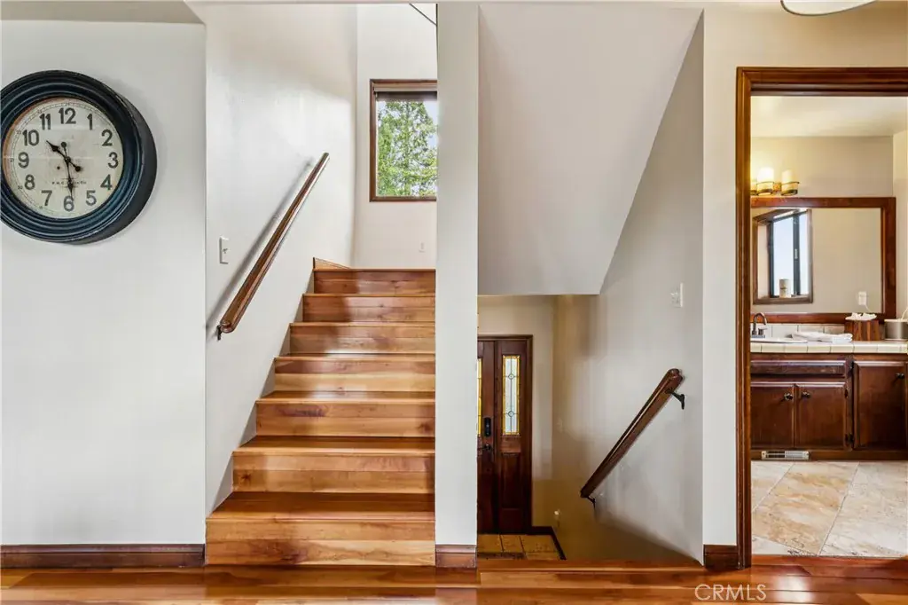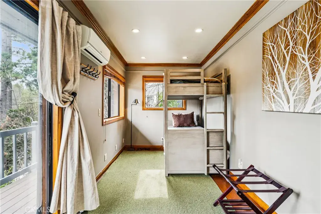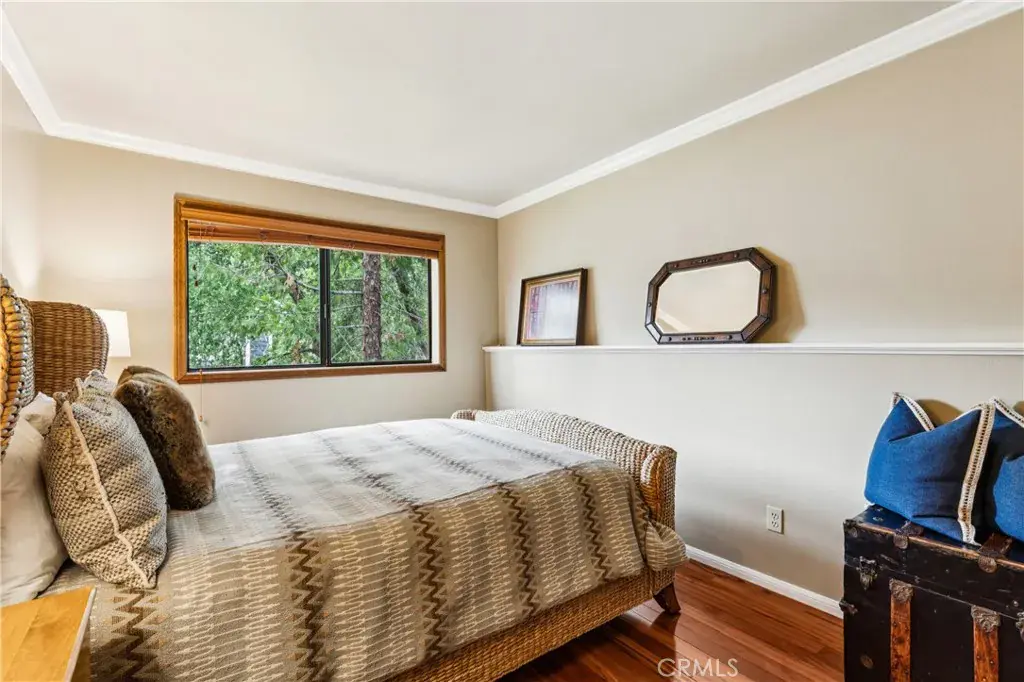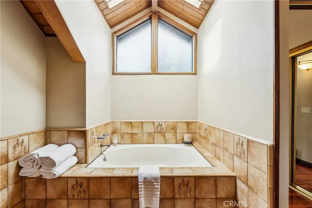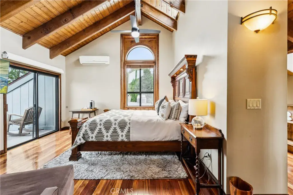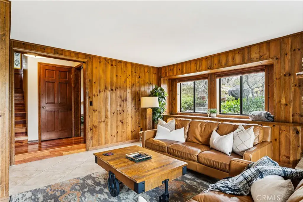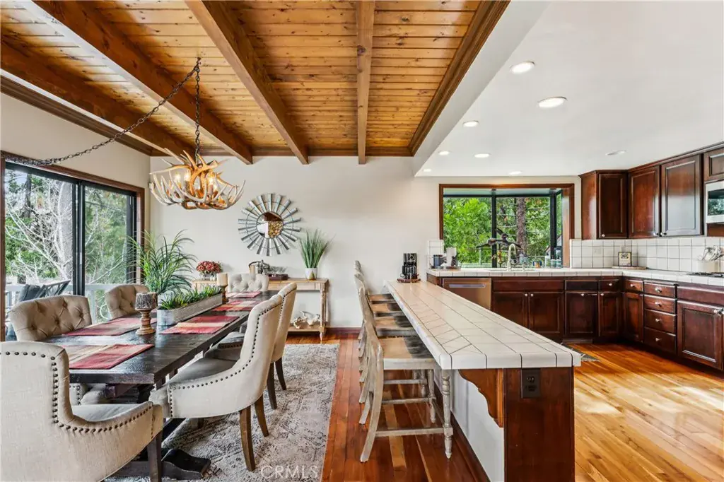 Need a little drama in your life – the good kind? Step into this stunning Lake Arrowhead retreat, where grand architecture meets mountain elegance. The living room is a showstopper, with soaring ceilings, a dramatic river rock fireplace, and floor-to-ceiling bookshelves that will delight any book lover. Arched windows frame views of evergreens and a peaceful outdoor water feature, setting the tone for this truly special home. Morning light filters through the trees as you wake to tranquil lake views from your bedroom, and evenings end by the fire or under starry skies on the deck. Just moments from private lake access and a quick drive to the Village, this home offers the perfect balance of seclusion and convenience. The open-concept main level was built for gathering, featuring a spacious kitchen with rich hardwood floors, generous cabinetry, a large pantry, stainless steel appliances and a large peninsula where everyone naturally comes together. The connected dining area opens to the deck—ideal for coffee, cocktails, or quiet conversation. Upstairs, the primary suite feels like a destination of its own: vaulted ceilings, a cozy fireplace, a spa-style bath, and your own balcony facing the lake. The lower level adds even more flexibility, with a bright family room, two additional bedrooms, a full bath, and a cheerful bunk room for guests. Outdoors, manicured landscaping, stone walkways, and a built-in gas BBQ make entertaining effortless. The oversized two-car garage includes an EV charger and laundry area, while the whole-house generator and multiple mini-split units keep things comfortable year-round. Offered fully furnished and beautifully maintained, this Lake Arrowhead home is one of a kind.