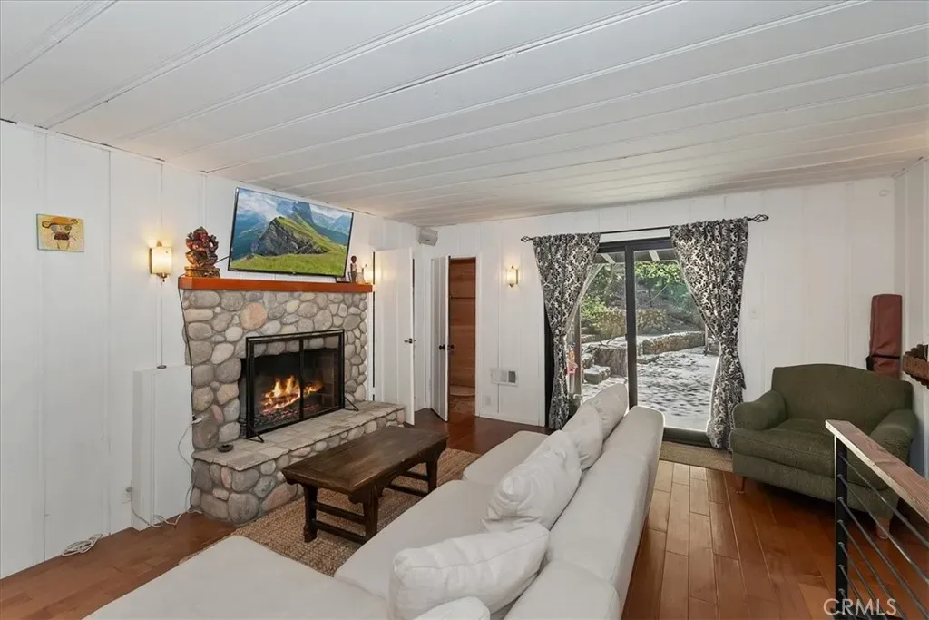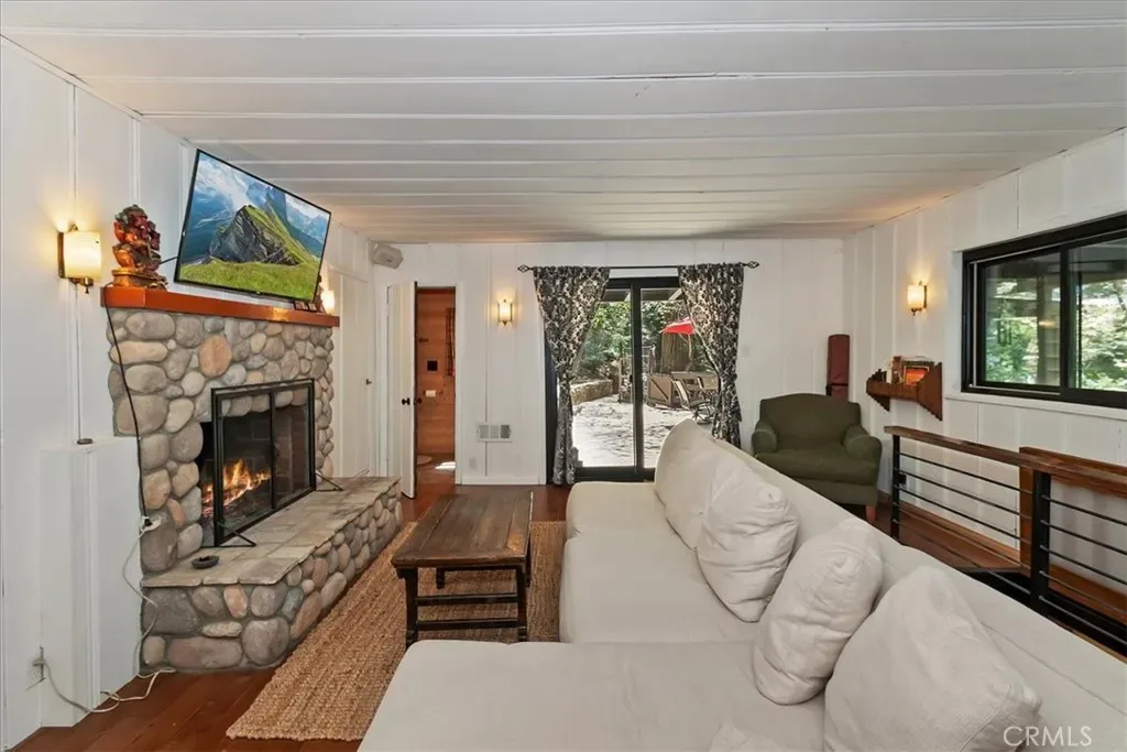 Inside, the home features a warm and inviting living space highlighted by vaulted ceilings and a cozy fireplace, creating an ideal atmosphere for relaxing or entertaining. Large windows bring in natural light and showcase the surrounding forest views. The layout includes two bedrooms and two bathrooms, offering comfortable accommodations for both residents and guests.