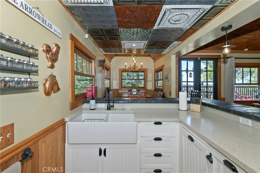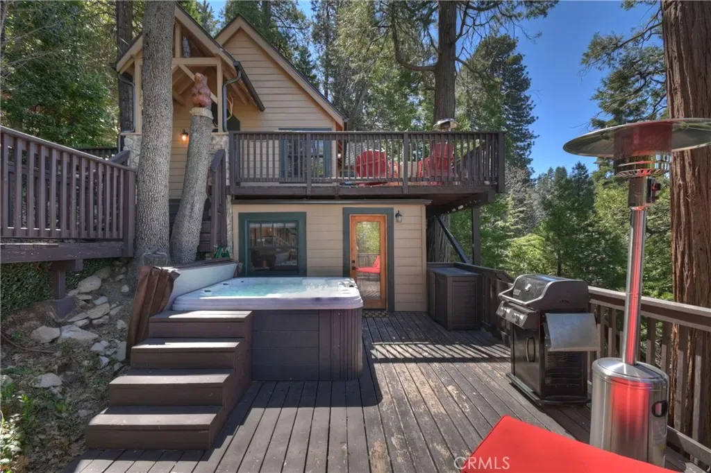 Step into a piece of Lake Arrowhead history with this charming and storied 1924 cabin, rumored to have once served as the hideout of a local bootlegger during the days of Prohibition ~ Today, this one-of-a-kind retreat has been thoughtfully refurbished in 2021, blending historic charm with stylish modern updates. Tucked away on the remote and exclusive southeast side of Lake Arrowhead, this cozy cabin offers a rare sense of seclusion while still being within reach of everything the mountain has to offer ~ You’ll find approximately 1,000 square feet of gated deck space designed for outdoor living and entertaining ~ Enjoy the year-round hot tub spa, BBQ area, and fire pit while taking in breathtaking lake views and unforgettable sunset skies ~ The upper deck offers one of the most captivating vantage points of the lake, while fall brings a spectacular display as nearby maple trees turn vibrant shades of gold and crimson ~ On the 4th of July the night sky will come alive ~ Inside, the architect-owner infused the cabin with thoughtful design elements that complement its historic roots with a rustic tin ceiling in the kitchen, a farmhouse sink, and modern industrial lighting create a warm yet refined mountain aesthetic ~ The home is adorned with local mountain artwork, vintage photographs, and curated antiques that add character throughout ~ Relax and unwind in the copper clawfoot tub beneath a large skylight, where you can soak while gazing up at the treetops and star lit skies ~ In warmer months, enjoy the private outdoor cedar shower surrounded by pines for a true mountain retreat experience ~ Evenings are best spent curled up beside the original stone fireplace, complete with an oak tree trunk mantle ~ Whether you’re searching for a romantic getaway, a peaceful mountain escape, successful investment, or a unique property rich with history and character, this special cabin offers the perfect opportunity to make it your own and create memories for generations to come.