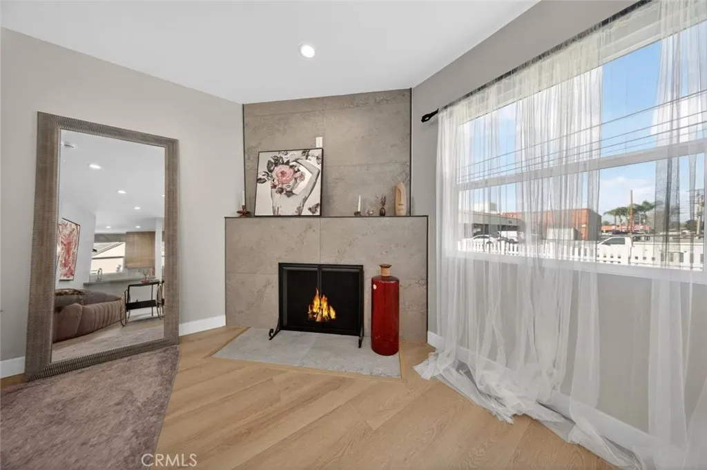 The kitchen is a true centerpiece, featuring custom wood cabinetry, quartz countertops, brand-new stainless steel smart appliances, and LED dimmable recessed lighting that creates a warm and inviting atmosphere. The living area is enhanced by a decorative wood-burning fireplace, while a Nest smart thermostat provides modern climate control. For electric vehicle owners, a 220V EV charging outlet is already installed.