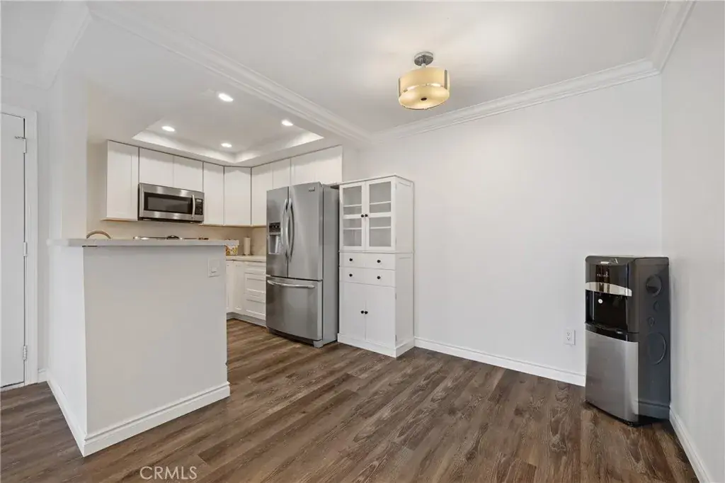 RECENTLY RENOVATED. FIRST LEVEL. CORNER UNIT. REFRIGERATOR, WASHER/DRYER INCLUDED. This is an excellent opportunity for first-time buyers seeking a move-in-ready home with modern finishes and low-maintenance living in a gated community. The home features luxury vinyl plank wood-look flooring throughout, accented by tall baseboards, crown molding, and recessed lighting. The updated kitchen is bright and functional, showcasing white shaker cabinetry, quartz countertops, and stainless steel appliances, including a refrigerator.