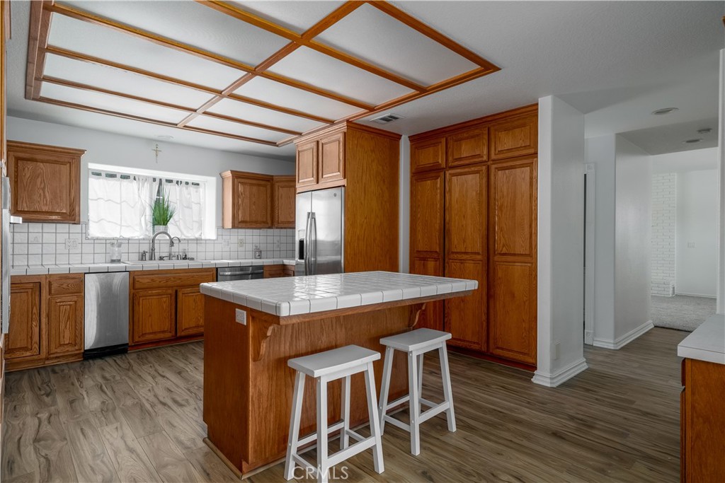 The kitchen is equipped with upgraded appliances including a newer oven, stovetop, microwave, trash compactor, dishwasher, and refrigerator, making it both functional and convenient for everyday living.