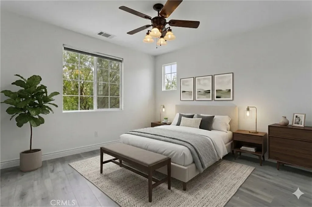 The backyard is a true private retreat, featuring a covered patio, custom saltwater pool and spa with security gate, and a tiered astro-turfed area anchored by a mature California Pepper tree. Enjoy sweeping valley views with no rear neighbors. Low HOA dues provide access to outstanding community amenities, including sports fields, basketball, baseball, football, and tennis courts, a dog park, and children’s playground.