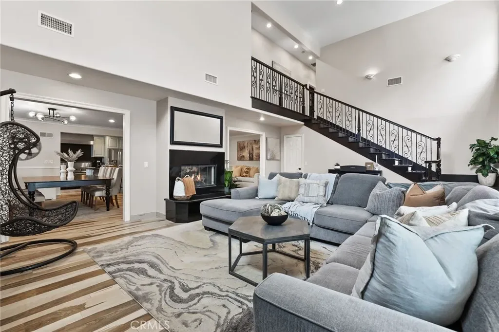 This is not your typical home in Lake Forest. From the moment you enter, the scale is undeniable. A grand great room unfolds at the entry—seamlessly connecting the living room, dining area, and kitchen in one expansive, open-concept space designed for both entertaining and everyday living. Just beyond, a dramatic family room with soaring ceilings creates a second impressive gathering space. Connected by a dual-sided fireplace and subtle architectural separation, the layout offers a rare balance of openness and defined living areas. The kitchen is designed for both function and presence, featuring a 48-inch Viking double oven range, professional-grade ventilation hood, premium black granite slab countertops, and a centralized island with integrated storage, complemented by custom painted cabinetry. Designed with flexibility in mind, the home features a spacious main-level suite with a private retreat—ideal for multi-generational living, extended guests, or a private sanctuary. Two additional downstairs rooms provide excellent options for dual offices, a gym, or creative space. Upstairs, the primary suite offers an oversized retreat with vaulted ceilings, a cozy fireplace with marble hearth, walk-in closet with custom organizers, and barn door detail. The fully remodeled primary bath showcases custom cabinetry, a separate shower, and a freestanding soaking tub. Secondary bathrooms are upgraded with marble/stone vanities, paneled walls, and updated fixtures. Step outside to expansive, private grounds with no immediate neighbors, featuring a large yard with professional hardscaping, artificial grass, covered area and dedicated plumbing for a future outdoor spa. While the home presents an opportunity to personalize finishes over time, its true value lies in what cannot be easily replicated—its size, layout, and presence. With a private setting, PAID SOLAR, fully RE-PIPED and modern systems already in place, this is a rare opportunity to own one of the largest and most versatile homes in South Lake Forest.