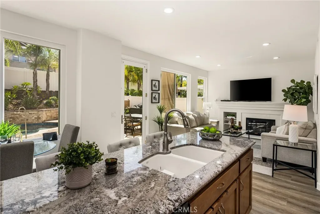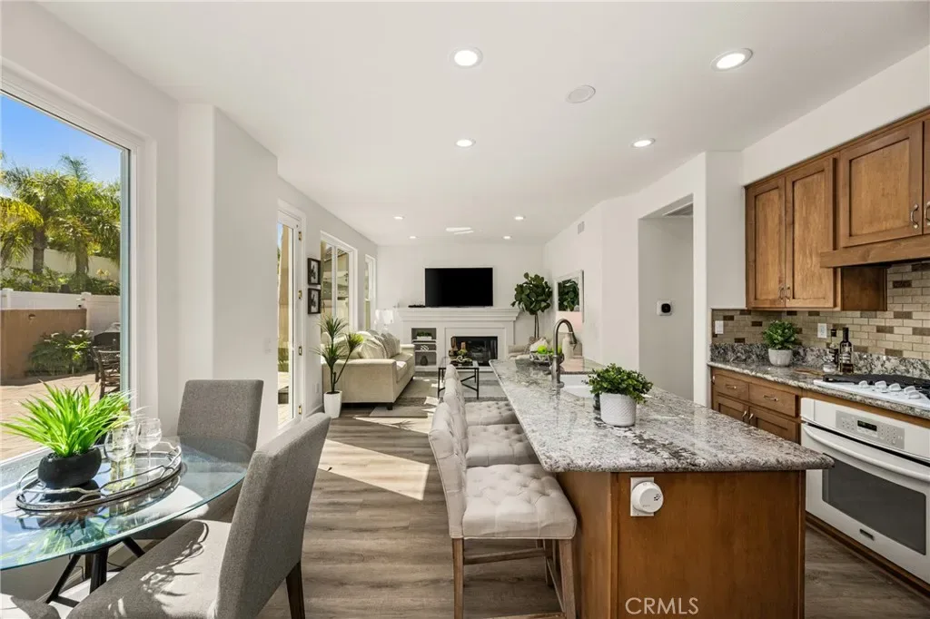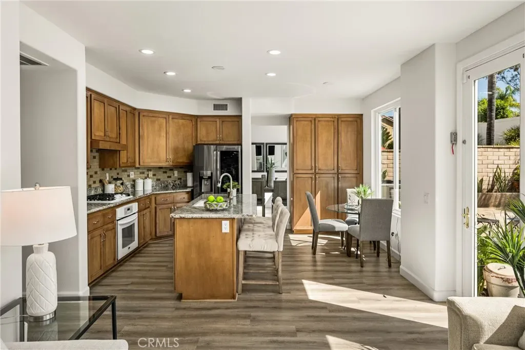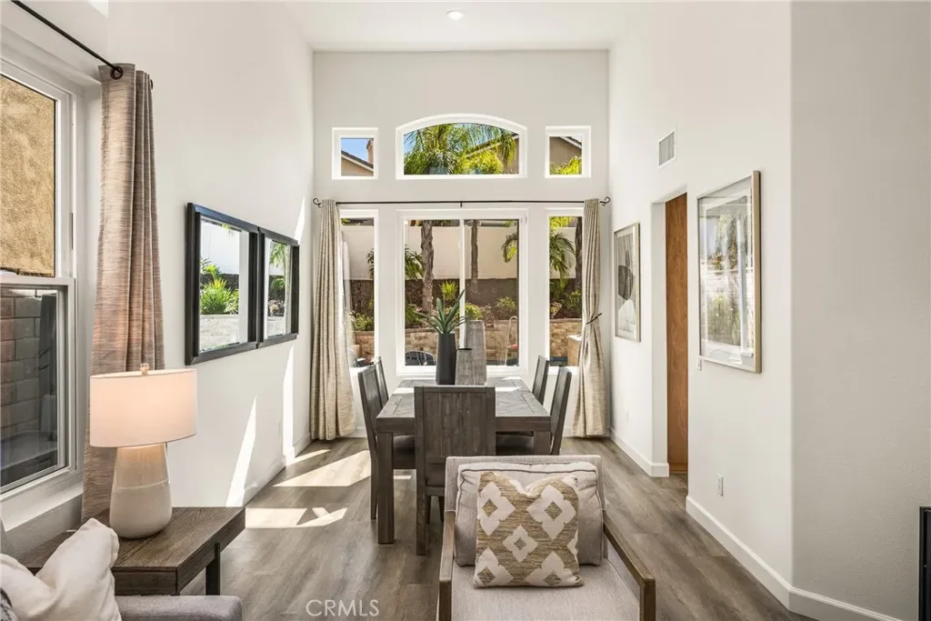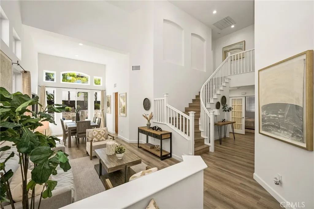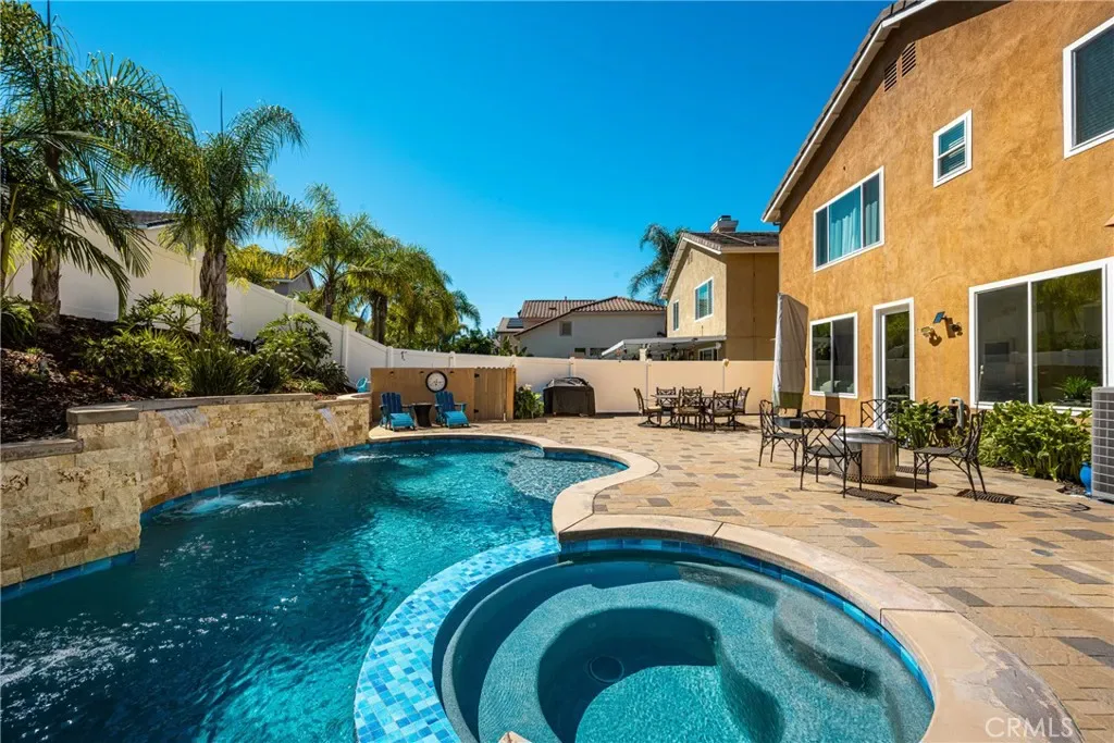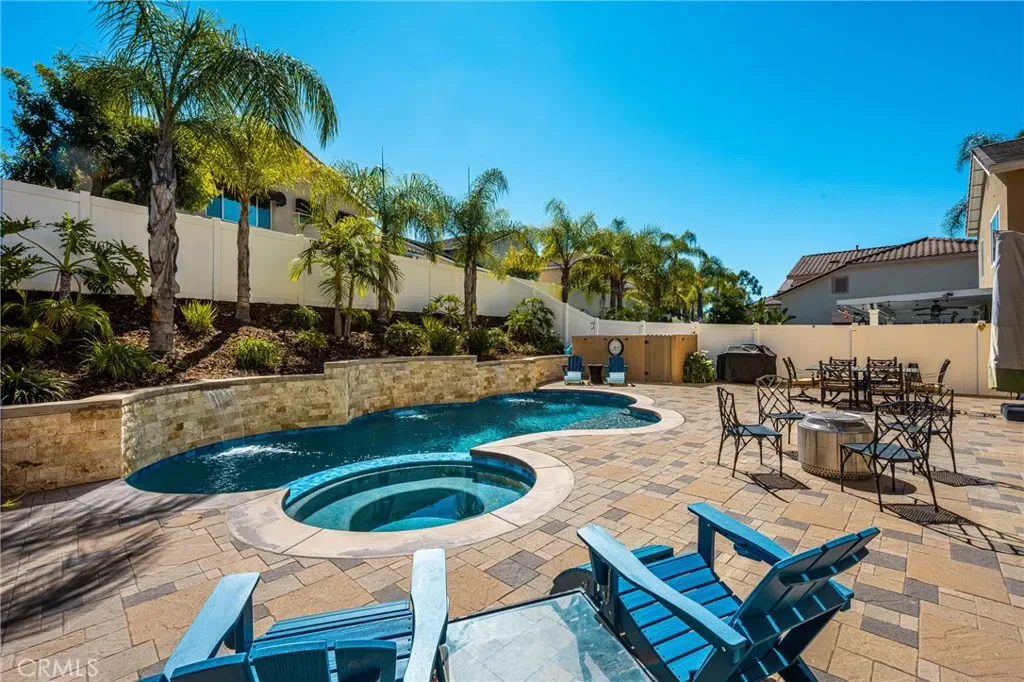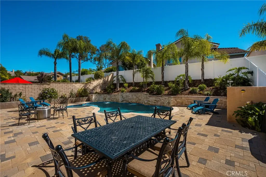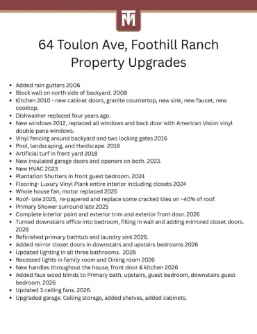 Beautifully upgraded and move-in ready, this Foothill Ranch home offers a flexible and highly desirable floor plan featuring a downstairs bedroom and full bath, ideal for guests, multigenerational living, or a private home office. Step inside to a light-filled living room with soaring ceilings and walls of windows, creating an open and inviting atmosphere. The home has been thoughtfully updated with new luxury vinyl plank flooring (2024), fresh interior paint (2026), updated lighting, and recessed lighting in the family and dining rooms. The remodeled kitchen features custom wood cabinetry, granite countertops, stainless steel appliances, a pantry cabinet, and a center island with seating, along with a functional layout that opens to the family room—perfect for everyday living and entertaining. The adjacent breakfast nook overlooks the resort-style backyard, offering views of the saltwater pool and spa with a polished PebbleTec surface and a beautifully landscaped slope with palm trees and colorful flowers. Upstairs, the primary suite is a relaxing retreat with high ceilings, a ceiling fan, dual vanities, a separate shower, soaking tub, and a spacious walk-in closet with mirrored wardrobes. Two additional bedrooms share a full bathroom with dual vanities, and a convenient upstairs laundry room with sink adds everyday ease. Additional improvements include new HVAC (2023), roof updates (2025), whole house fan, insulated garage doors, and built-in garage storage. The backyard is designed for both entertaining and relaxation, featuring a sparkling pool and spa, brick paver patio, planters, and generous space for dining, lounging, BBQing, and play. Block wall and vinyl fencing provide enhanced privacy, while the deep, wide lot with an elevated slope creates a unique sense of openness. Conveniently located near parks, hiking and biking trails, shopping, dining, and top-rated schools, this home offers the perfect blend of comfort, style, and functionality.