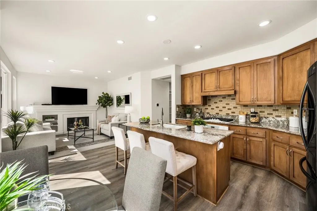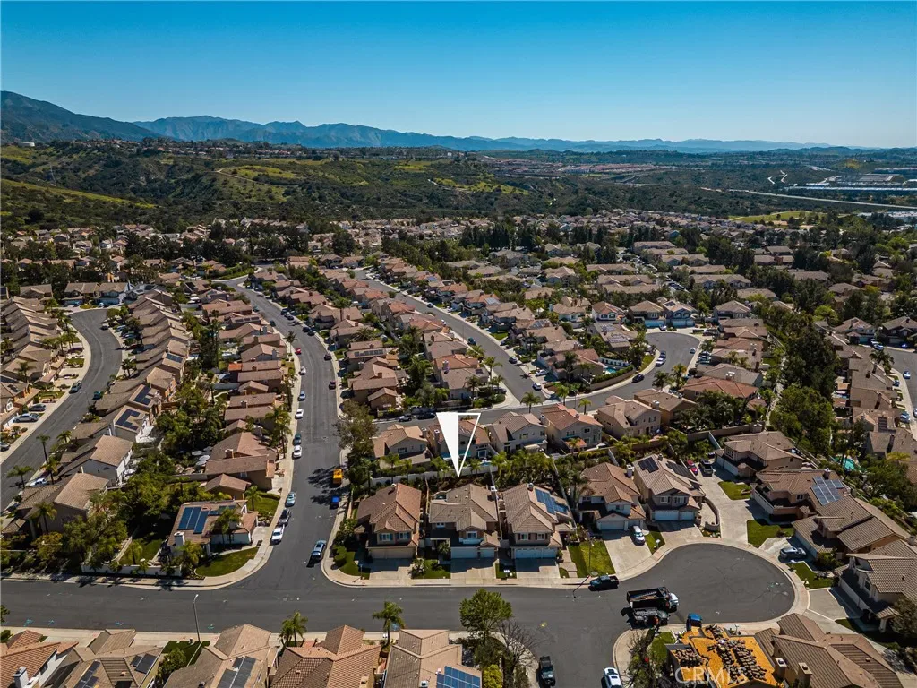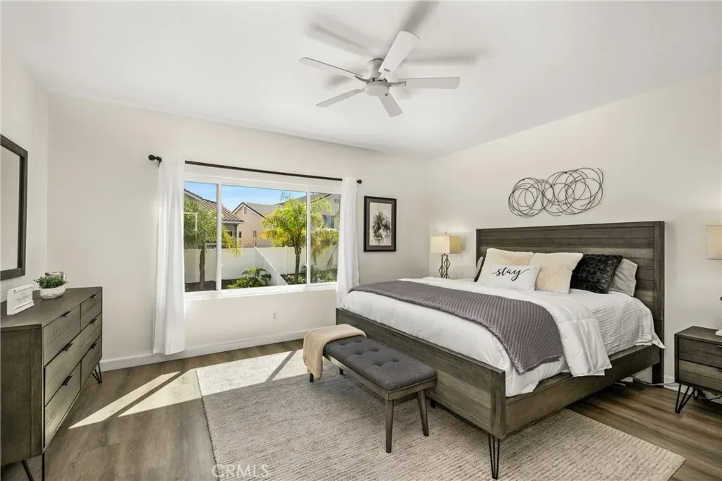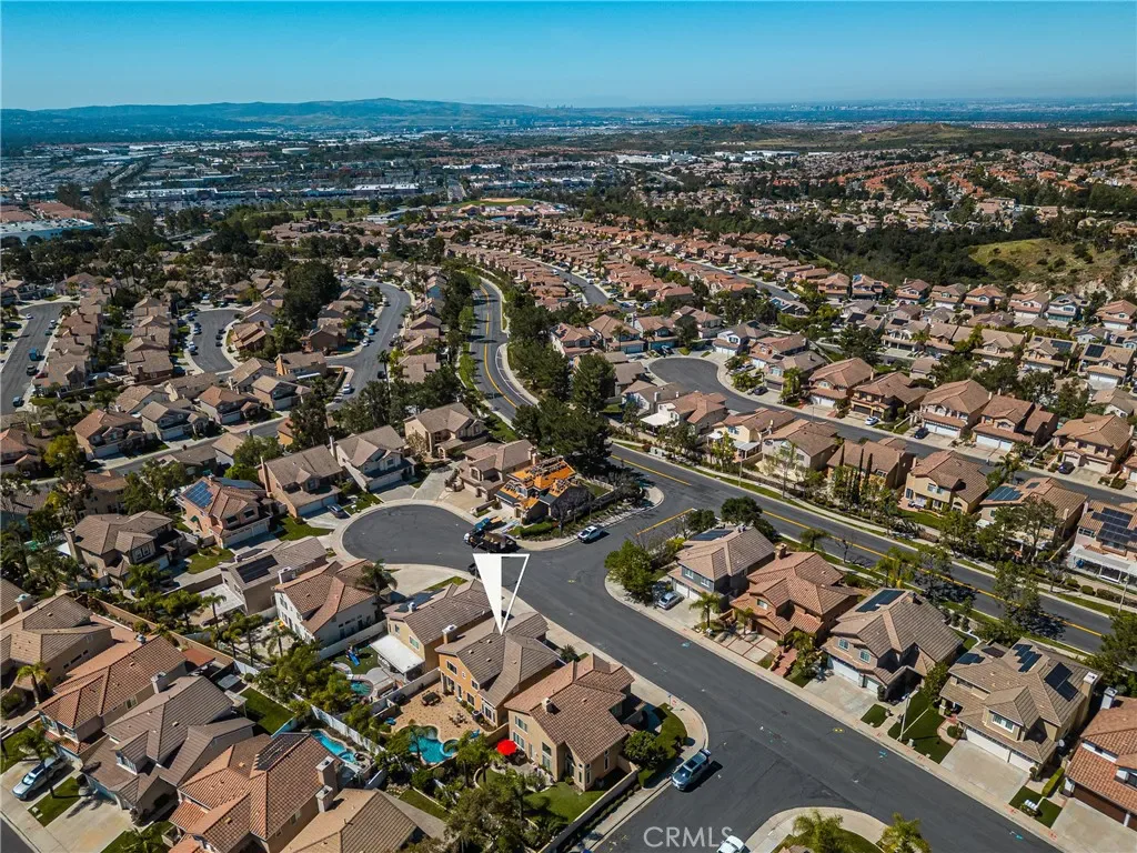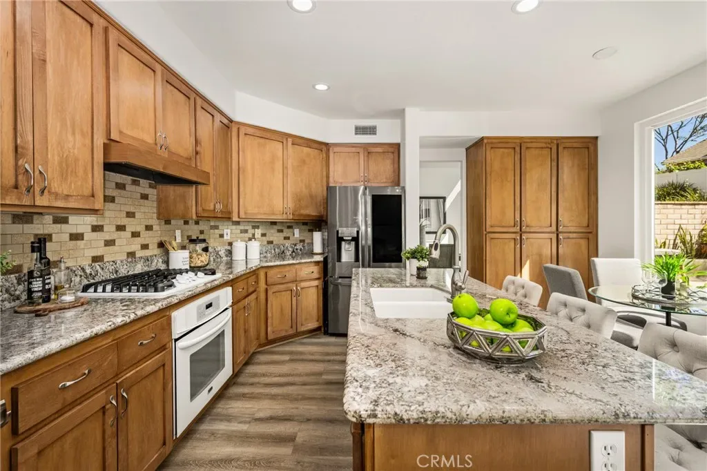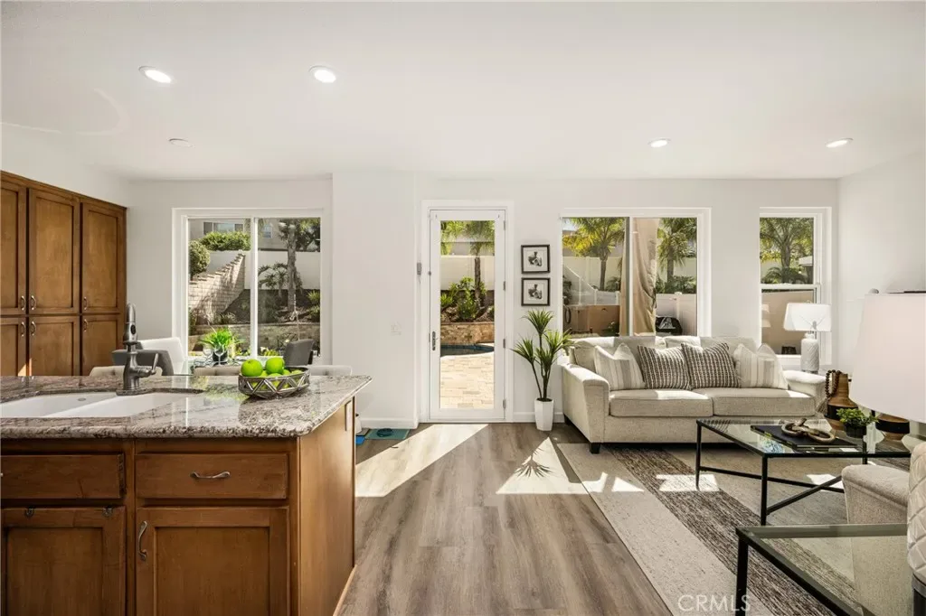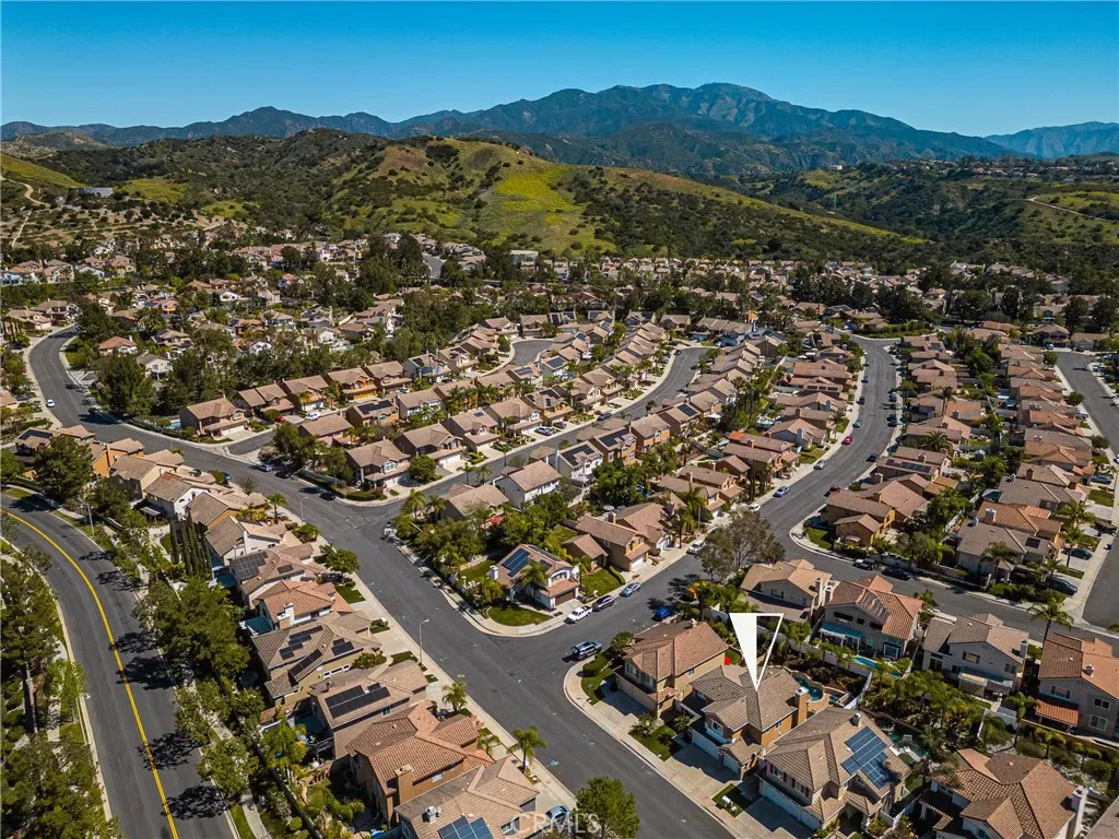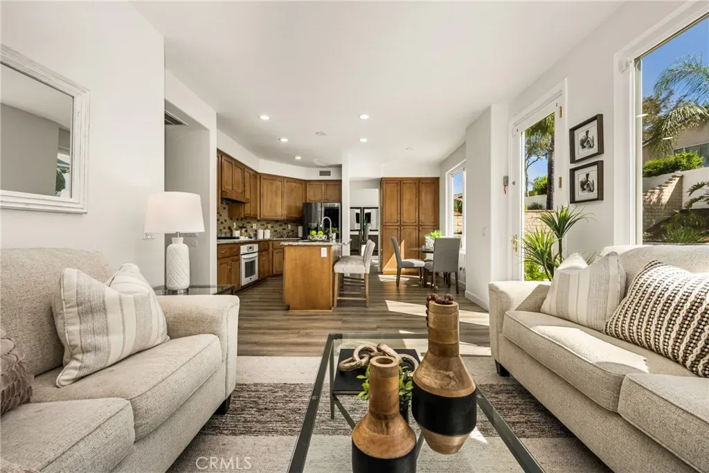 Beautifully upgraded and move-in ready, this Foothill Ranch home offers a flexible and highly desirable floor plan featuring a downstairs bedroom and full bath, ideal for guests, multigenerational living, or a private home office. Step inside to a light-filled living room with soaring ceilings and walls of windows, creating an open and inviting atmosphere. The home has been thoughtfully updated with new luxury vinyl plank flooring (2024), fresh interior paint (2026), updated lighting, and recessed lighting in the family and dining rooms. The remodeled kitchen features custom wood cabinetry, granite countertops, stainless steel appliances, a pantry cabinet, and a center island with seating, along with a functional layout that opens to the family room—perfect for everyday living and entertaining. The adjacent breakfast nook overlooks the resort-style backyard, offering views of the saltwater pool and spa with a polished PebbleTec surface and a beautifully landscaped slope with palm trees and colorful flowers. Upstairs, the primary suite is a relaxing retreat with high ceilings, a ceiling fan, dual vanities, a separate shower, soaking tub, and a spacious walk-in closet with mirrored wardrobes. Two additional bedrooms share a full bathroom with dual vanities, and a convenient upstairs laundry room with sink adds everyday ease. Additional improvements include new HVAC (2023), roof updates (2025), whole house fan, insulated garage doors, and built-in garage storage. The backyard is designed for both entertaining and relaxation, featuring a sparkling pool and spa, brick paver patio, planters, and generous space for dining, lounging, BBQing, and play. Block wall and vinyl fencing provide enhanced privacy, while the deep, wide lot with an elevated slope creates a unique sense of openness. Conveniently located near parks, hiking and biking trails, shopping, dining, and top-rated schools, this home offers the perfect blend of comfort, style, and functionality.