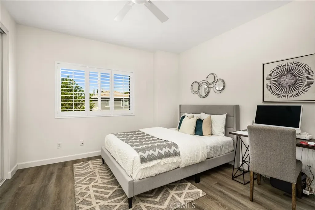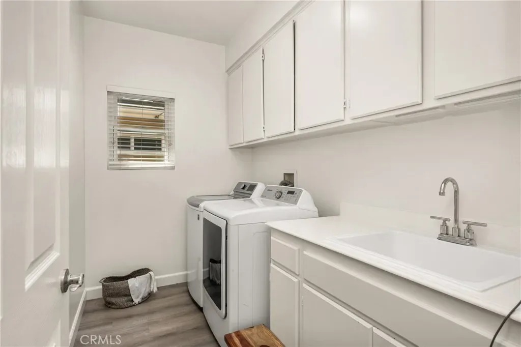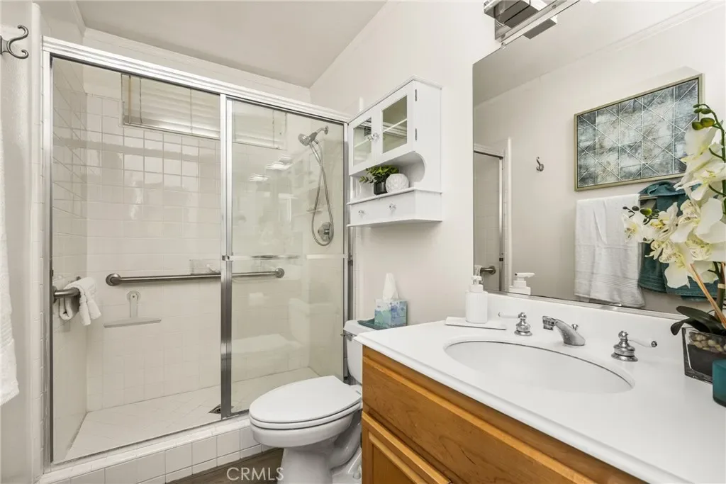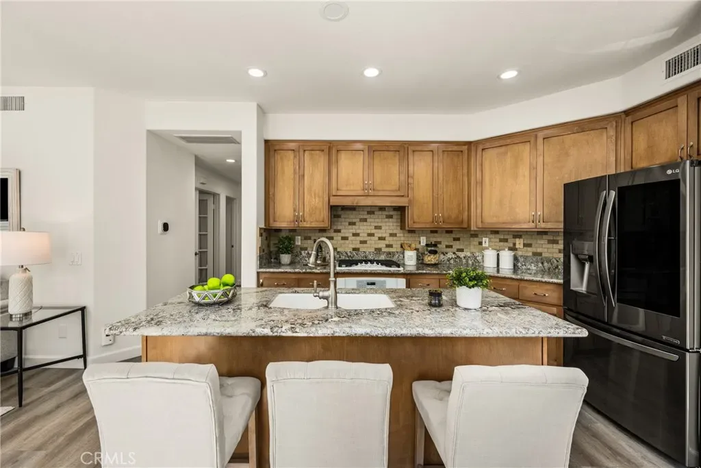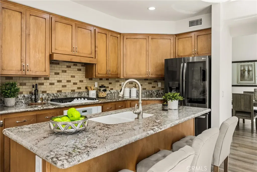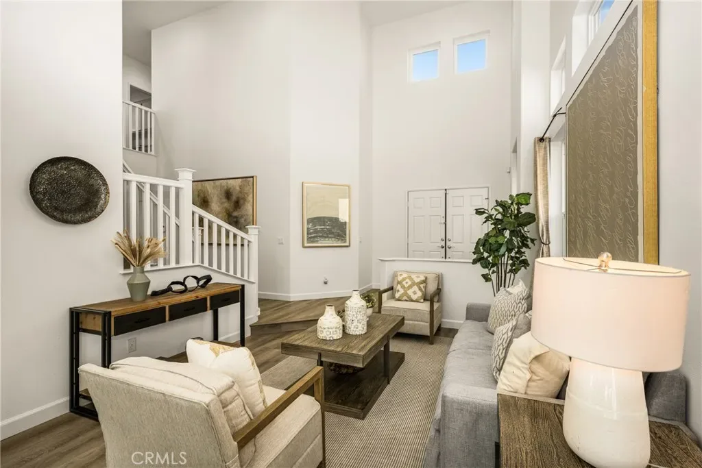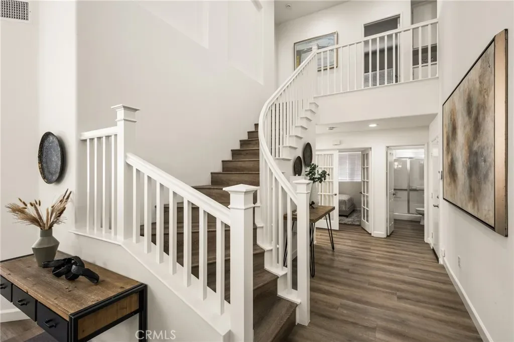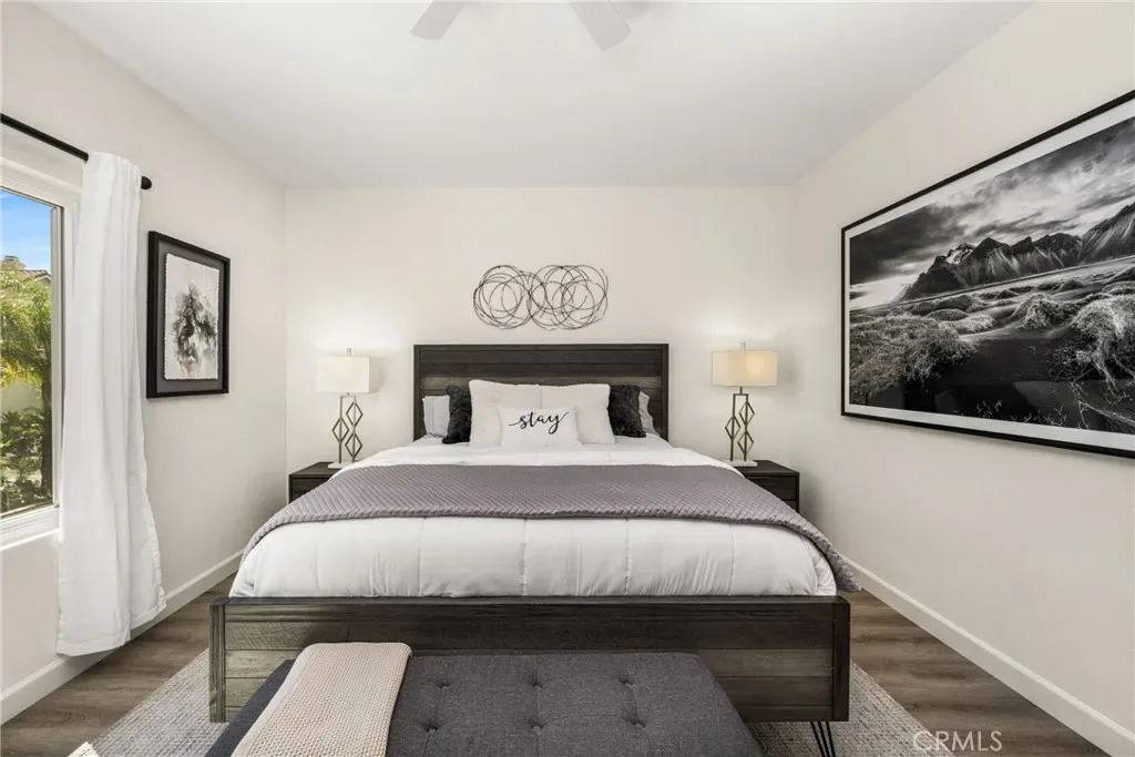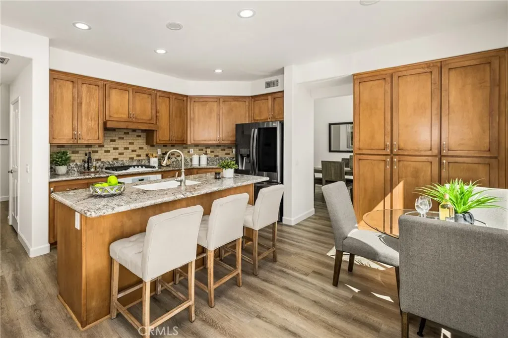 Beautifully upgraded and move-in ready, this Foothill Ranch home offers a flexible and highly desirable floor plan featuring a downstairs bedroom and full bath, ideal for guests, multigenerational living, or a private home office. Step inside to a light-filled living room with soaring ceilings and walls of windows, creating an open and inviting atmosphere. The home has been thoughtfully updated with new luxury vinyl plank flooring (2024), fresh interior paint (2026), updated lighting, and recessed lighting in the family and dining rooms. The remodeled kitchen features custom wood cabinetry, granite countertops, stainless steel appliances, a pantry cabinet, and a center island with seating, along with a functional layout that opens to the family room—perfect for everyday living and entertaining. The adjacent breakfast nook overlooks the resort-style backyard, offering views of the saltwater pool and spa with a polished PebbleTec surface and a beautifully landscaped slope with palm trees and colorful flowers. Upstairs, the primary suite is a relaxing retreat with high ceilings, a ceiling fan, dual vanities, a separate shower, soaking tub, and a spacious walk-in closet with mirrored wardrobes. Two additional bedrooms share a full bathroom with dual vanities, and a convenient upstairs laundry room with sink adds everyday ease. Additional improvements include new HVAC (2023), roof updates (2025), whole house fan, insulated garage doors, and built-in garage storage. The backyard is designed for both entertaining and relaxation, featuring a sparkling pool and spa, brick paver patio, planters, and generous space for dining, lounging, BBQing, and play. Block wall and vinyl fencing provide enhanced privacy, while the deep, wide lot with an elevated slope creates a unique sense of openness. Conveniently located near parks, hiking and biking trails, shopping, dining, and top-rated schools, this home offers the perfect blend of comfort, style, and functionality.