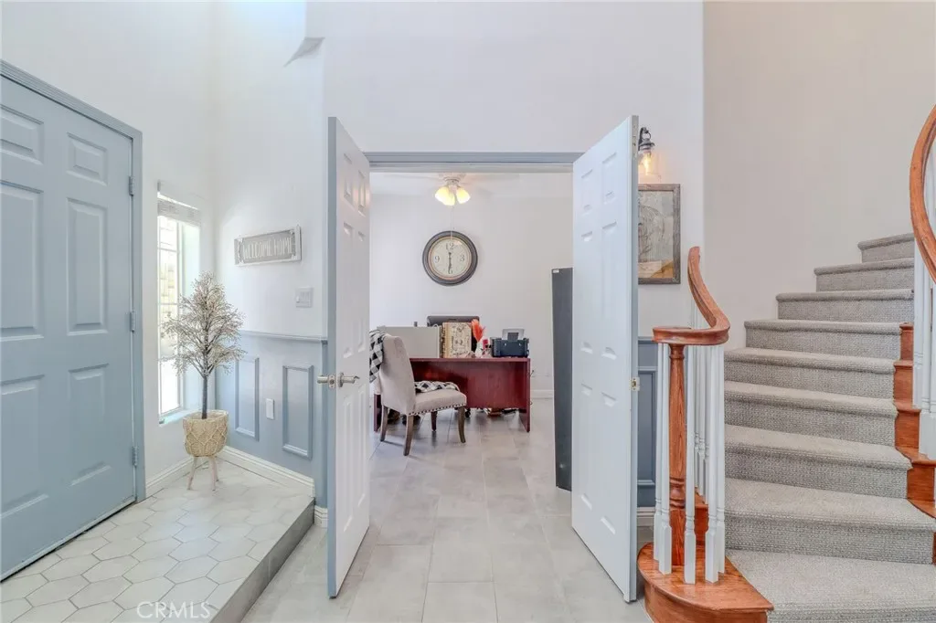 You are greeted by an elegant porch that opens to a grand entrance, soaring ceiling with celestial windows, and a striking winding staircase.