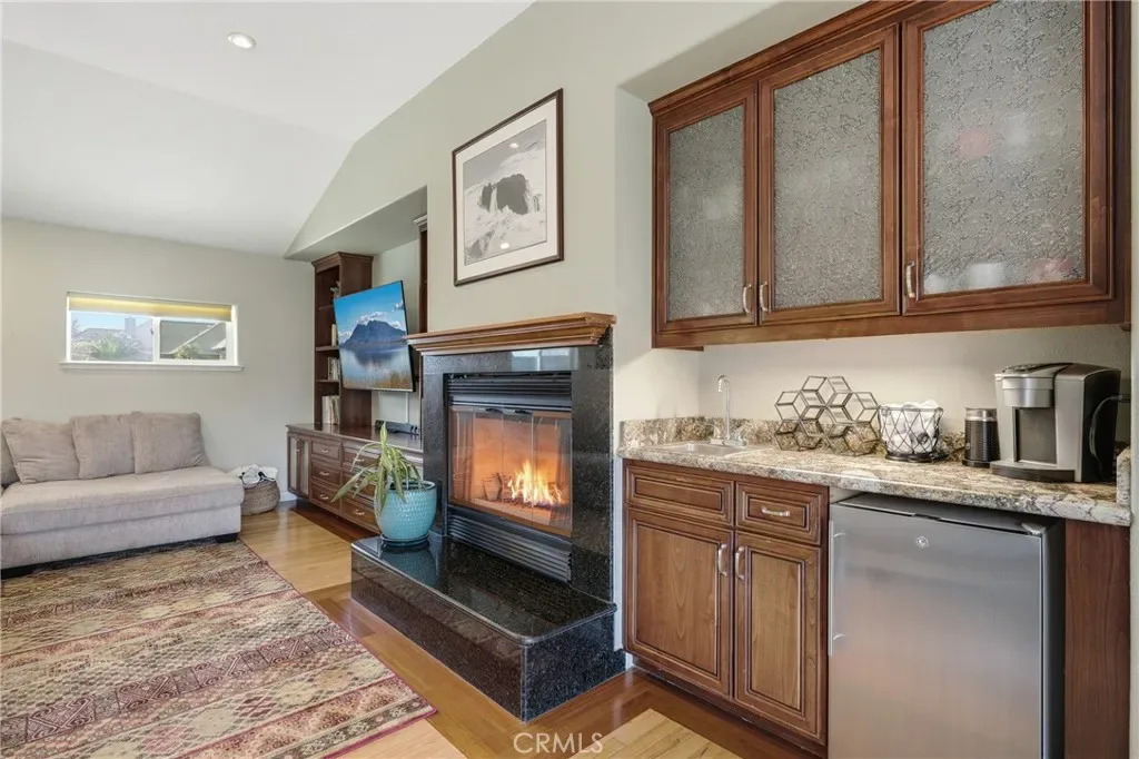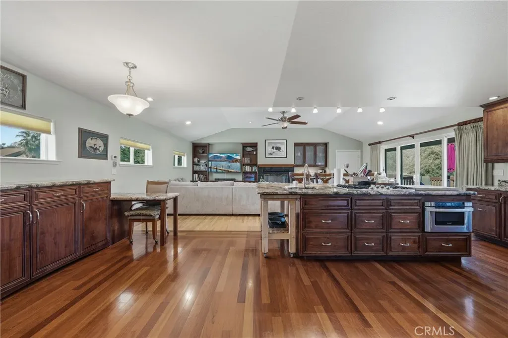 The spacious floor plan features hardwood flooring, vaulted ceilings, and a sunken living room with a marble surround gas fireplace. A formal dining room connects to the large chef’s kitchen, complete with granite slab countertops, custom cabinetry, a large island with utility sink, double ovens, propane cooktop, pantry, built-in microwave and warming tray, and a commercial-sized refrigerator/freezer. The kitchen opens to an additional living area with a built-in wet bar, beverage refrigerator, granite desk workspace, and sliding glass doors leading to a large deck overlooking the backyard.