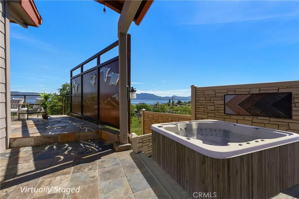 The well-designed floor plan offers a spacious primary suite positioned for beautiful sunrise views over the lake, complete with a seating area, direct access to the side yard and hot tub pad, a walk-in closet, and an oversized floor-to-ceiling tiled shower. Two guest bedrooms and a full bath are located down the hall.