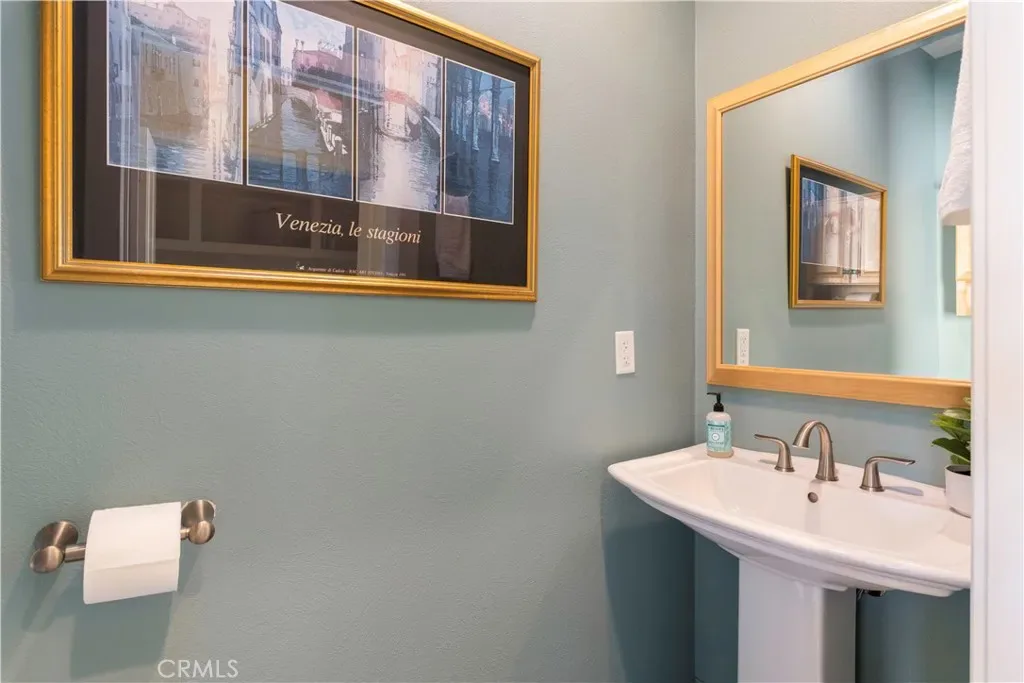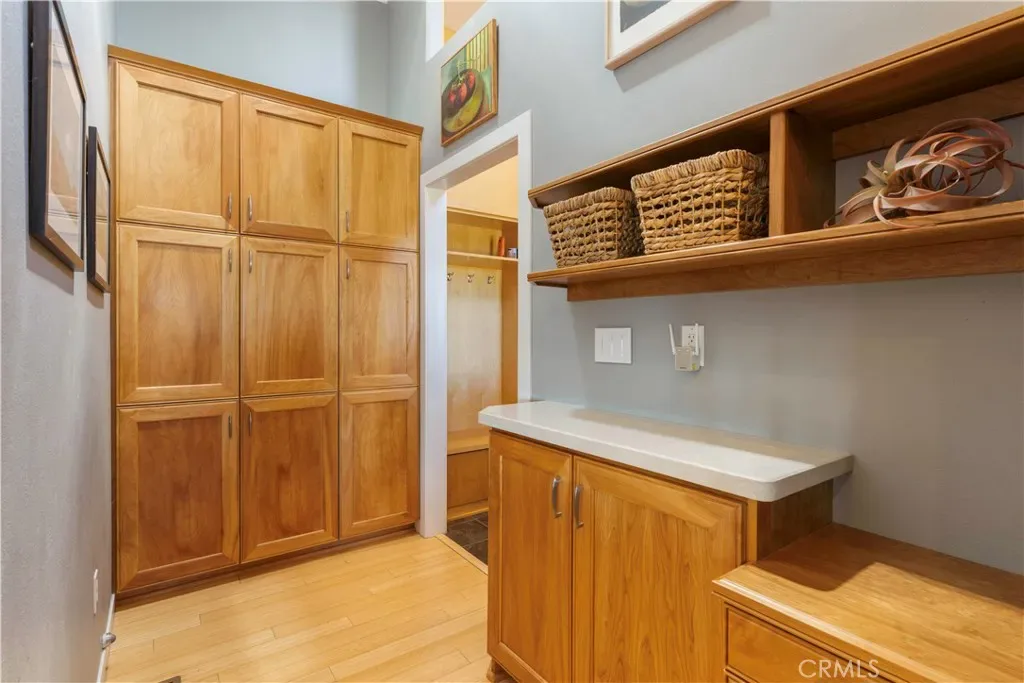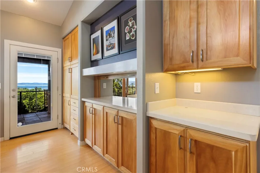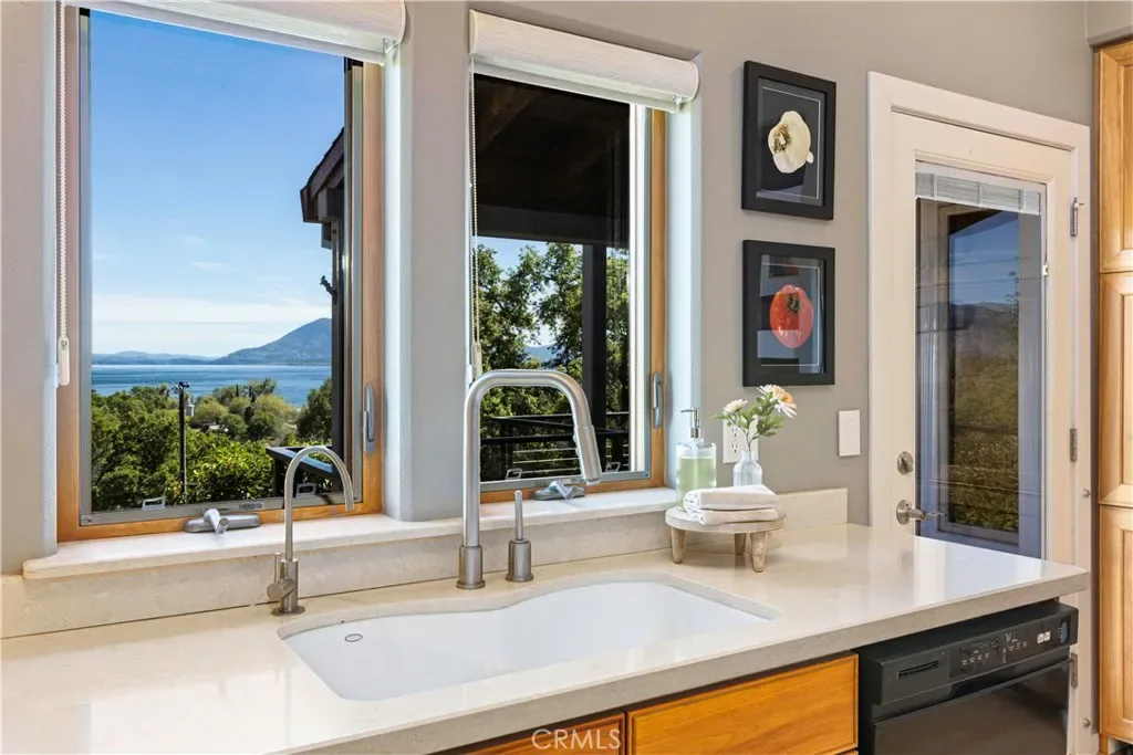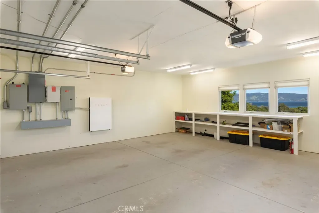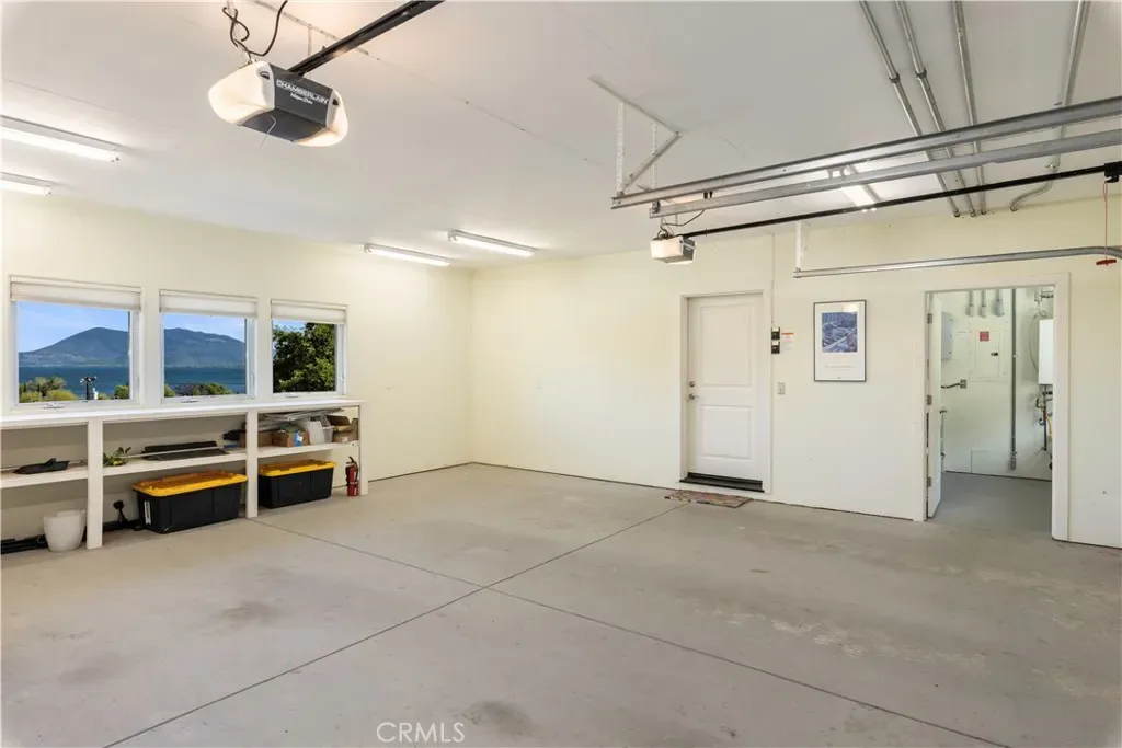 Near the garage entrance, a half bath, laundry closet, and a bonus storage room adjacent to the two-car attached garage with lake views.
