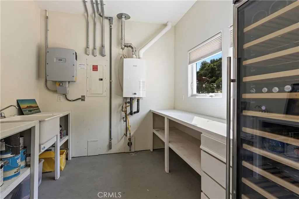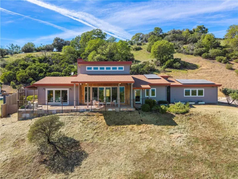 Owned solar with additional photovoltaic panels and two Tesla backup batteries provide exceptional energy efficiency and impressively low annual electric costs. The interior is finished with custom kitchen cabinetry, quartz countertops, wrought iron detailing, slate decking, and designer dimmable lighting that adds warmth throughout.