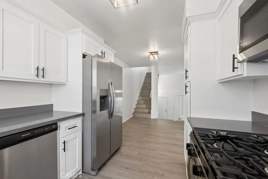 Welcome to Lakewood Village townhomes! Upon entering, you will find an inviting open living area with sliding doors that open into a private patio. A short staircase leads you up to the dining and kitchen area, which features brand new appliances, including a microwave, oven/range, dishwasher and refrigerator, along with a bedroom with bathroom and balcony. Upstairs you’ll find two bedrooms connected by a Jack and Jill bathroom. Additionally, the top level includes convenient laundry hookups with a brand new washer and dryer. From the living area, a separate staircase leads down to the attached two-car garage. This beautiful townhome has just been painted with sparkling new aplliances and is centrally located near a varity of markets, businesses and is in the ABC school district. Come see it for yourself!