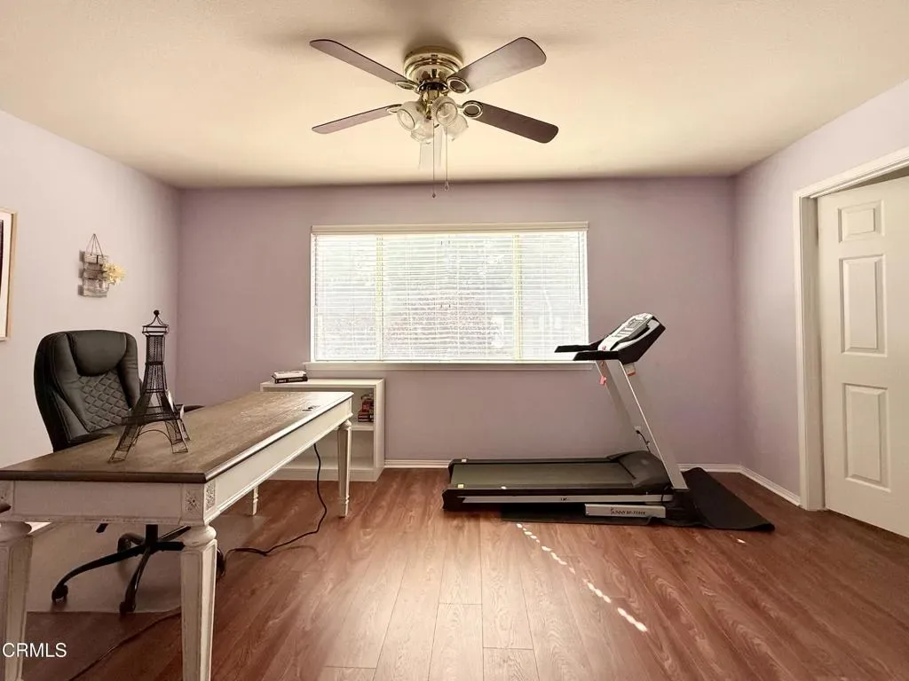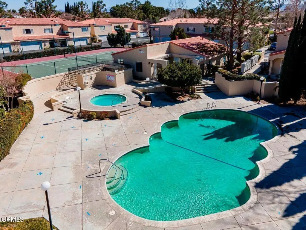 Welcome to this beautifully maintained 2-bedroom condo in the gated Marbella Villas community. Located around the corner from Antelope Valley College. This home features laminate wood flooring on the main level and newer laminate flooring upstairs as well. Both bedrooms are spacious en-suites, each with a walk-in closet, full bathroom, and ceiling fans. The inviting living room offers a cozy gas fireplace and wet bar, perfect for entertaining or unwinding at the end of the day. Step outside to your own private, gated courtyard with pavers and lush landscaping, an ideal space for morning coffee or evening relaxation.Residents of Marbella Villas enjoy a wide range of amenities, including a pool, spa, tennis court, recreation center, fitness room and playground. The HOA includes water and trash.Each unit comes with a private 2-car attached garage and upstairs laundry.